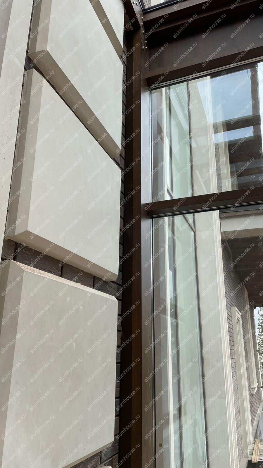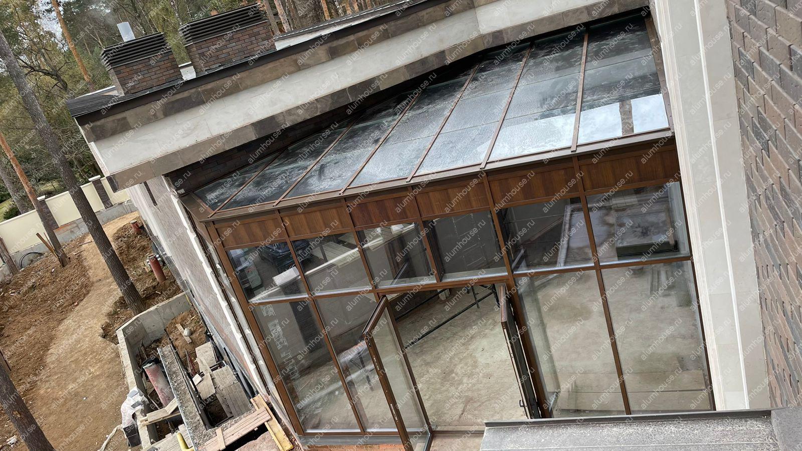Зимний сад из алюминия с декором профиля под дерево объединяет прочность металла и тёплую эстетику древесной текстуры, создавая светлое круглогодичное пространство для отдыха.