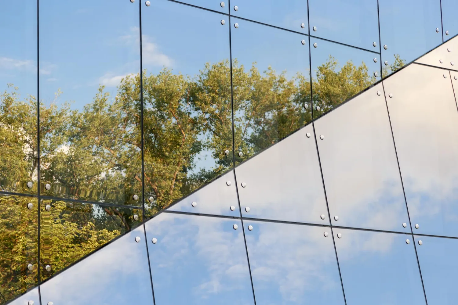 Спайдерная система светопрозрачных конструкций позволяет создавать идеально ровные зеркальные поверхности с невидимым каркасом.