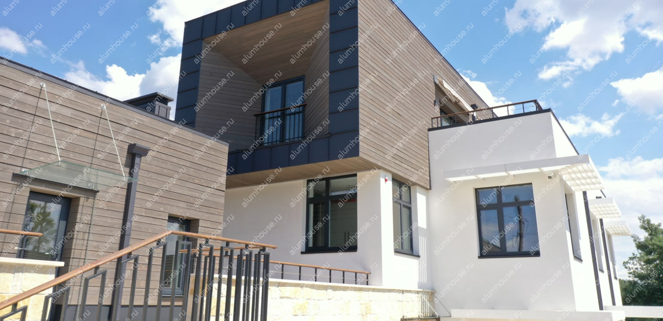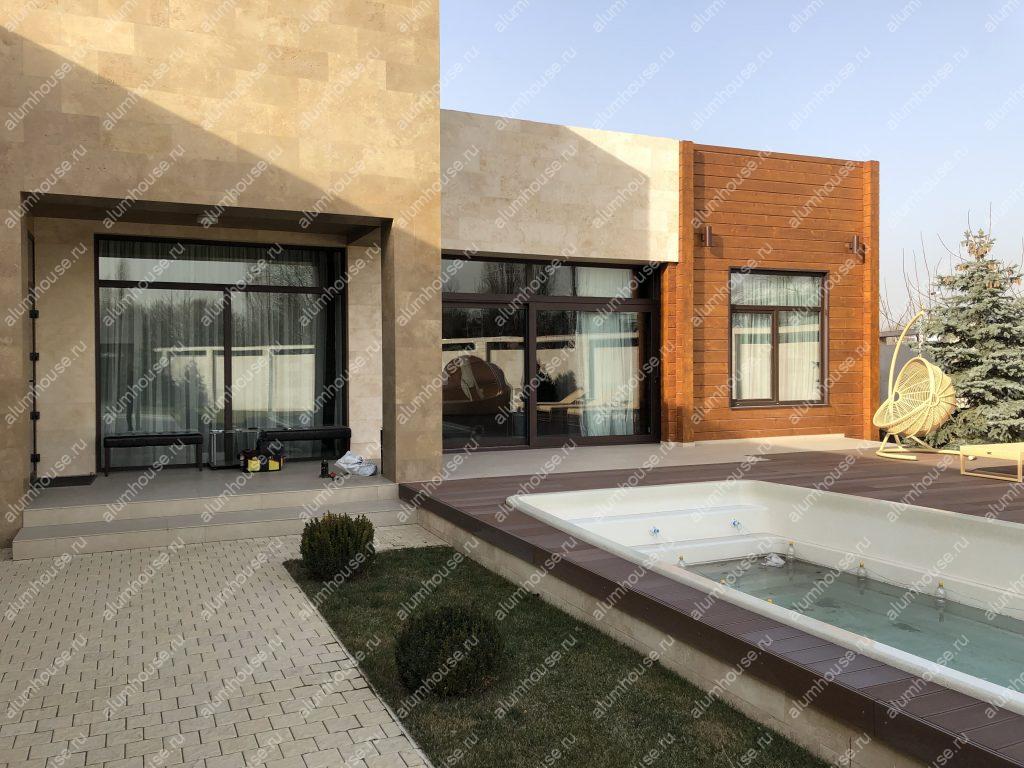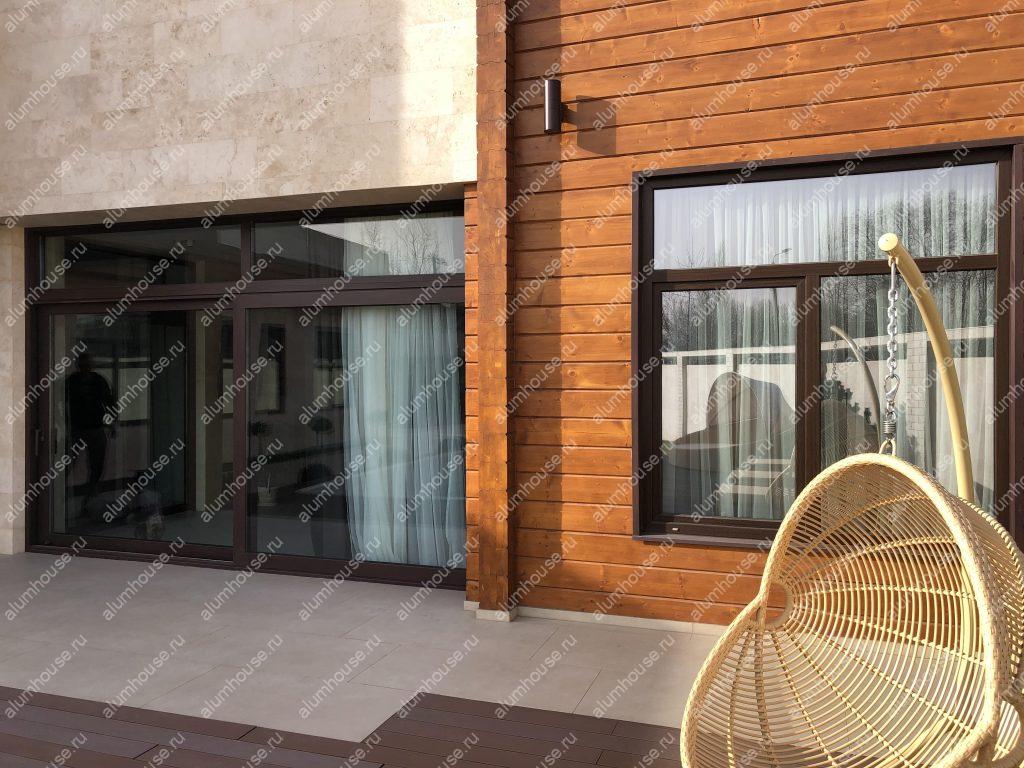 Фасадное остекление загородного дома из бруса алюминиевыми окнами и дверьми
