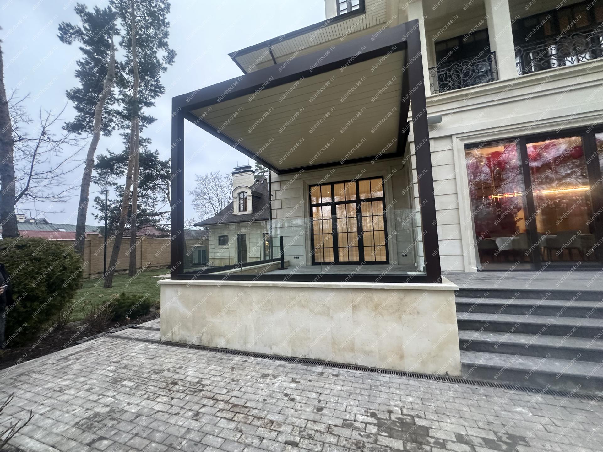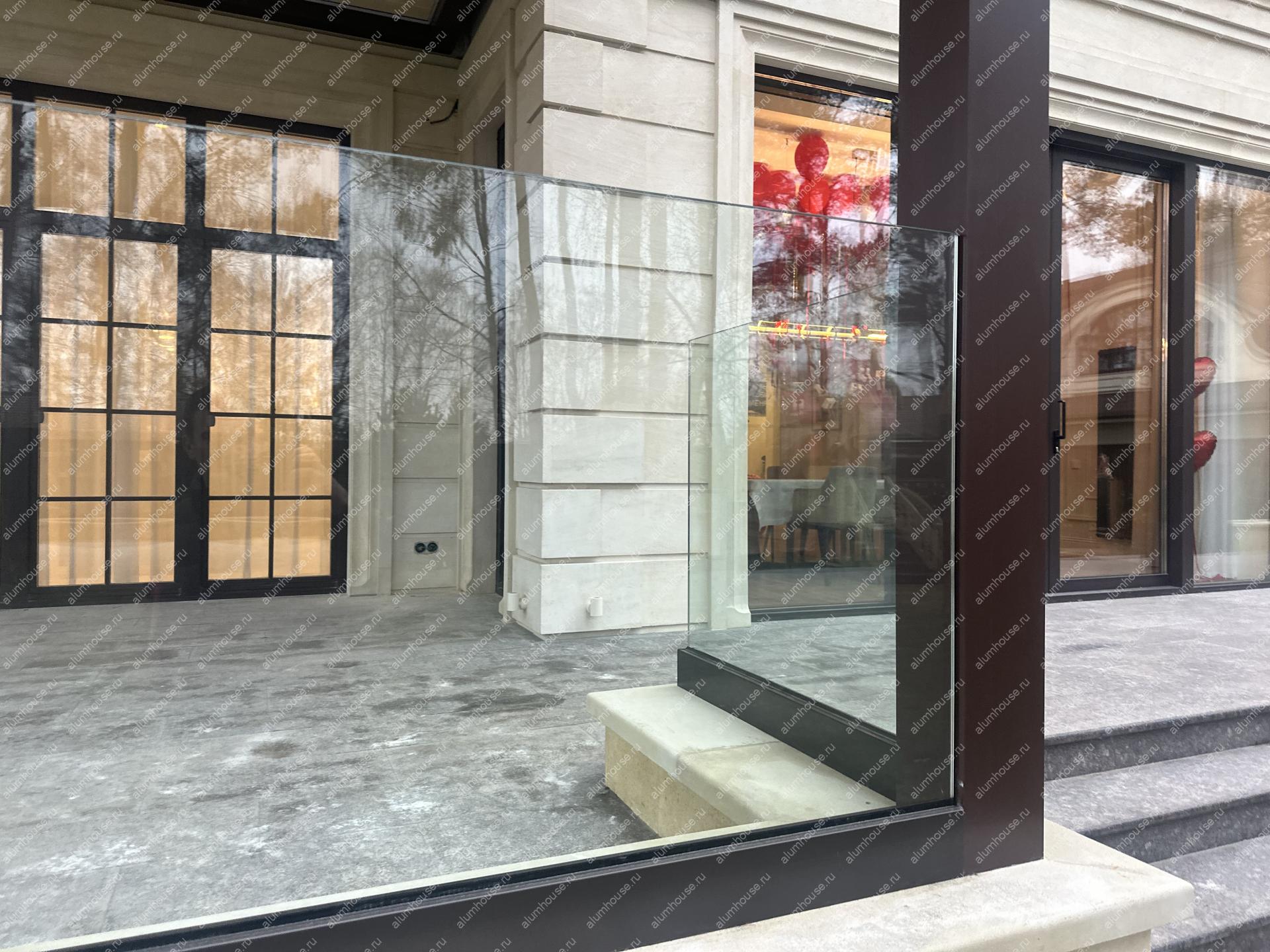 Стеклянное ограждение перголы в зажимном профиле создало безопасное, минималистичное пространство с чистой геометрией линий.