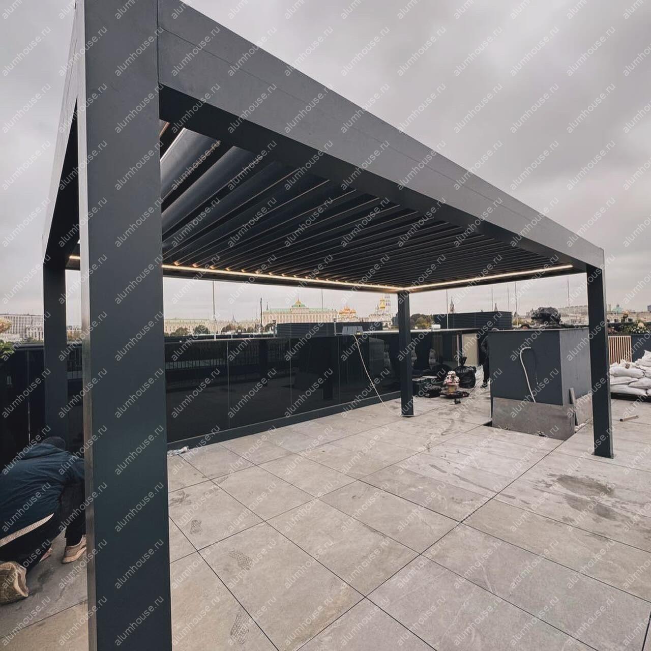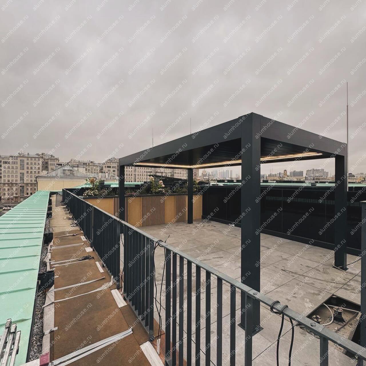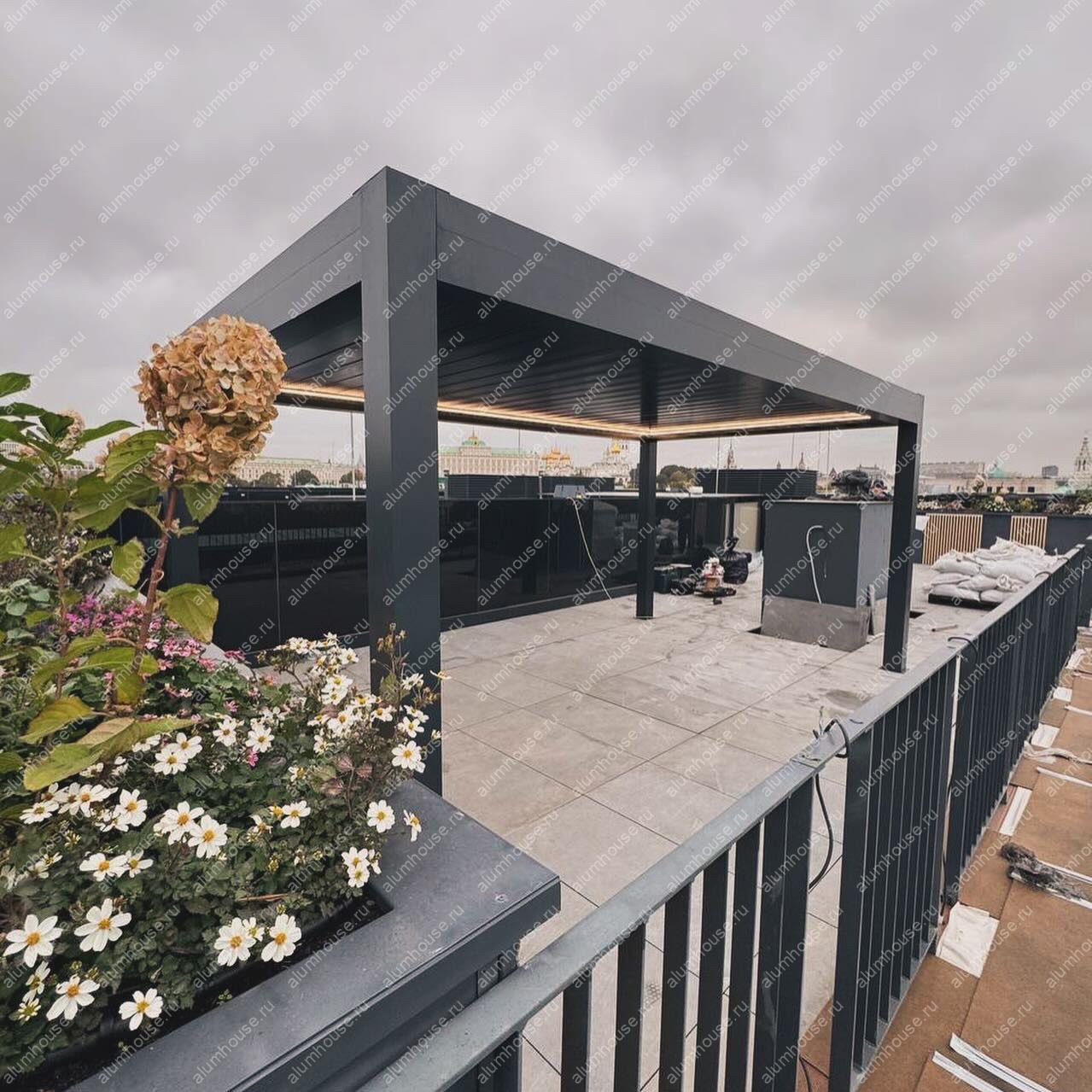 На крыше жилого дома в Москве установлена современная алюминиевая пергола Bioclimatica с автоматическими поворотными ламелями от производителя Markiza. Такая система представляет собой стационарную кровельную конструкцию с алюминиевым каркасом, где в качестве перекрытия используются специальные ламели, автоматически вращающиеся вокруг своей оси для точной регулировки света, тени и вентиляции в любой момент суток.