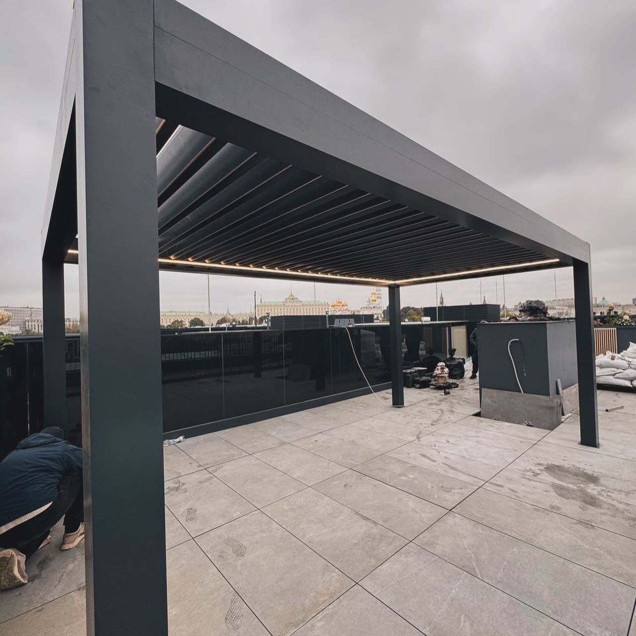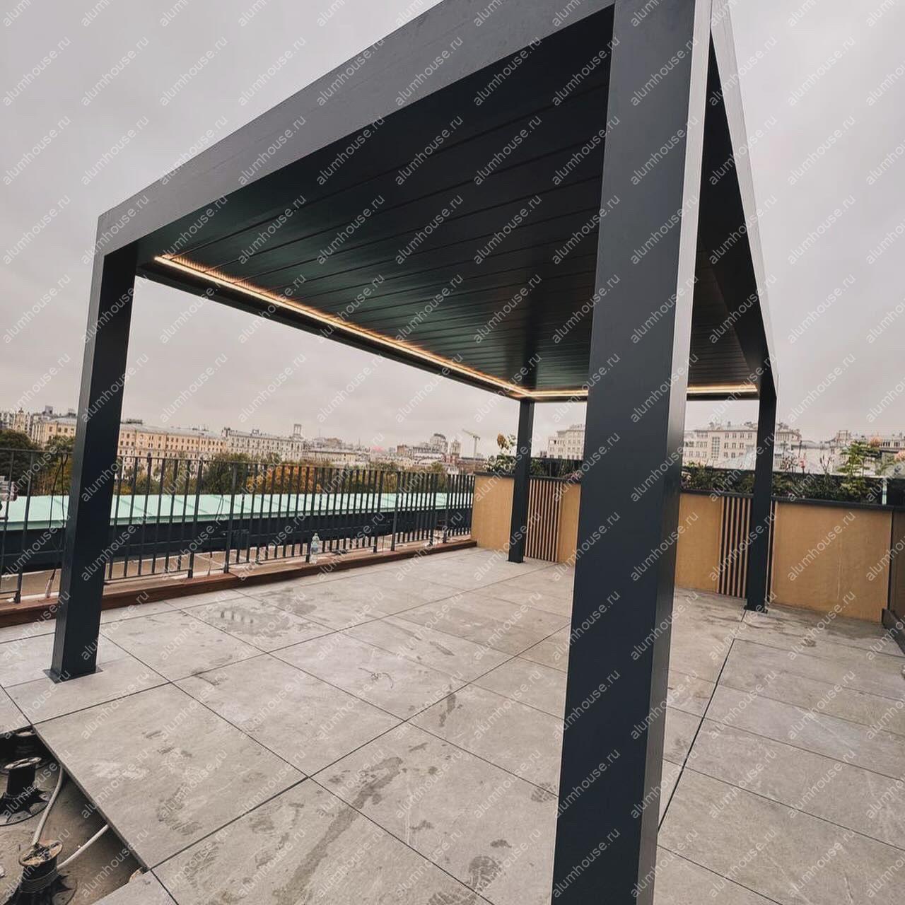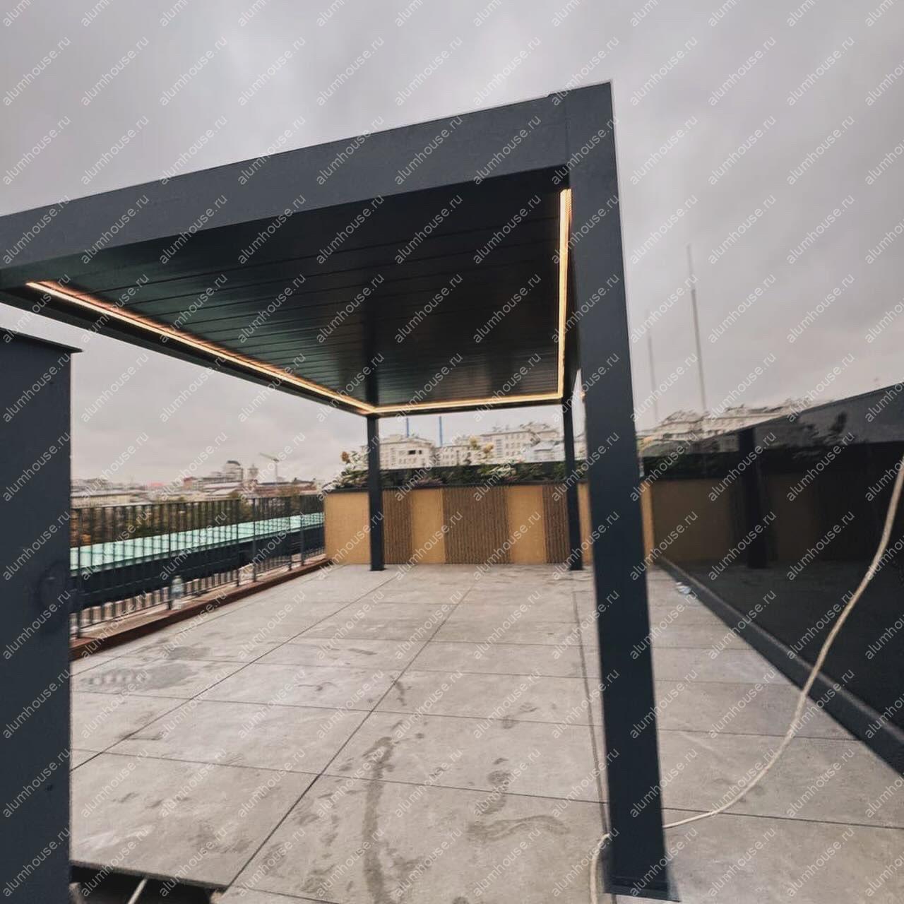 На крыше жилого дома в Москве установлена современная алюминиевая пергола Bioclimatica с автоматическими поворотными ламелями от производителя Markiza. Такая система представляет собой стационарную кровельную конструкцию с алюминиевым каркасом, где в качестве перекрытия используются специальные ламели, автоматически вращающиеся вокруг своей оси для точной регулировки света, тени и вентиляции в любой момент суток.