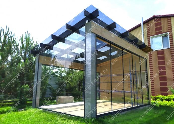 Для изготовления использовались алюминиевые профильные системы и закалённое или ламинированное стекло, выдерживающее значительные нагрузки и обеспечивающее длительный срок службы всей конструкции. Применение алюминия в качестве каркаса гарантирует прочность, коррозионную стойкость, лёгкость монтажа и минимальные требования к уходу. Стеклянная крыша обеспечивает не только защиту и панорамный обзор, но и отличную тепло- и шумоизоляцию, благодаря чему внутри беседки даже в пасмурные или холодные дни сохраняется уютная атмосфера.