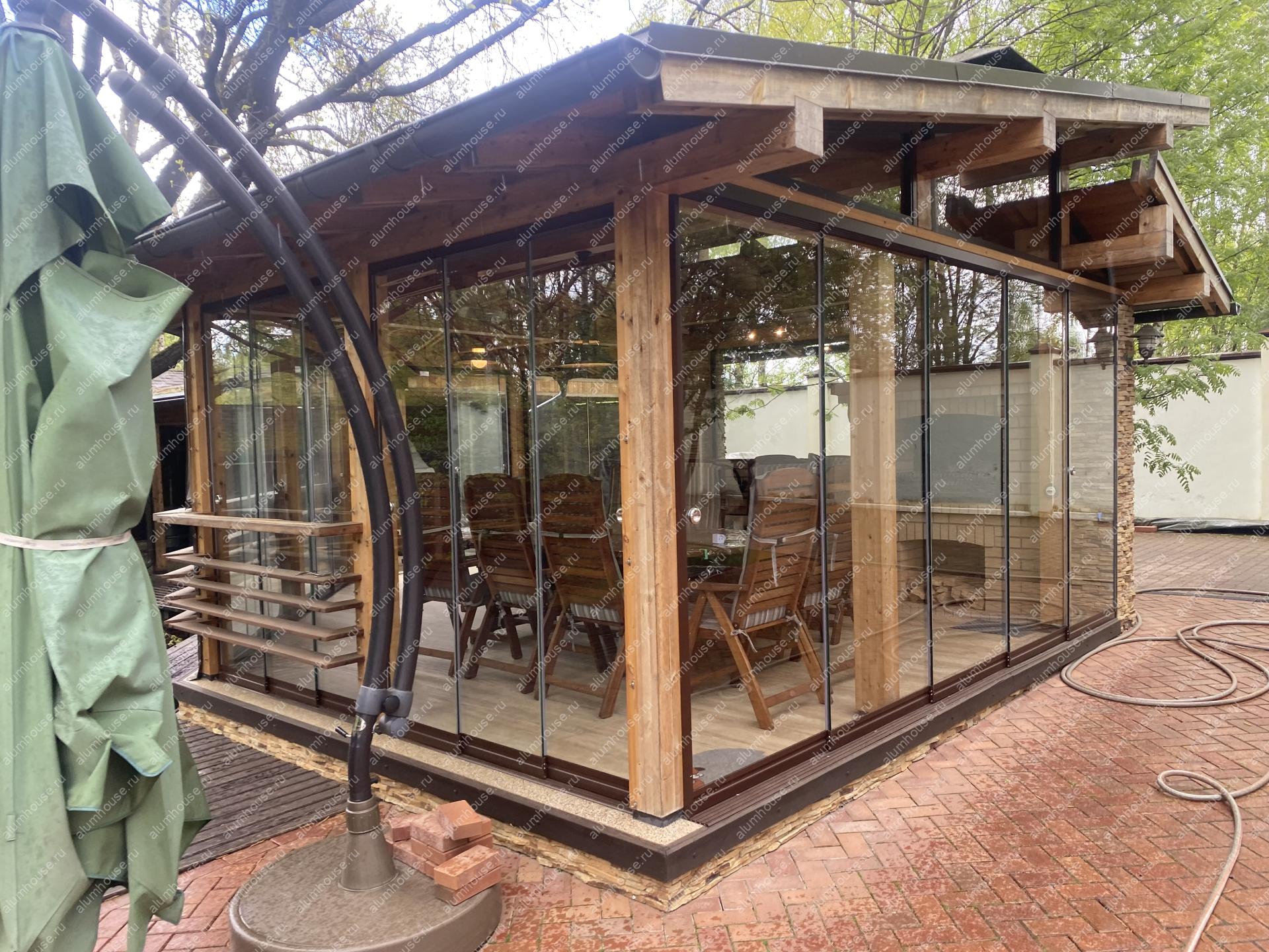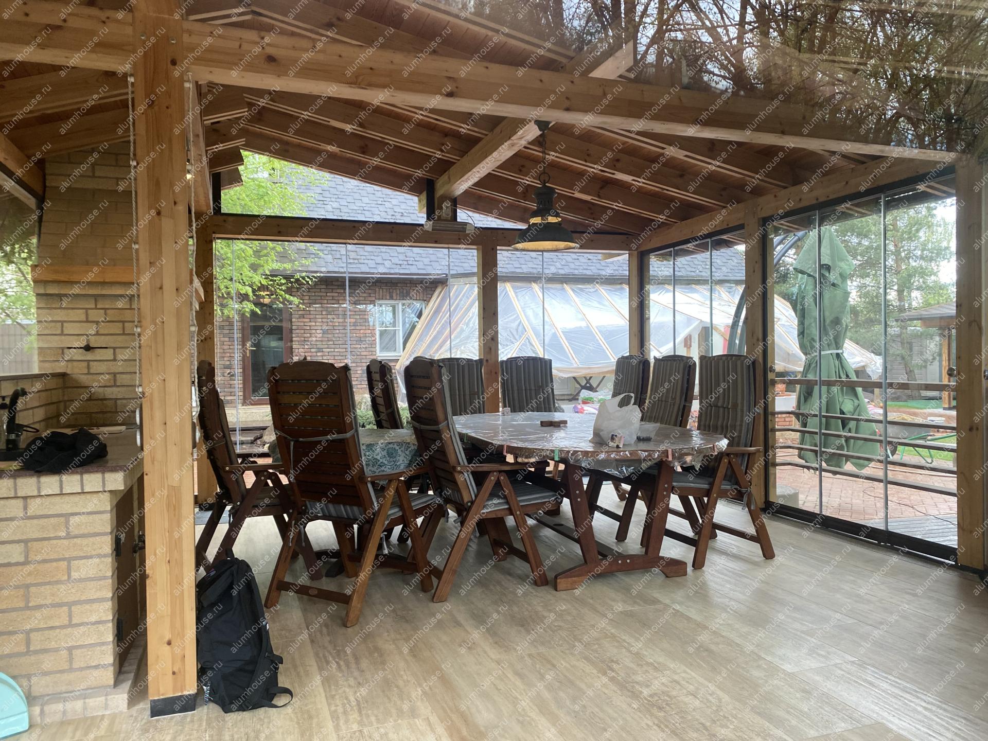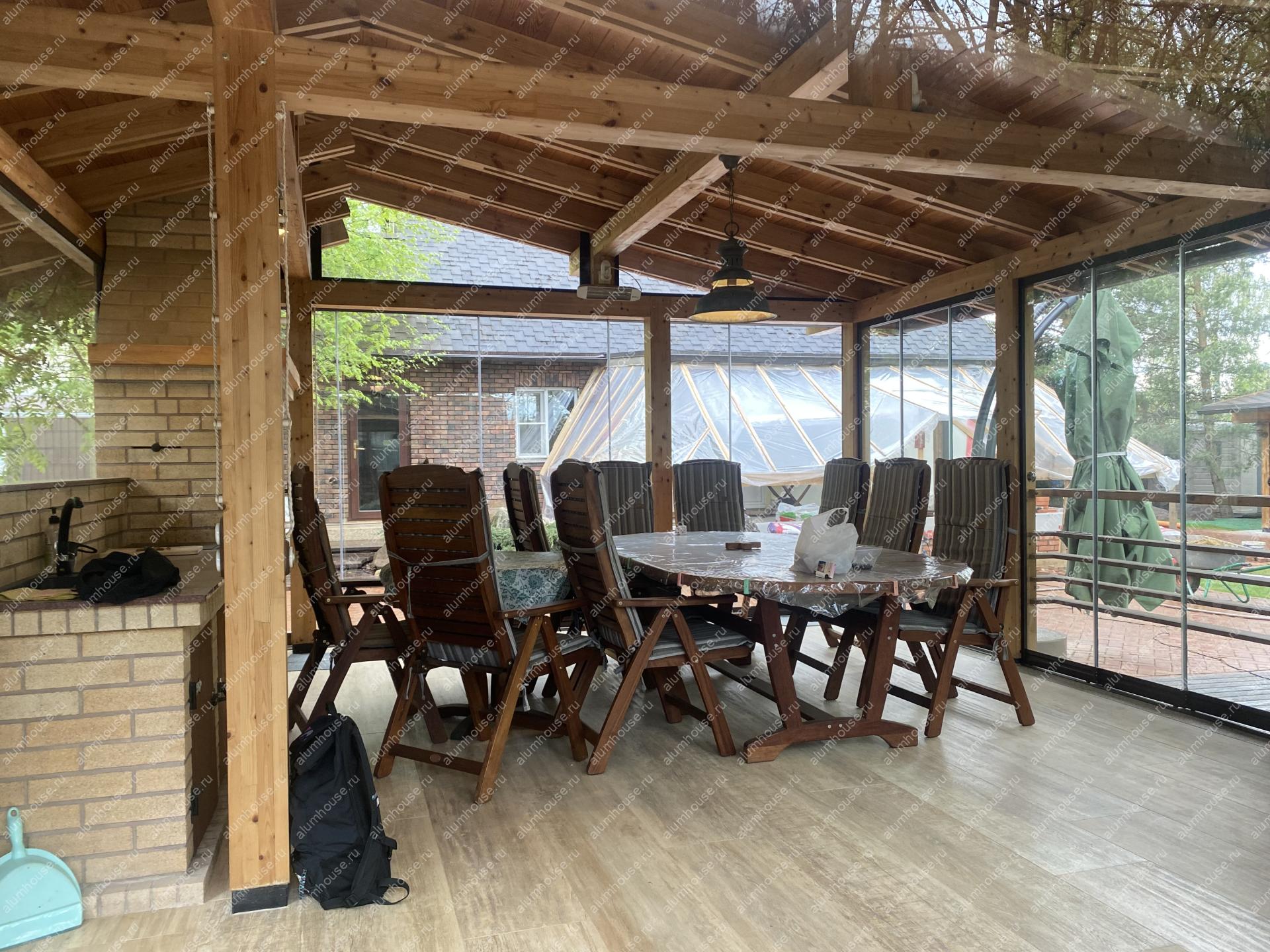 Для беседки из клееного бруса была выполнена установка безрамного остекления, благодаря чему удалось подчеркнуть естественную красоту древесины и добавить конструкции воздушности и прозрачности. Такое сочетание современных стеклянных панелей и натурального дерева создаёт уникальный визуальный эффект, делая пространство максимально светлым и открытым.