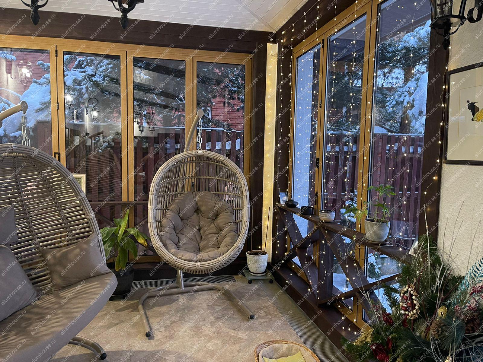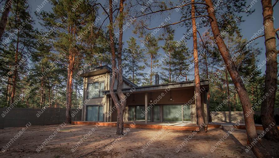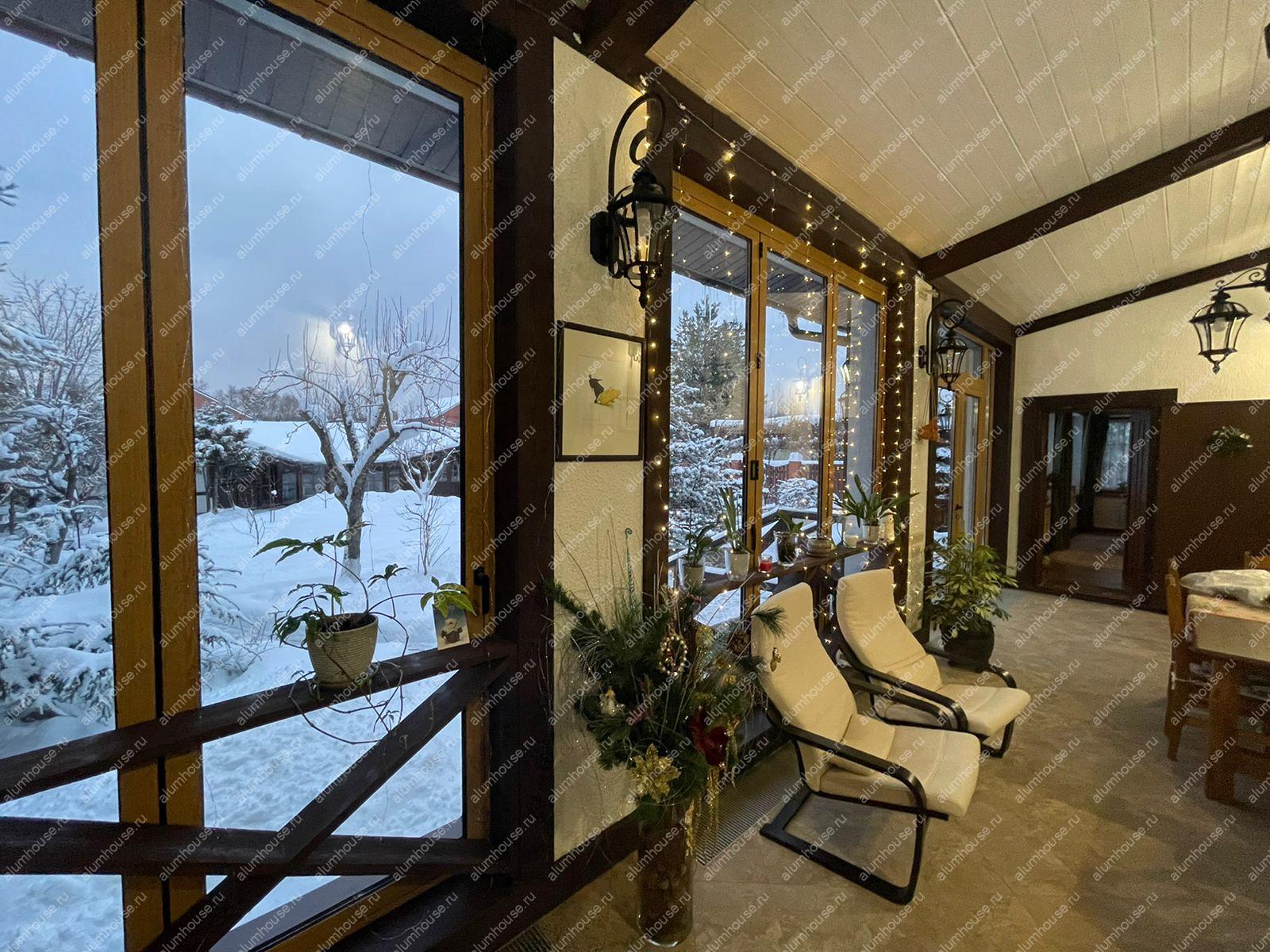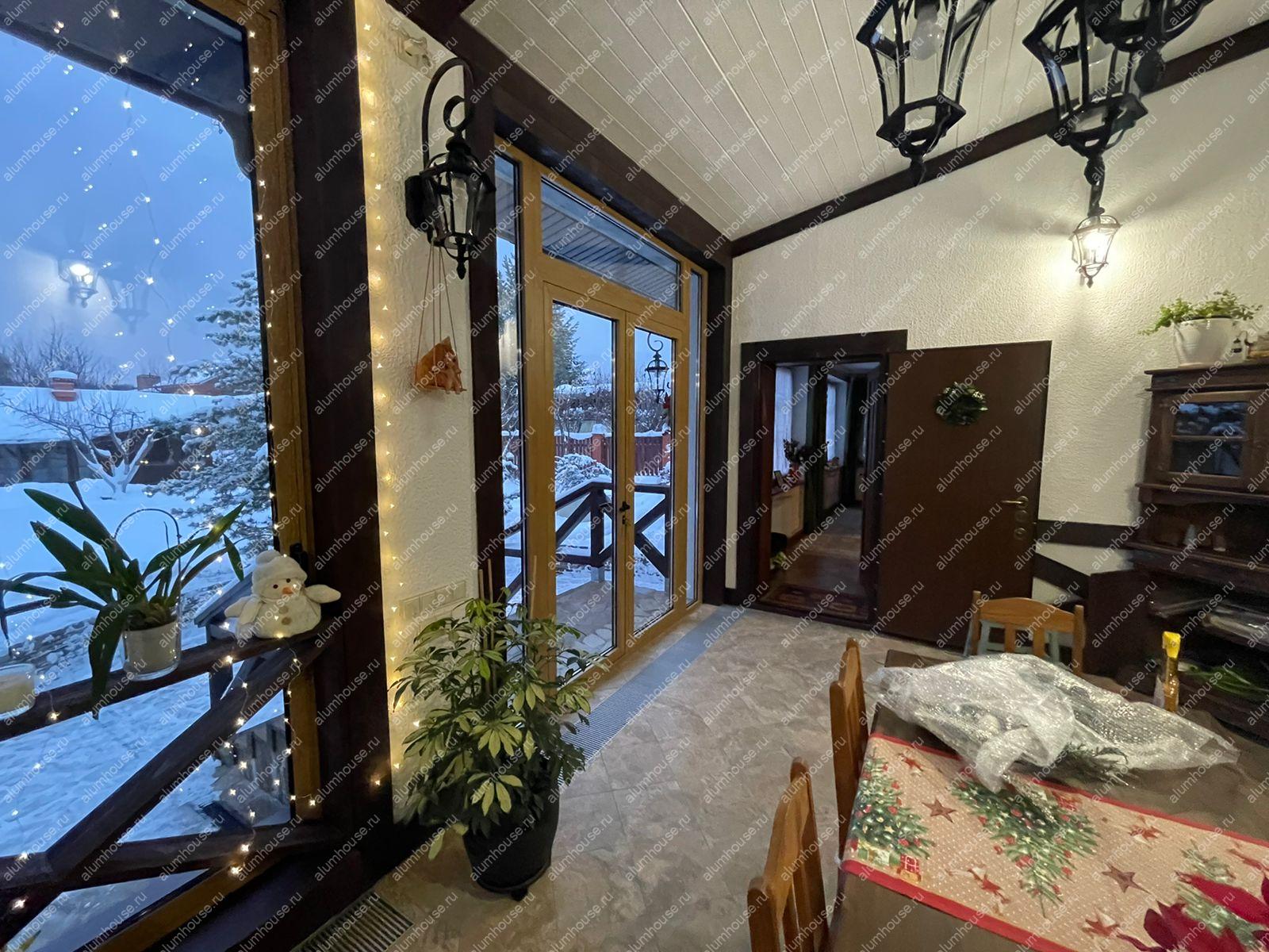 - Эстетичный вид. Фасадное остекление дома алюминиевыми окнами и дверьми придаёт ему современный и стильный вид, сохраняя при этом тепло и уют деревянного дома.