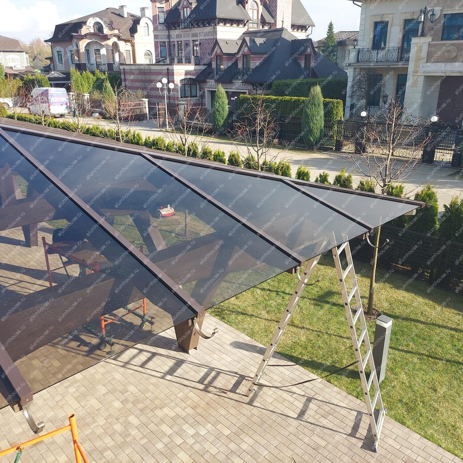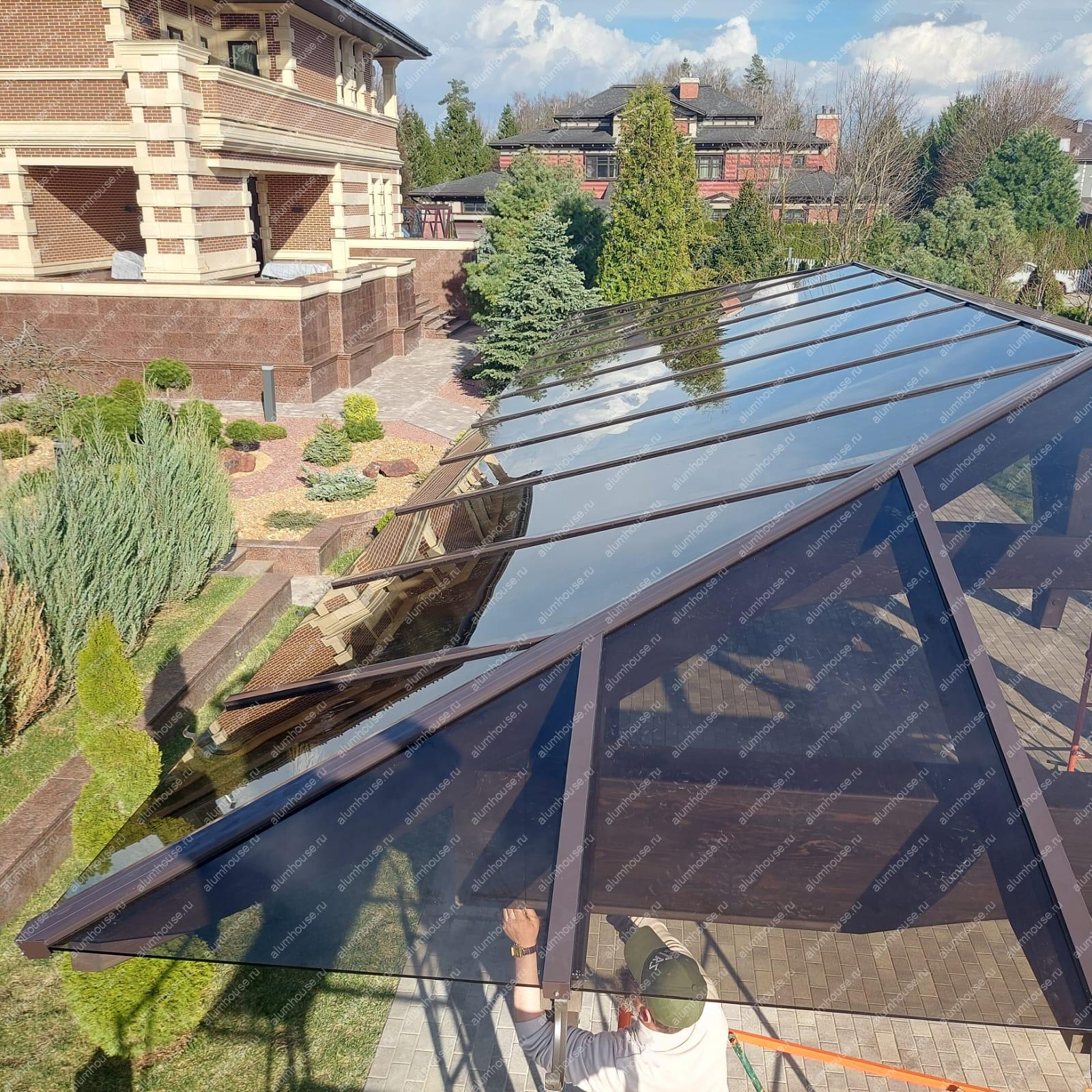 Остекление навеса по готовому каркасу выполнено закалённым триплексом с аккуратными прижимными профилями, обеспечивая лёгкий вид, защиту от непогоды и долговечность.