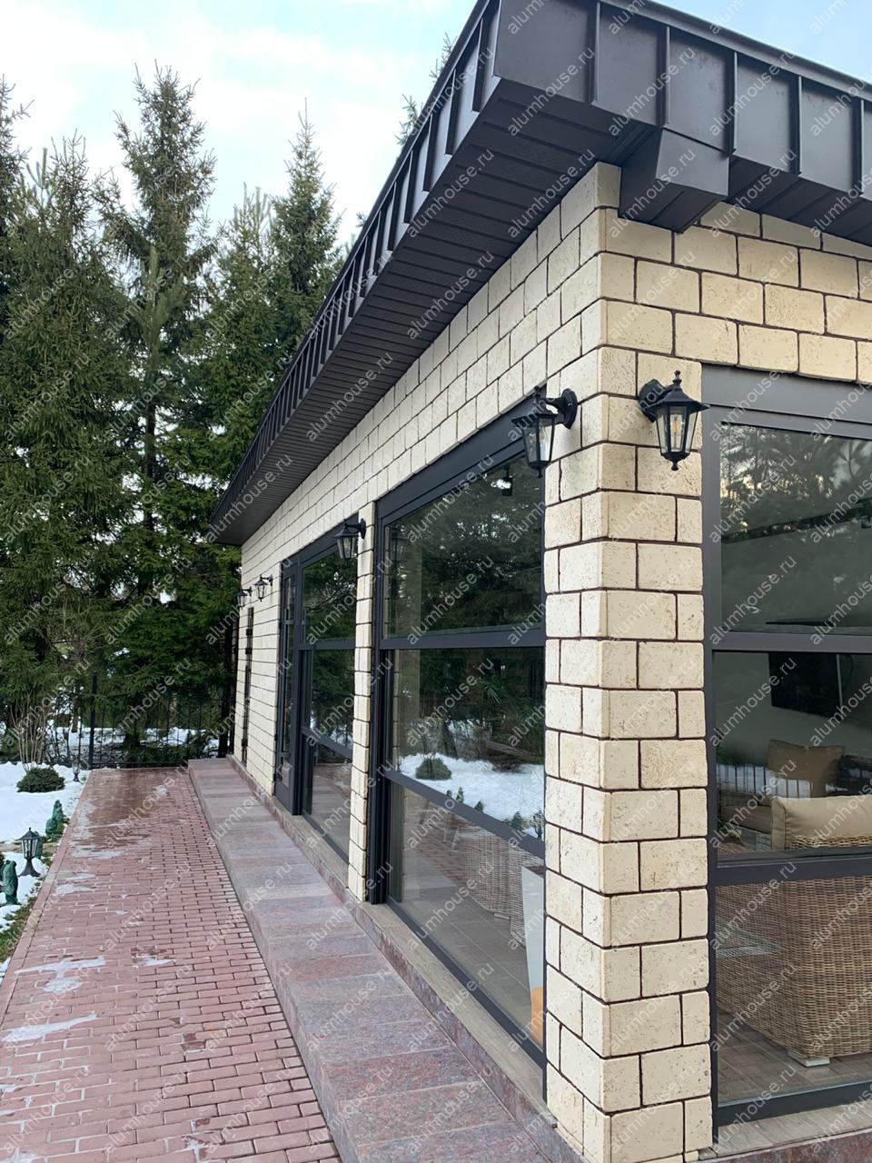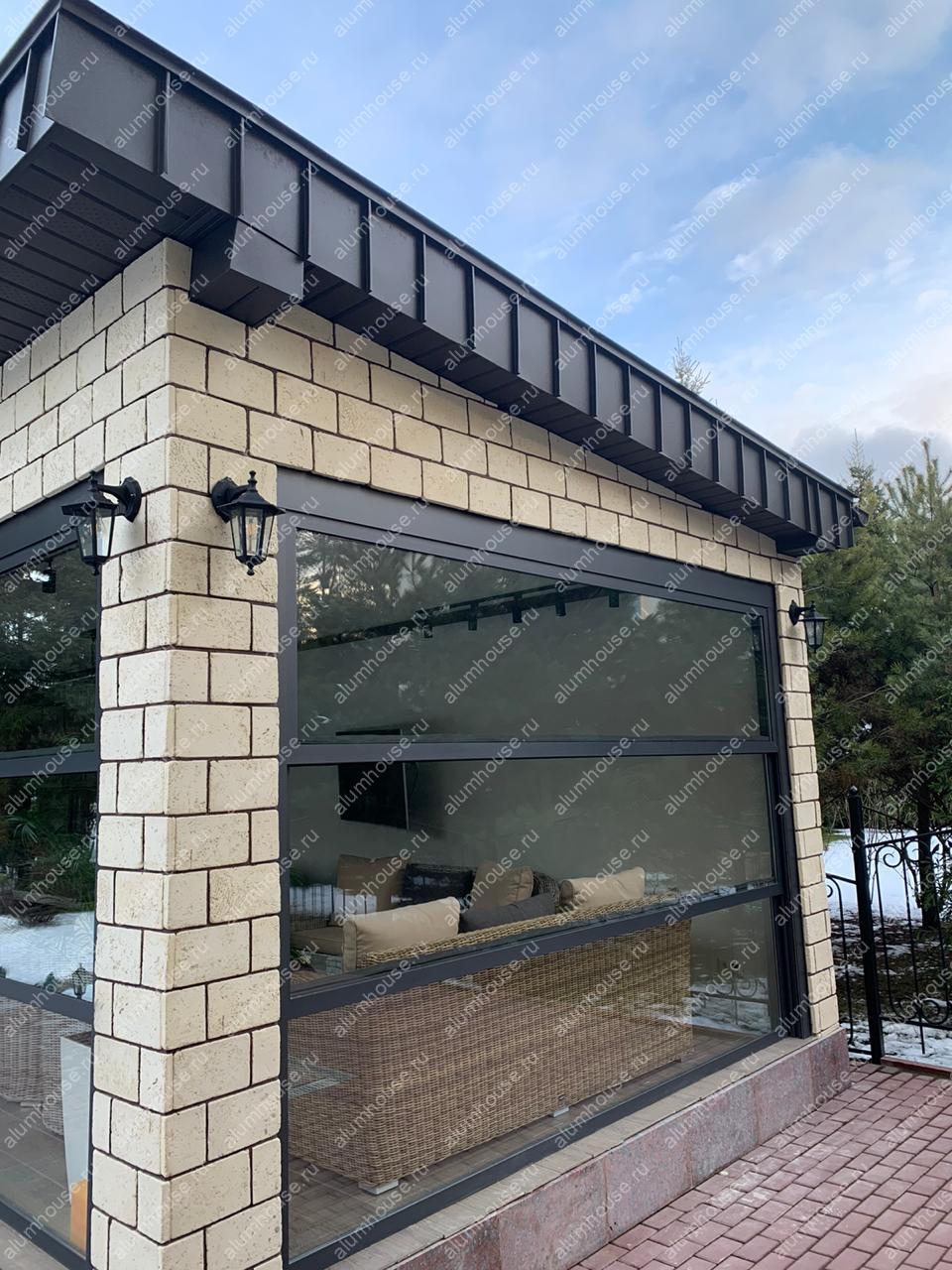 Главное преимущество гильотинной системы — возможность частично или полностью открыть проёмы одним нажатием кнопки, не занимая дополнительного пространства и не ограничивая расстановку мебели. Алюминиевый профиль с полимерным покрытием гарантирует долговечность и современный внешний вид конструкции. Благодаря такому подходу беседка становится комфортной для отдыха в любое время года, а её внешний облик приобретает стильную архитектурную выразительность.
