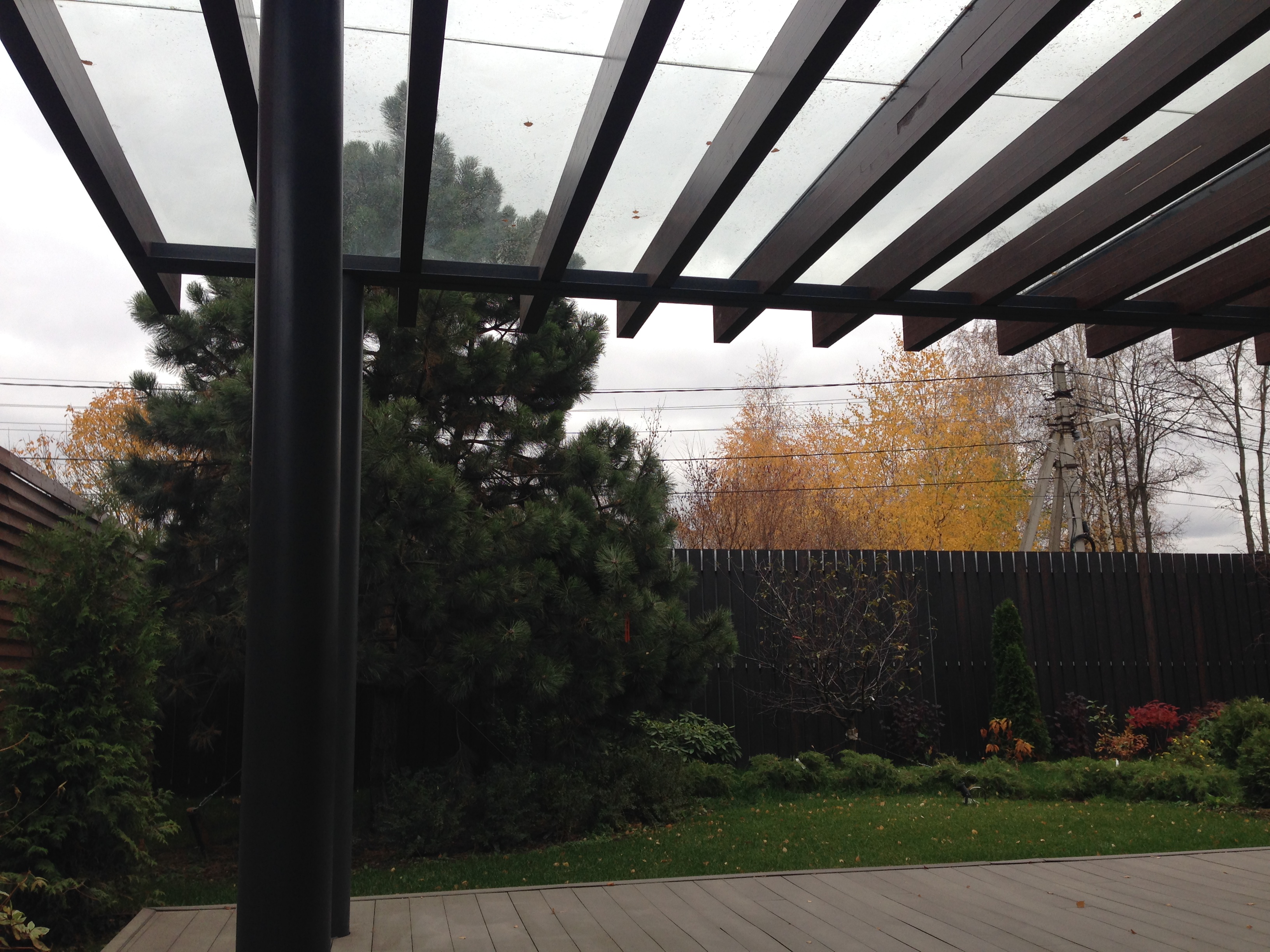 Остекление деревянно-металлического навеса сделает большую часть вашего открытого пространства полезной в течение всего года. Навес обеспечивает защиту от снега, дождя и ветра.