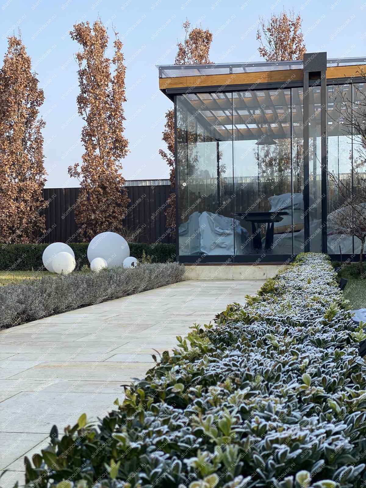 Лёгкое остекление беседки выполнено с применением алюминиевых профильных систем и прозрачных стеклянных панелей, что позволило создать светлое и защищённое пространство для отдыха на свежем воздухе. Такой вариант обеспечивает защиту от ветра, дождя и пыли, сохраняя при этом максимальное естественное освещение и панорамный обзор участка.