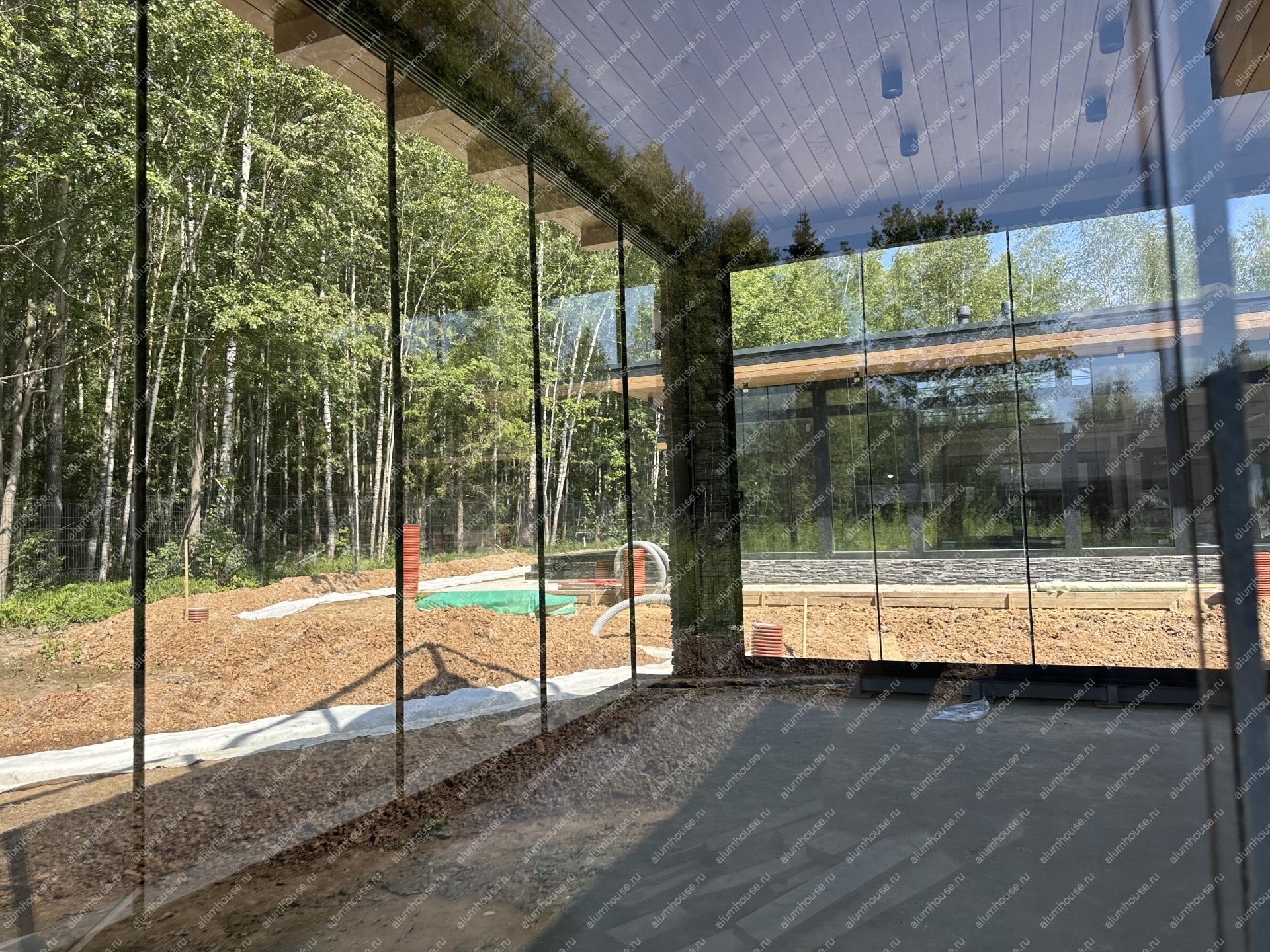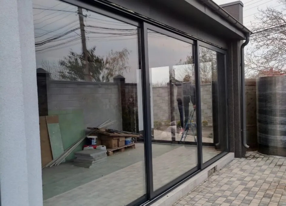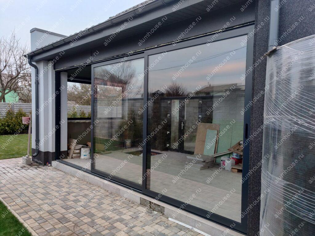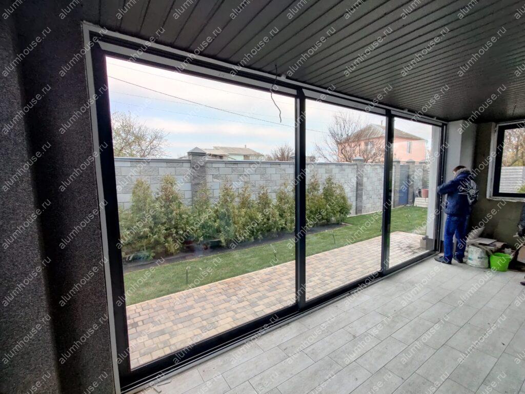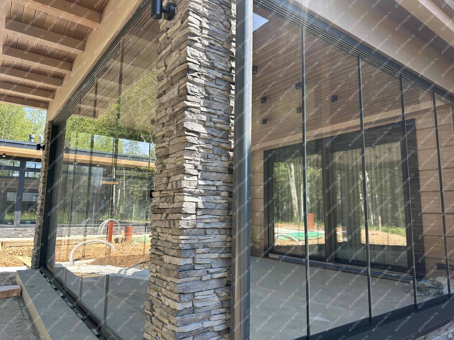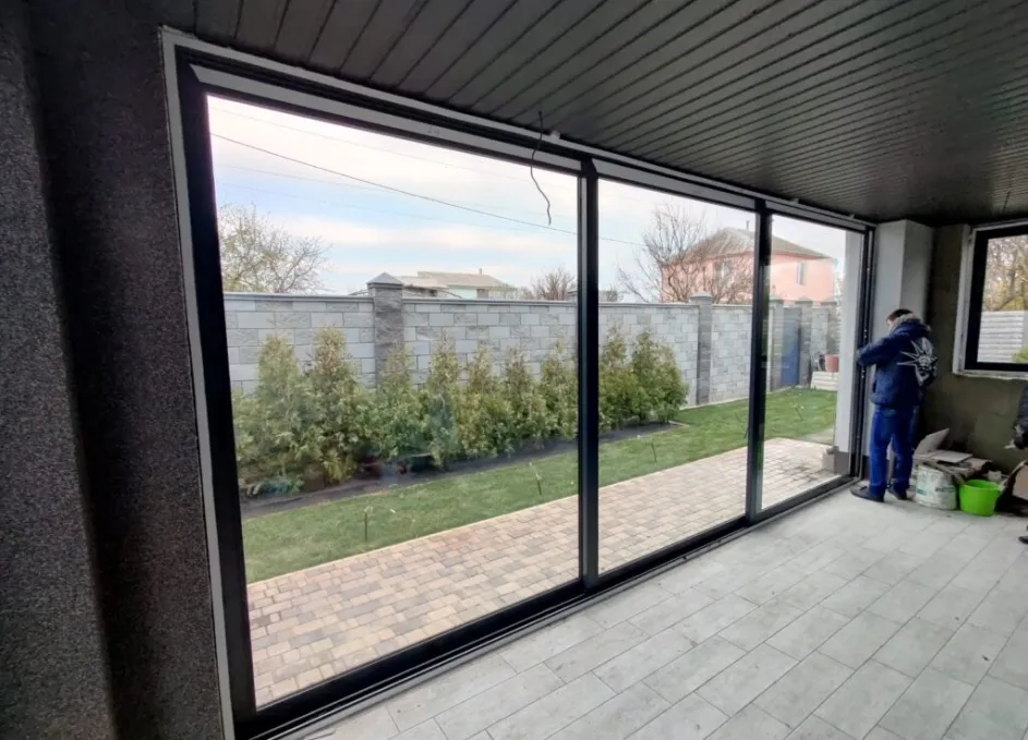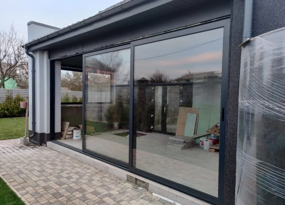 Монтаж начался с консультации и выезда на объект для замеров, после чего был разработан индивидуальный проект с учётом архитектуры участка. Алюминиевые профили с терморазрывом и многокамерные стеклопакеты были изготовлены по размерам проёмов, что гарантирует герметичность и долговечность конструкции. Раздвижные створки легко перемещаются по направляющим, не занимая дополнительного пространства, а система позволяет открывать значительную часть проёма для проветривания или свободного прохода.
