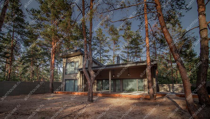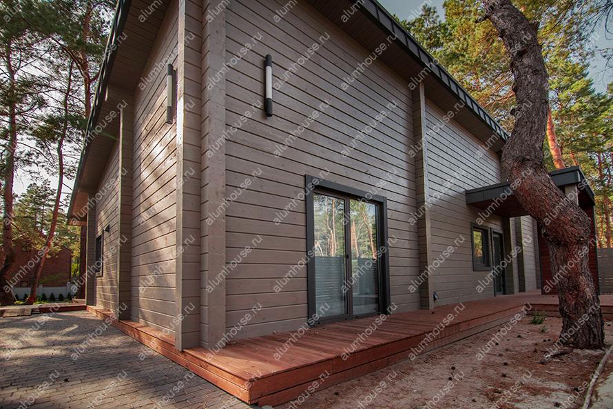 Фасадное остекление загородного дома из бруса алюминиевыми окнами и дверьми
