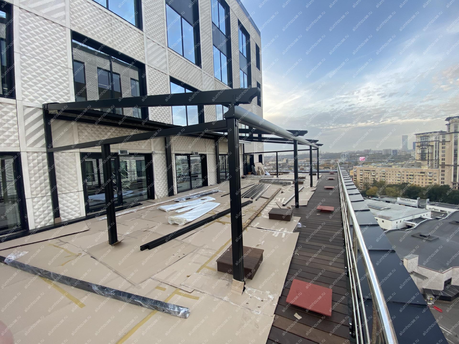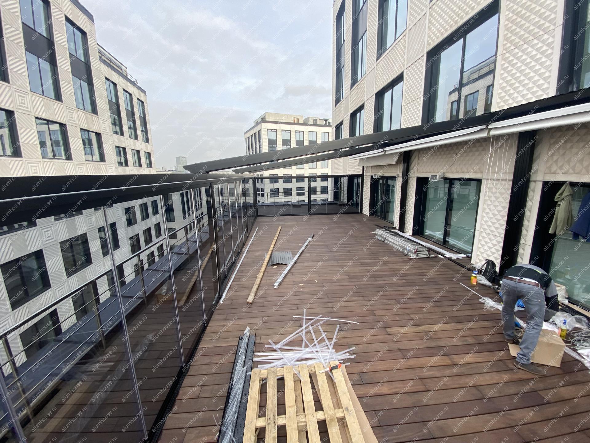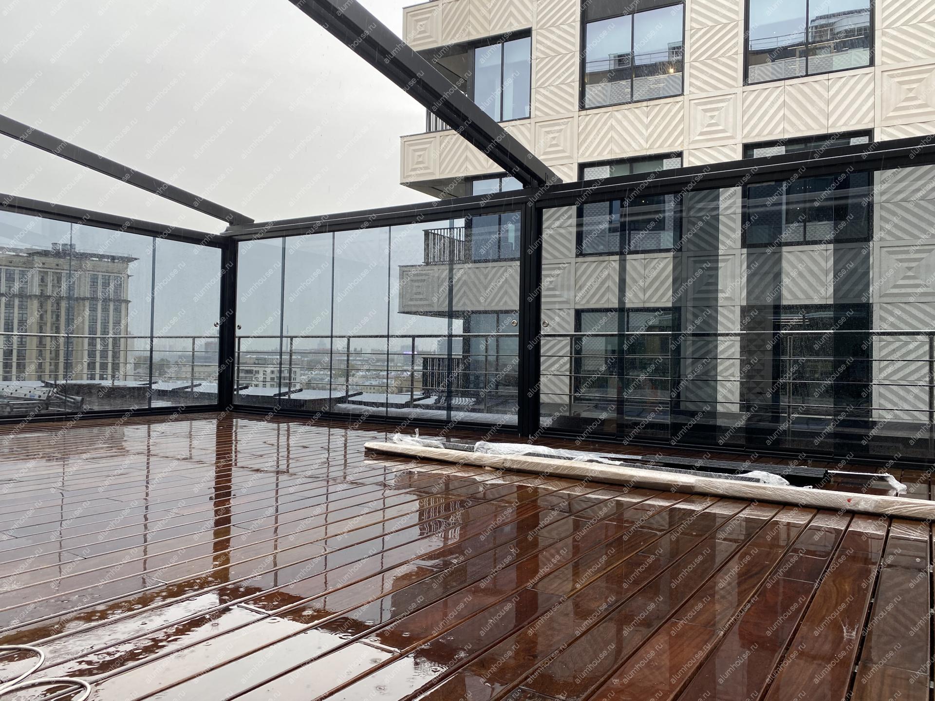 Панорамное рельсовое остекление защищает внутреннее пространство веранды от дождя, ветра, снега и пыли, а используемые закалённые или энергосберегающие стеклопакеты обеспечивают дополнительную теплоизоляцию. Герметичная система не только надёжна и безопасна, но и подчёркивает современный стиль фасада, визуально расширяя помещение.