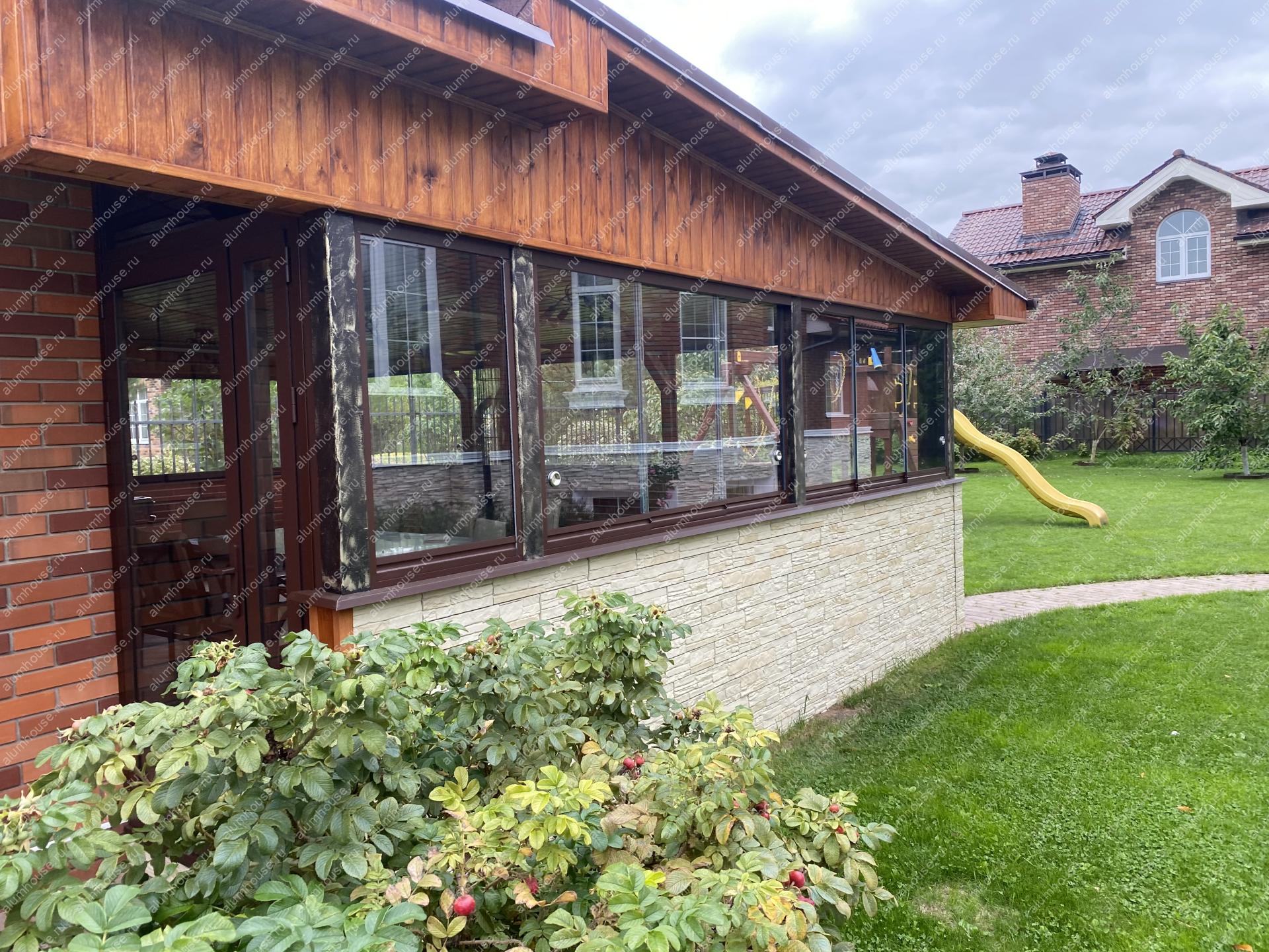 В загородном доме выполнено раздвижное безрамное остекление беседки, что позволило создать светлое и защищённое пространство для отдыха с панорамным обзором и ощущением открытости. Использовались современные раздвижные системы, в которых стеклянные полотна двигаются по алюминиевым направляющим без вертикальных рам, что обеспечивает цельный вид и максимальное проникновение естественного света.