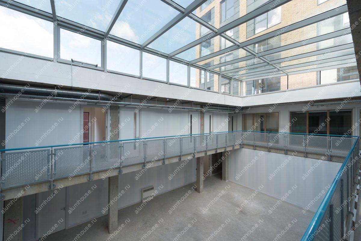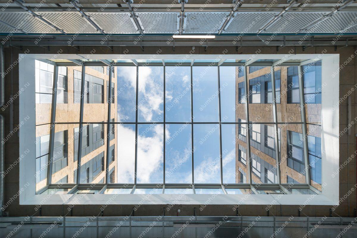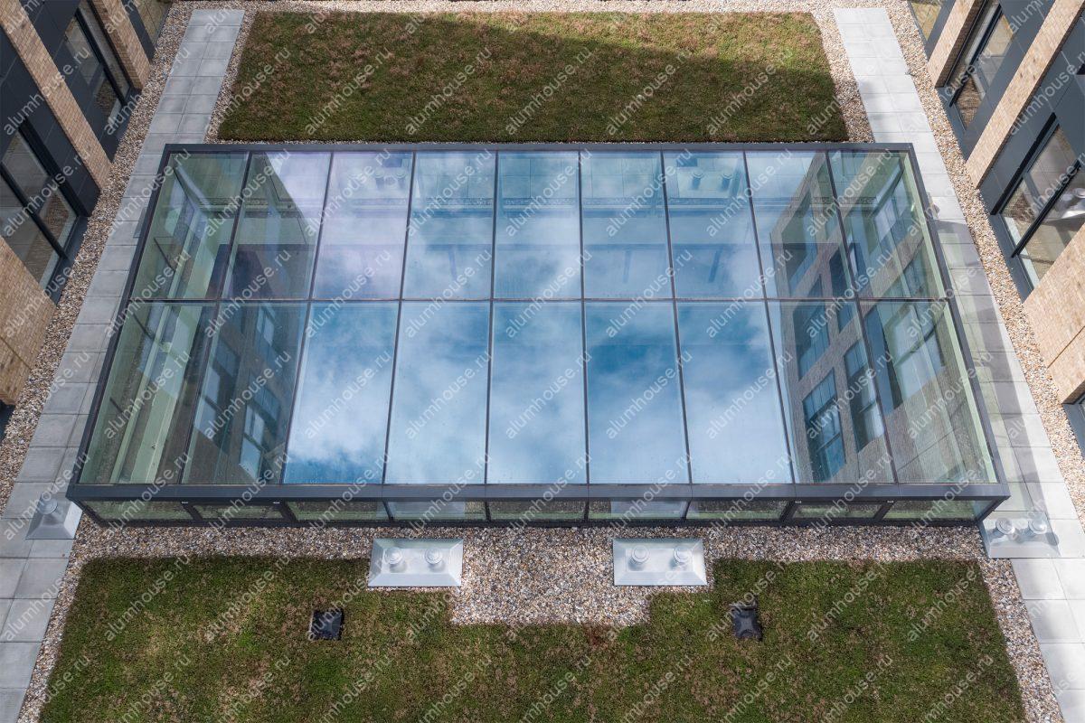 Выполнена установка стеклянной кровли с использованием алюминиевого профильного каркаса, что позволило создать современное, светопрозрачное и долговечное перекрытие. Алюминий выбран в качестве основного конструктивного материала благодаря его лёгкости, высокой прочности, устойчивости к коррозии и возможности создавать конфигурации разной сложности, включая криволинейные и панорамные формы.