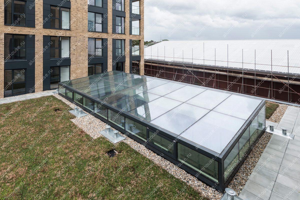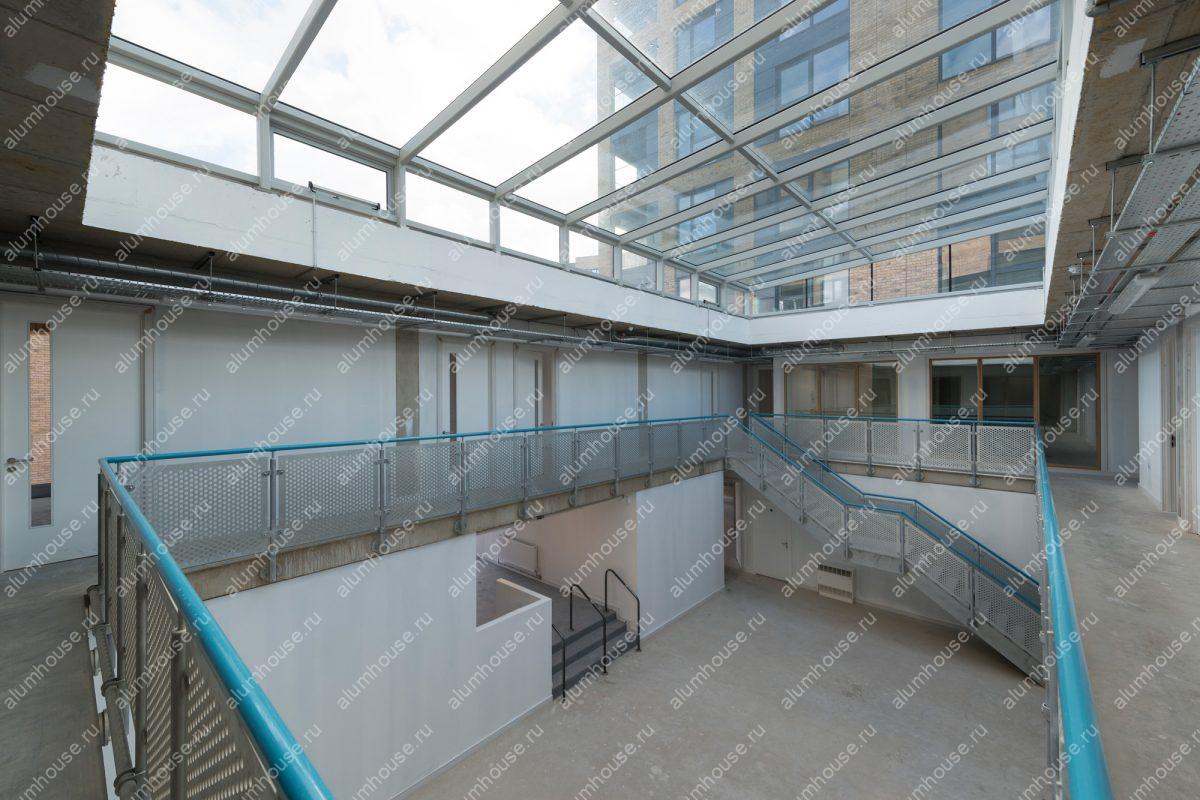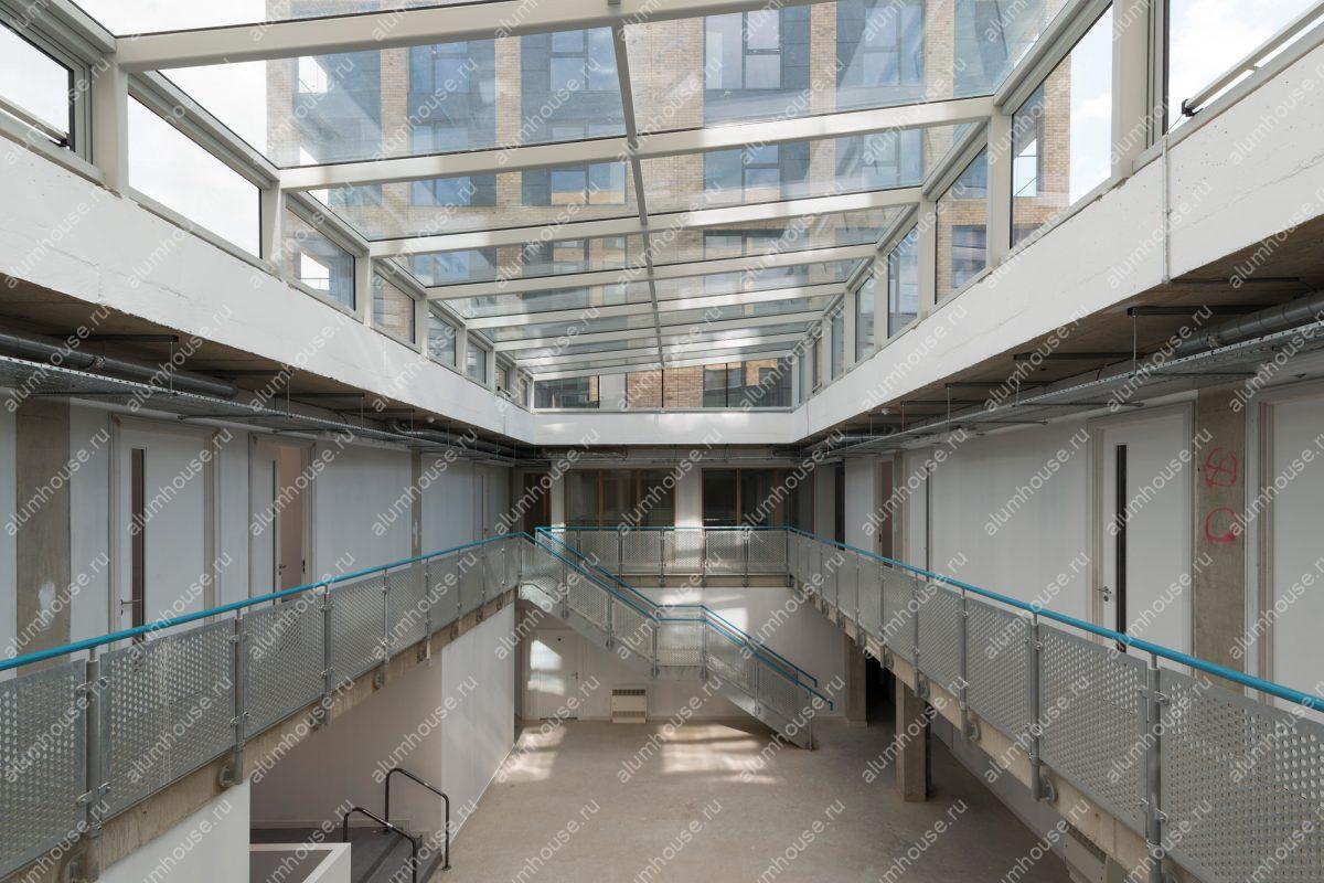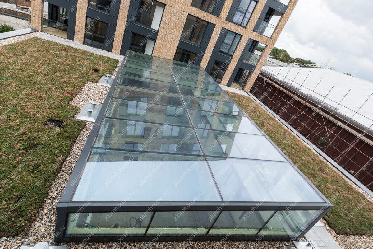 Выполнена установка стеклянной кровли с использованием алюминиевого профильного каркаса, что позволило создать современное, светопрозрачное и долговечное перекрытие. Алюминий выбран в качестве основного конструктивного материала благодаря его лёгкости, высокой прочности, устойчивости к коррозии и возможности создавать конфигурации разной сложности, включая криволинейные и панорамные формы.