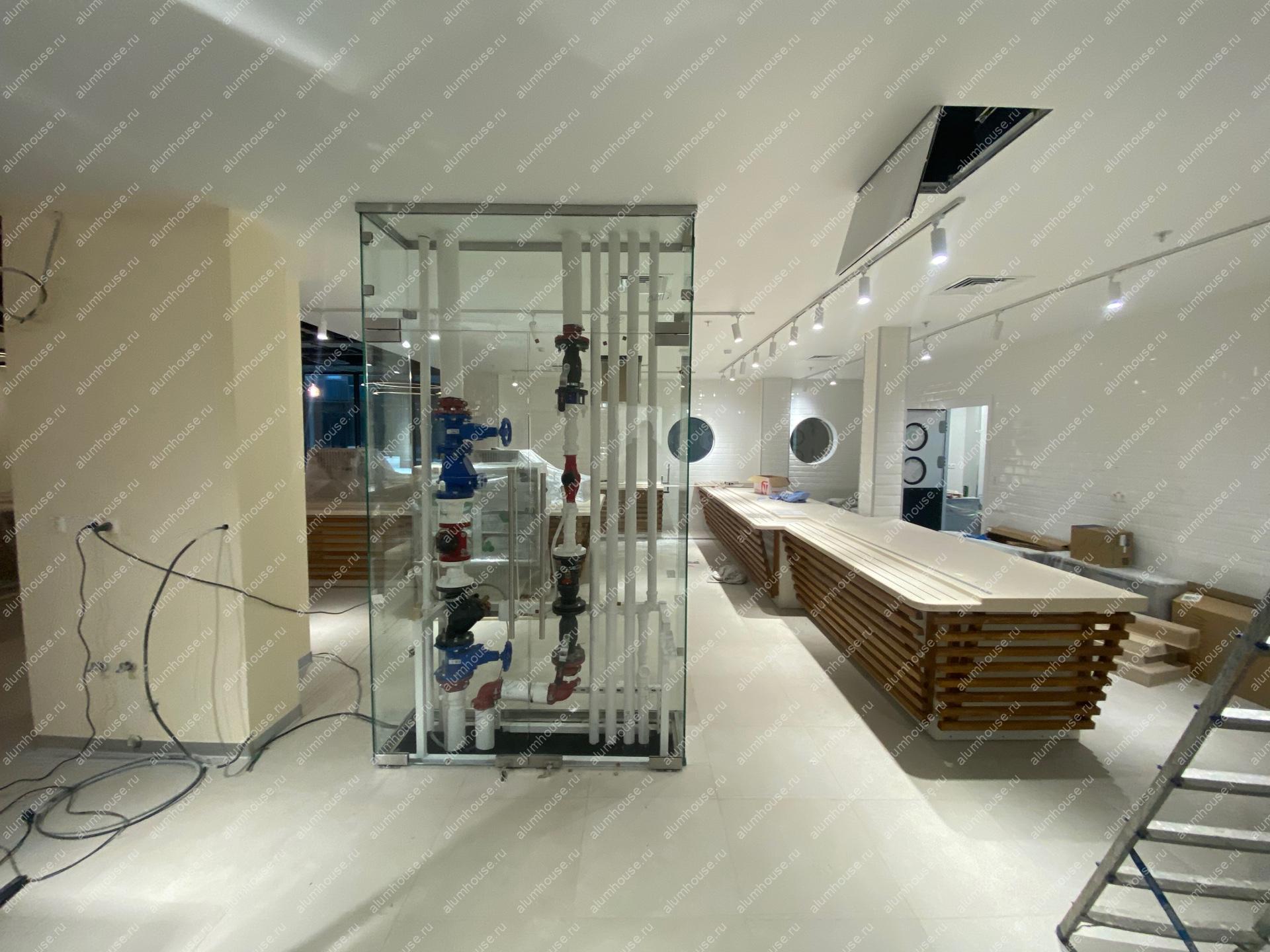Выполнено изготовление и монтаж стеклянного куба с распашными дверьми — элегантной конструкции из закалённого стекла и фурнитуры из нержавеющей стали и алюминия. Куб оснащён распашными дверями на шарнирах с надёжными замками и стильными ручками-штангами. Такая система обеспечивает лёгкость и визуальную прозрачность, при этом конструкции характерна высокая прочность и долговечность. Стеклянный куб отлично подходит как для оформления витрин, так и для современных интерьеров частных и коммерческих объектов, подчёркивая их открытость и современный стиль