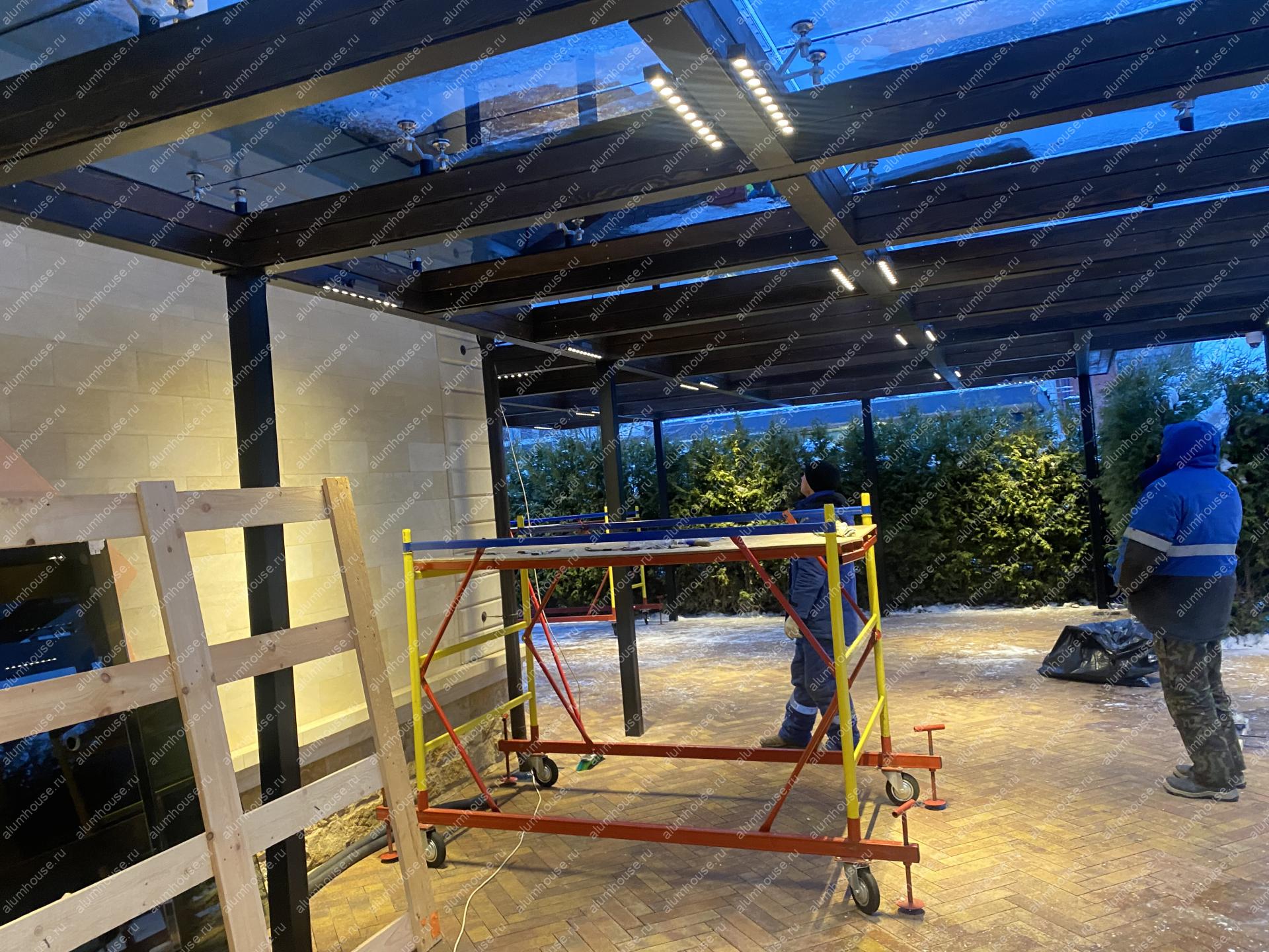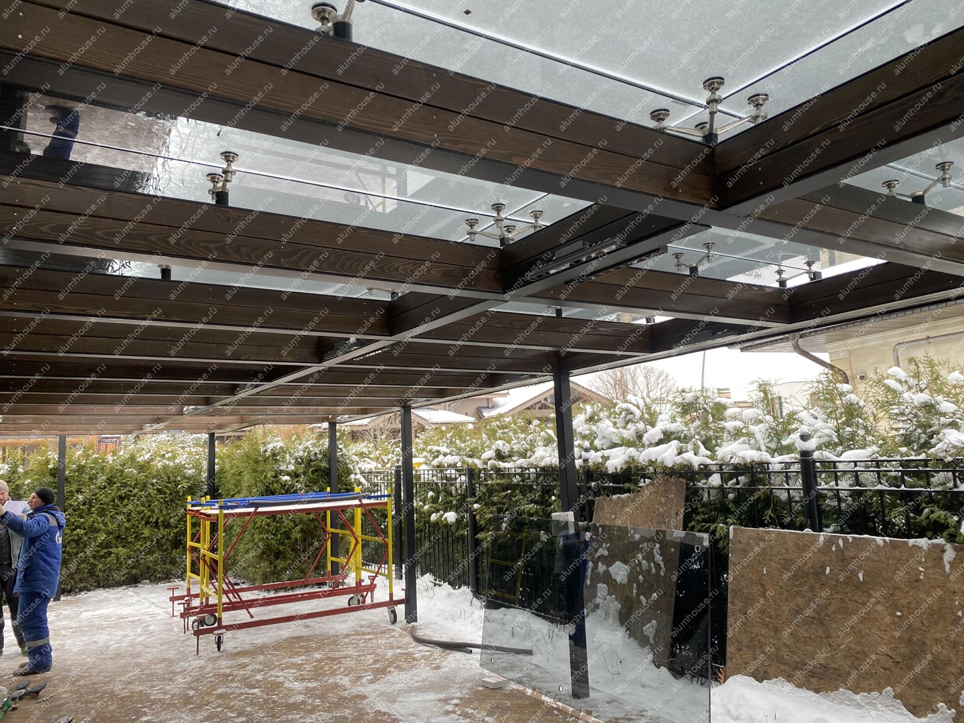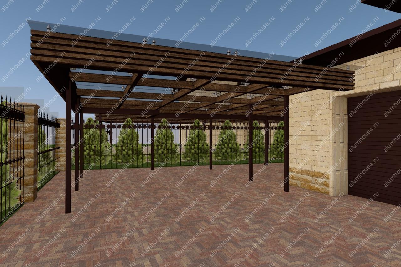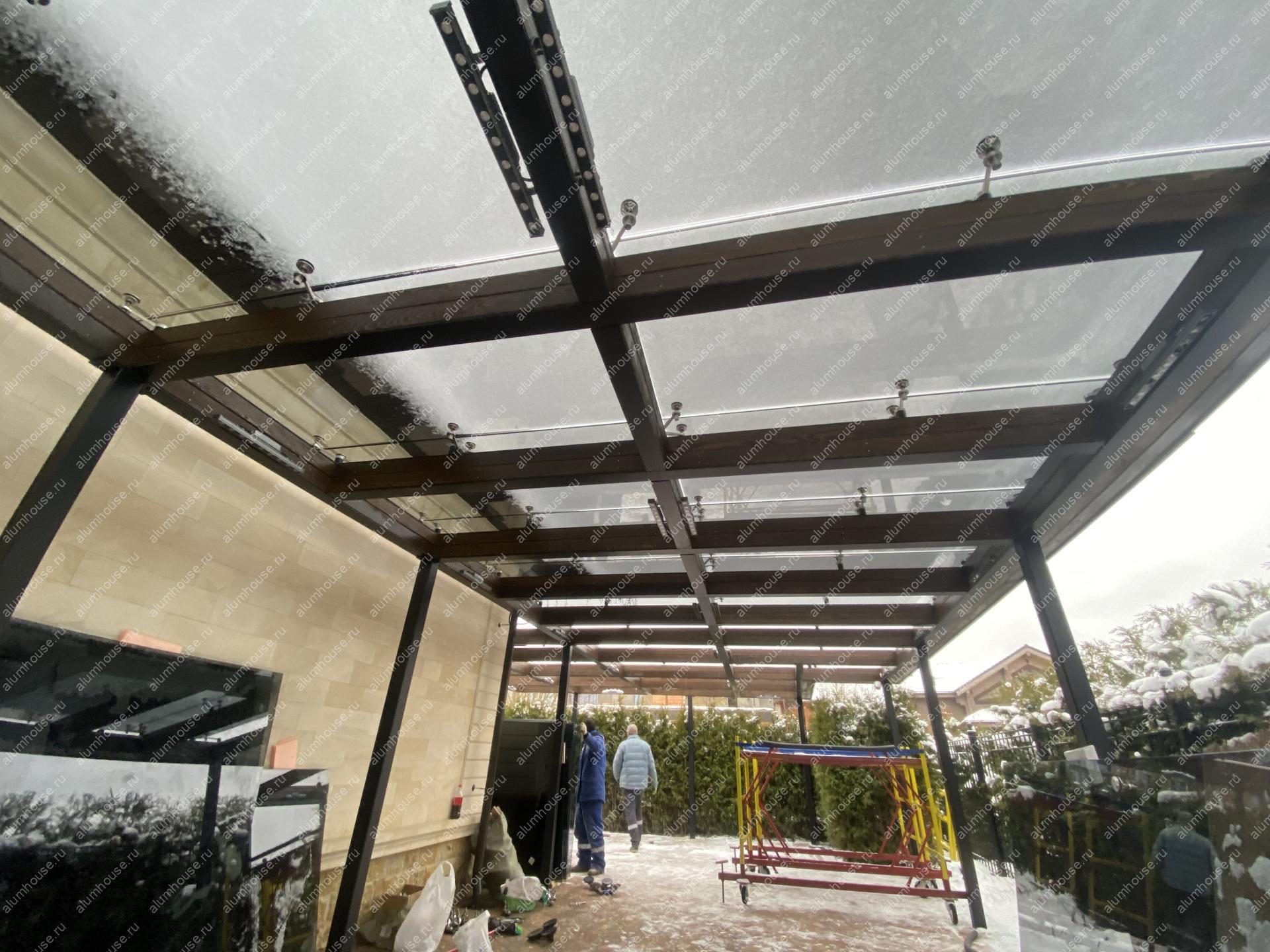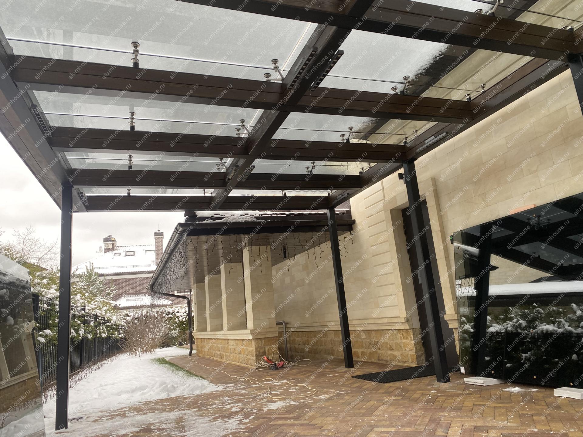 Такой навес идеально подходит для оформления входных групп, зон отдыха и других архитектурных элементов, где важна гармония с окружающим пространством и максимальное сохранение естественного освещения.