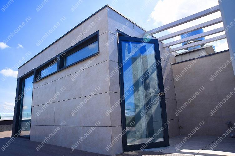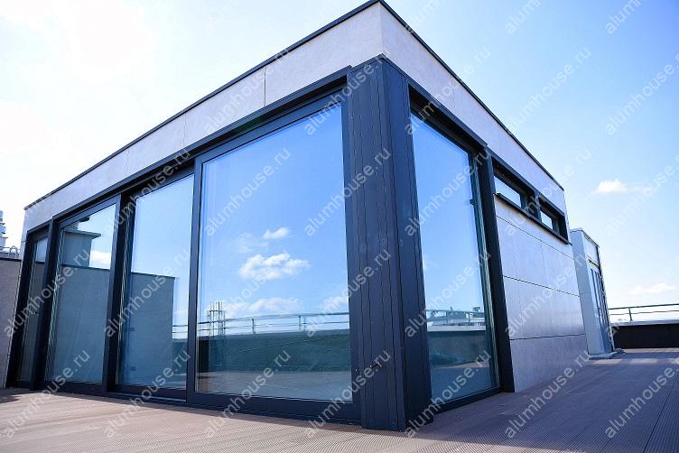 Тонкие линии алюминиевого профиля подчёркивают современный стиль павильона, а сама конструкция гармонично вписывается в архитектуру здания. Такое решение позволяет существенно увеличить полезную площадь, создавая светлую и комфортную зону для отдыха, встреч или работы на крыше.