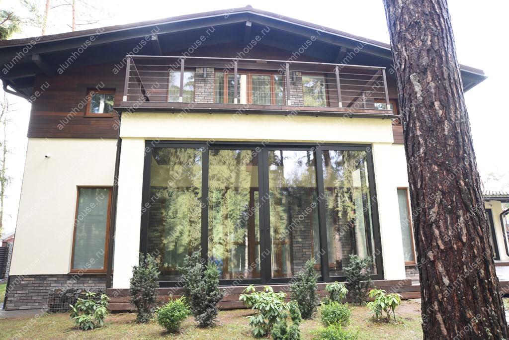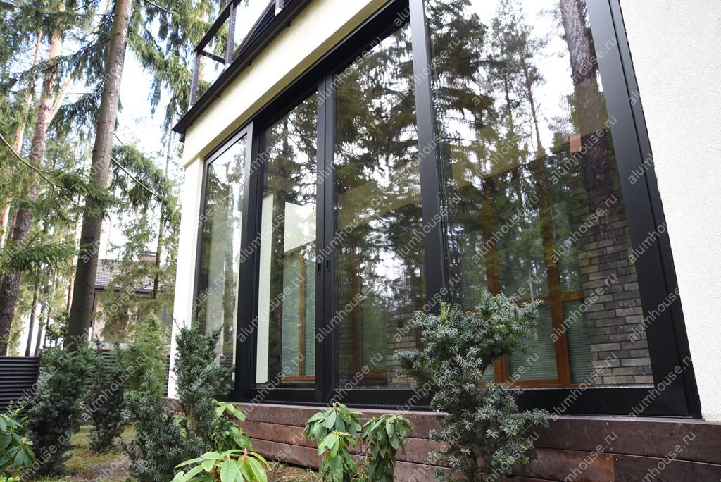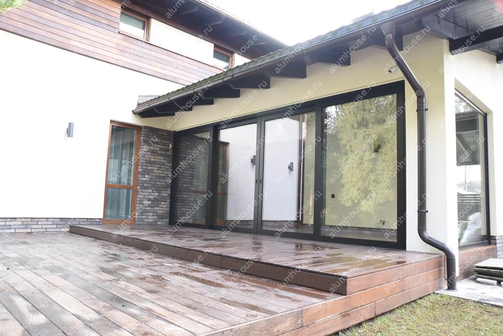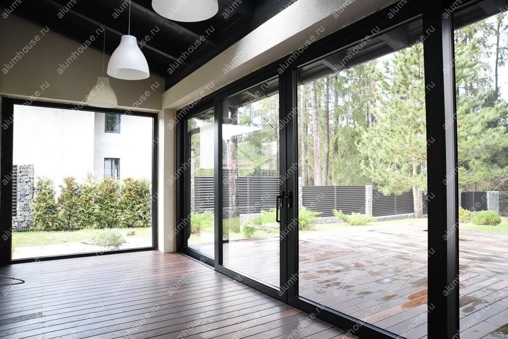 Использование современных систем Schüco обеспечивает превосходную тепло- и шумоизоляцию, а также возможность установки крупноформатных стеклянных элементов с минимальной шириной профиля. Благодаря подъемно-раздвижным дверям открывается широкий проём для выхода на террасу, а алюминиевые окна гармонично дополняют архитектуру веранды, наполняя её естественным светом и подчеркивая современный стиль здания. Такое решение идеально подходит для круглогодичной эксплуатации и создает ощущение единства с природой