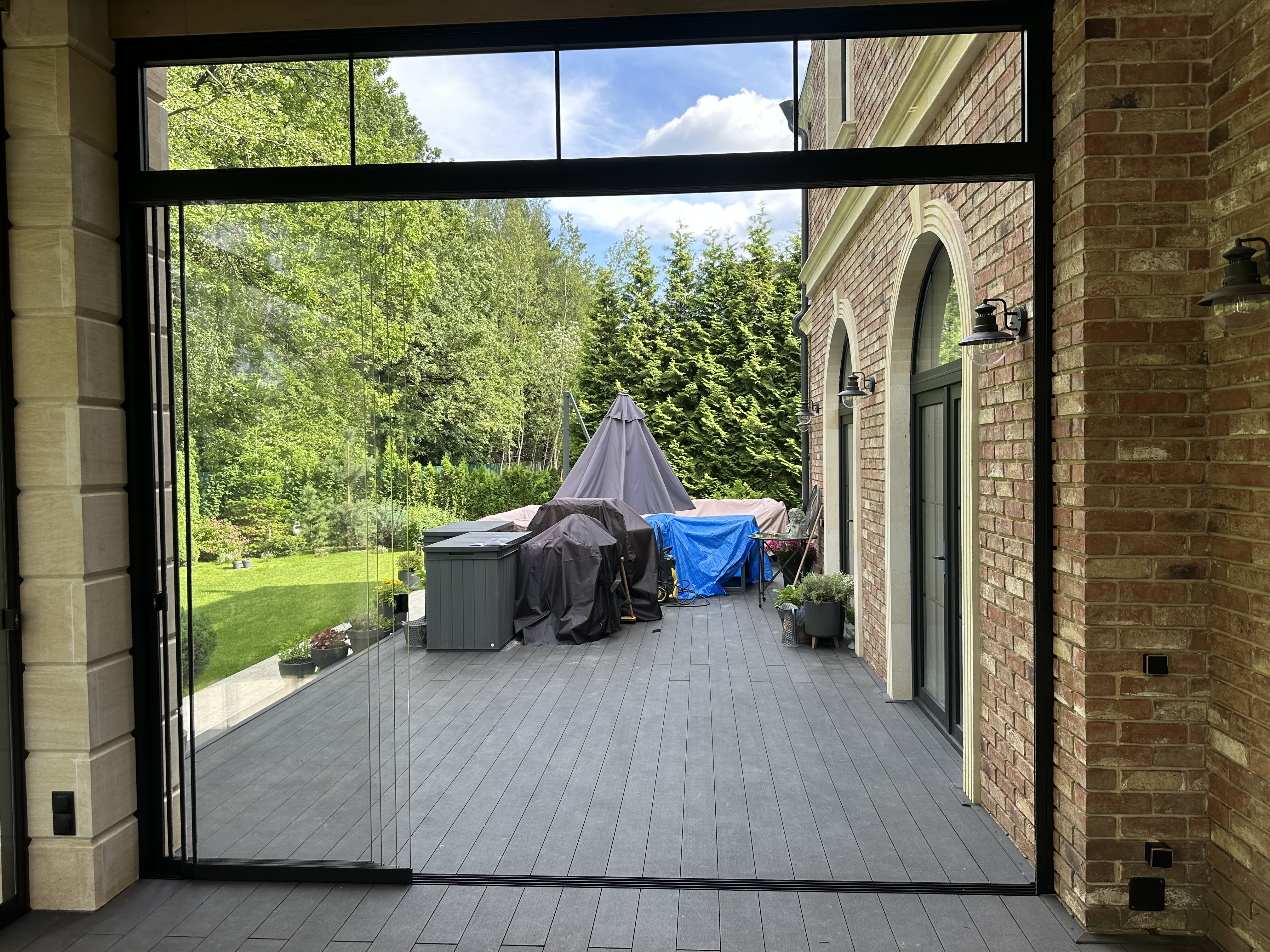 Безрамное слайдинговое остекление создало приватное, светлое пространство с чистыми линиями и удобным раскрытием широких проёмов.