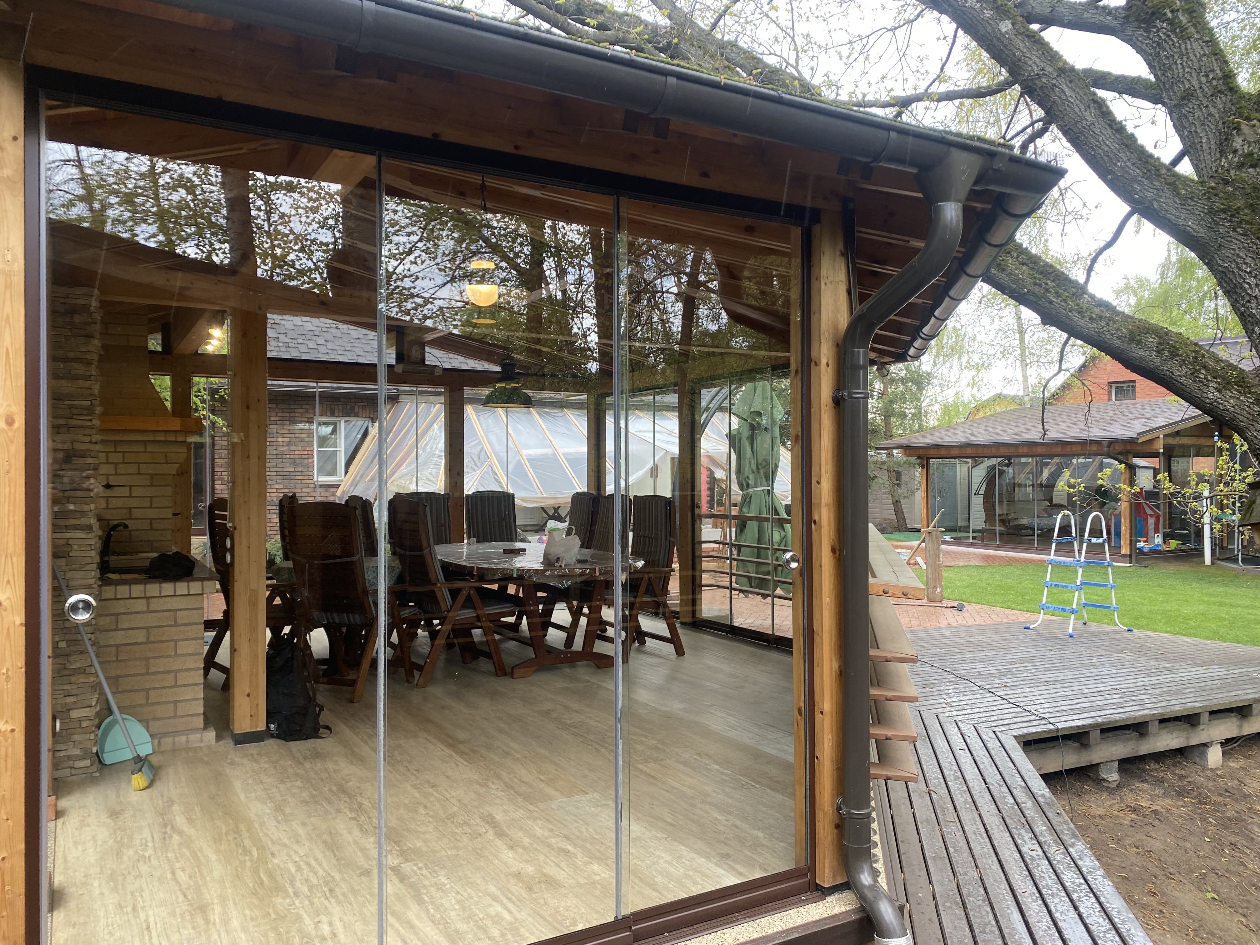 Лёгкое безрамное остекление превратило летнюю кухню в светлое трансформируемое пространство с панорамным видом и защитой от ветра и осадков.