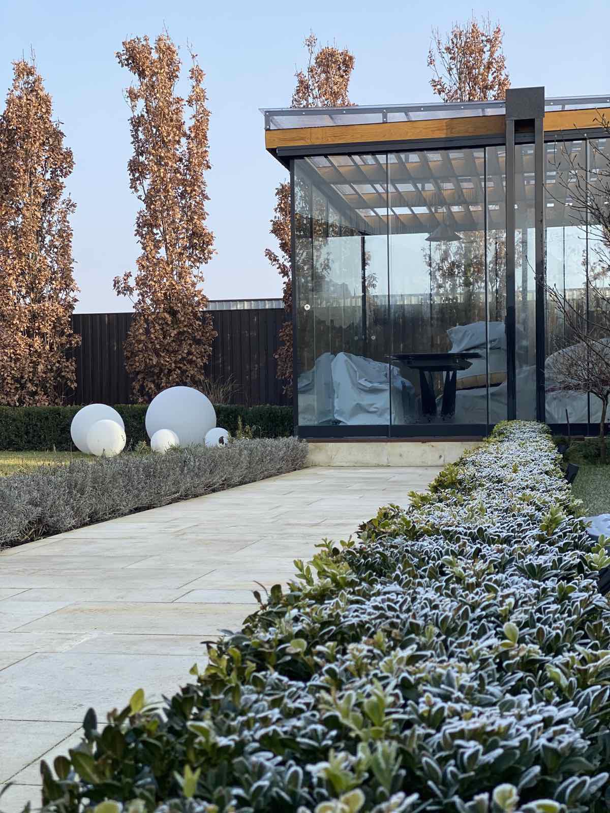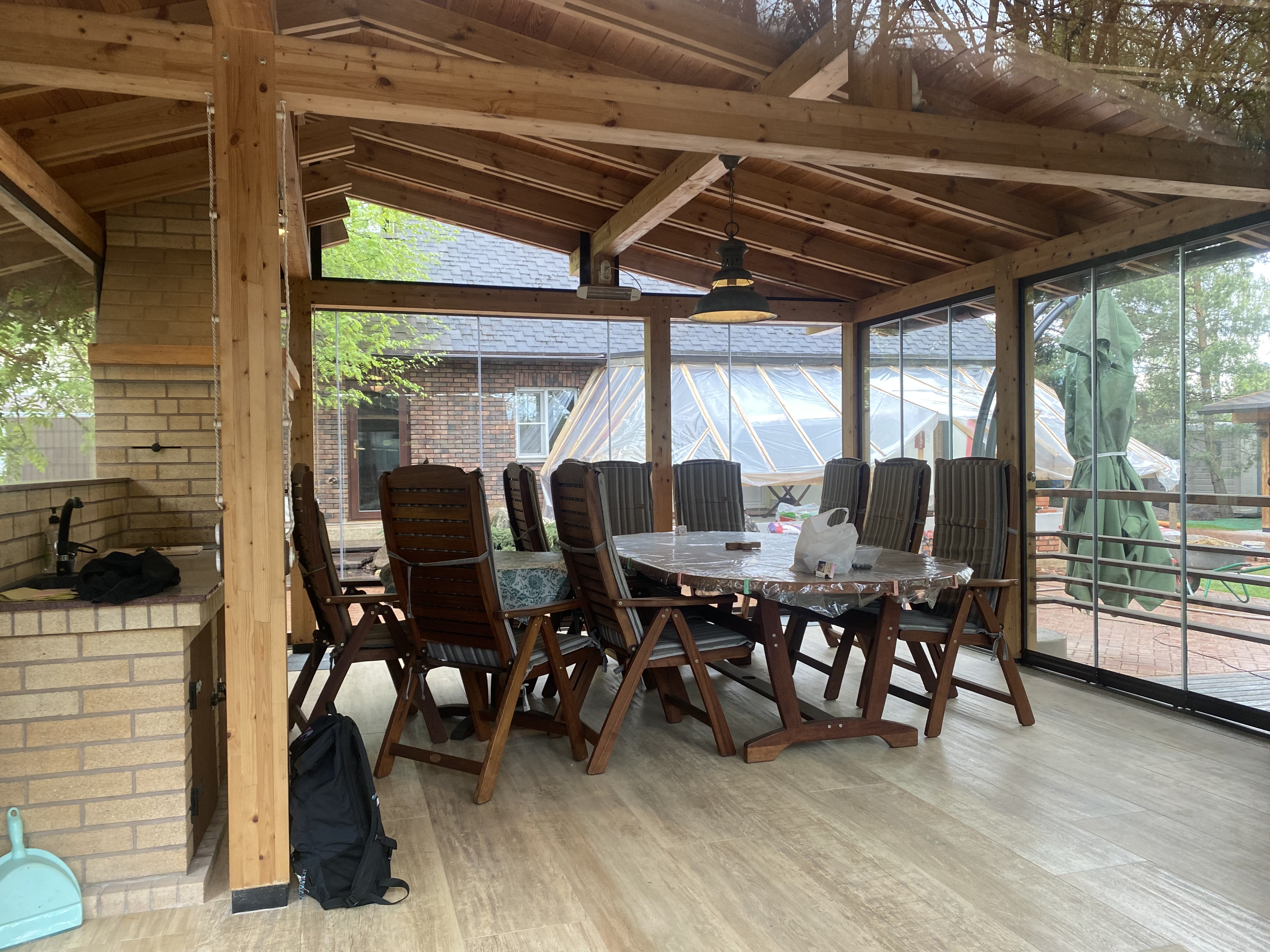 Реализован проект современной беседки с безрамным раздвижным остеклением и встроенной зоной барбекю — функционального и стильного пространства для отдыха на участке.