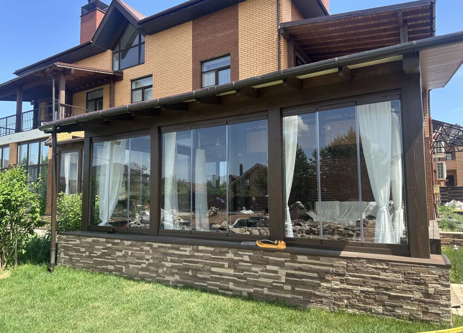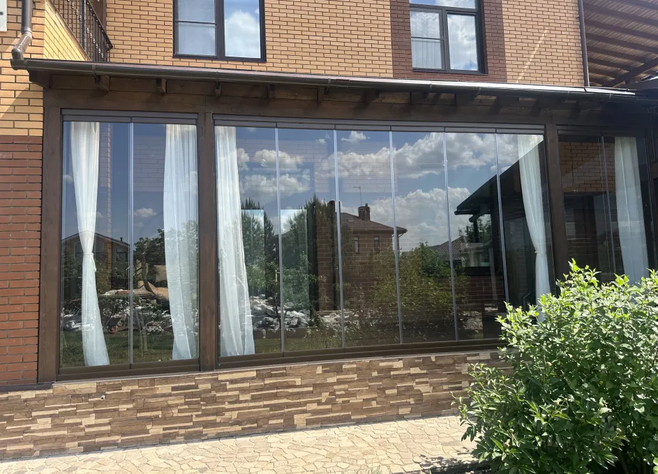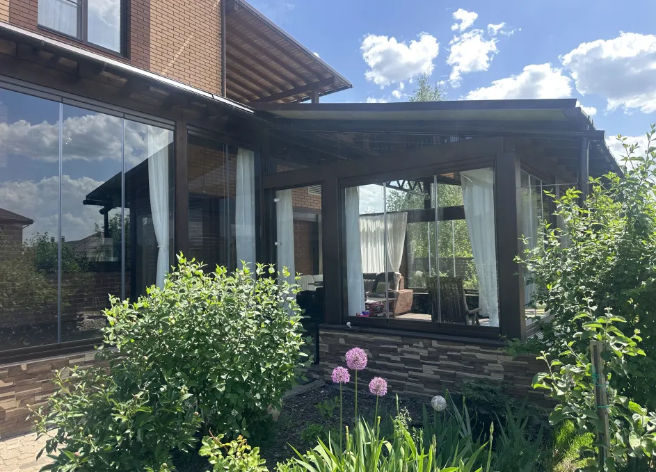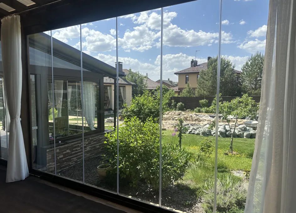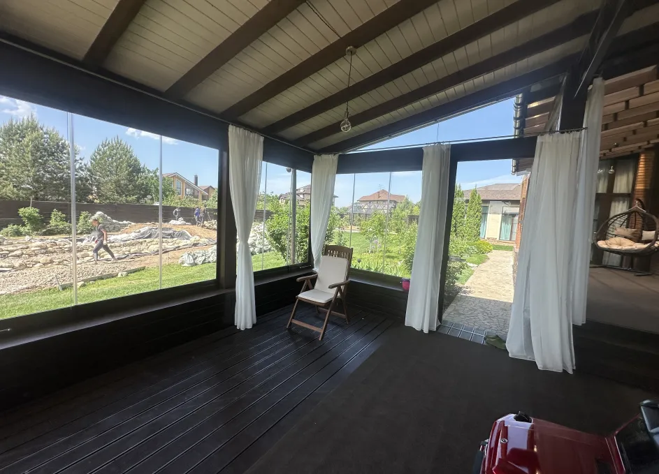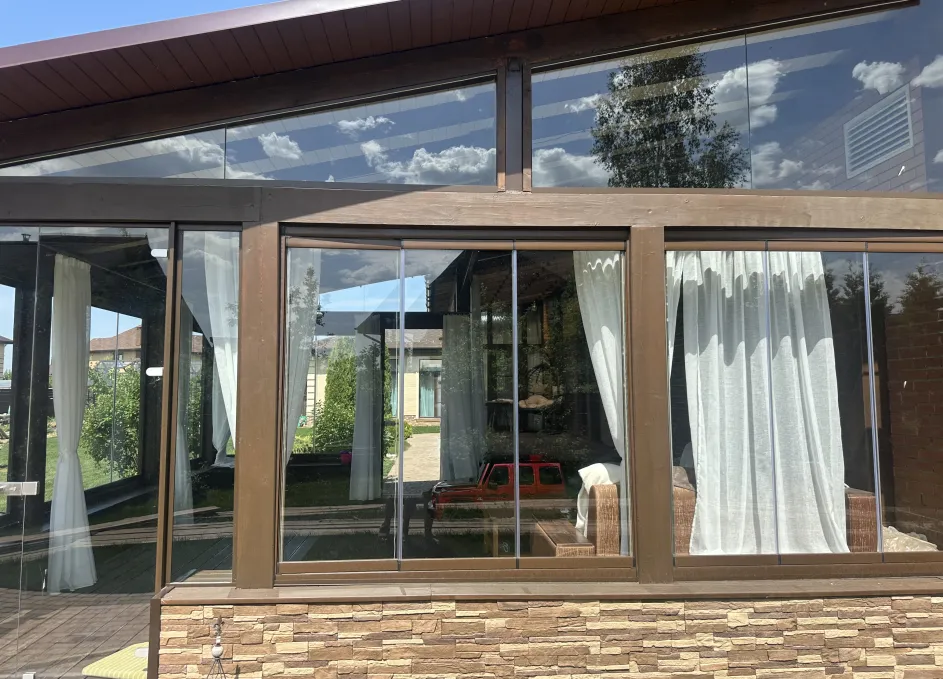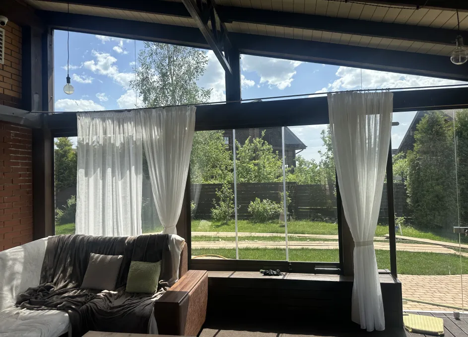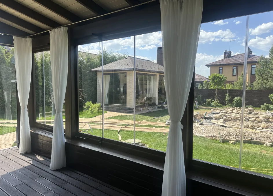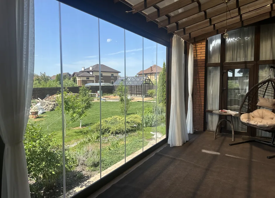 Панорамное рельсовое остекление веранды обеспечивает тихое скольжение створок по многотрековым направляющим и широкое раскрытие проёма.