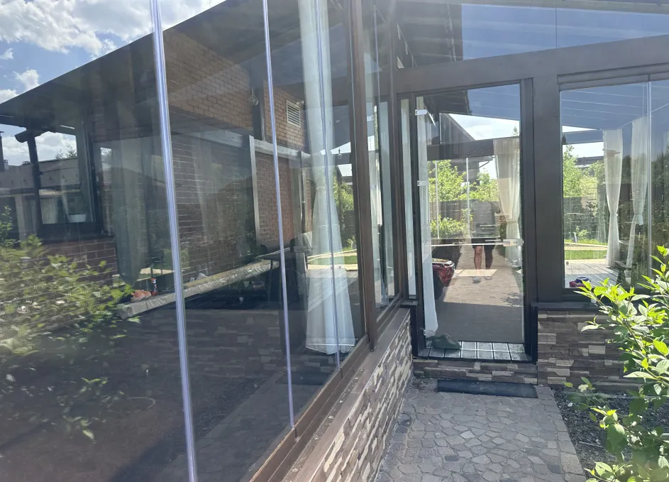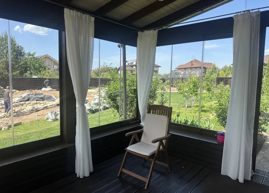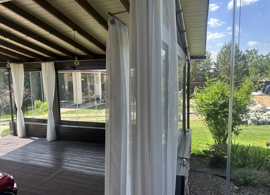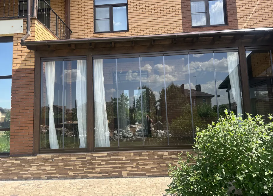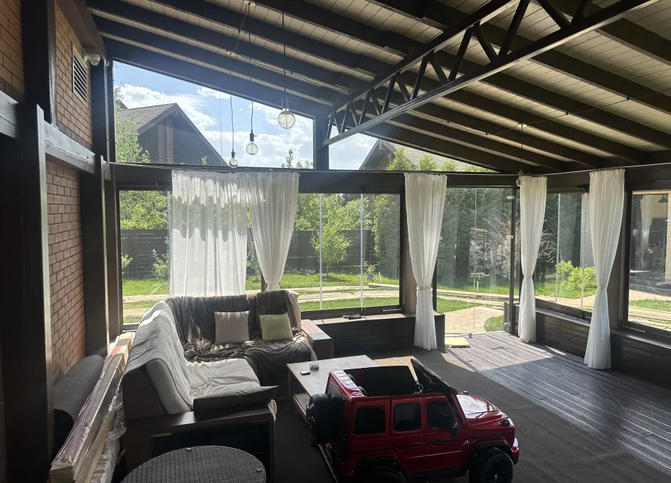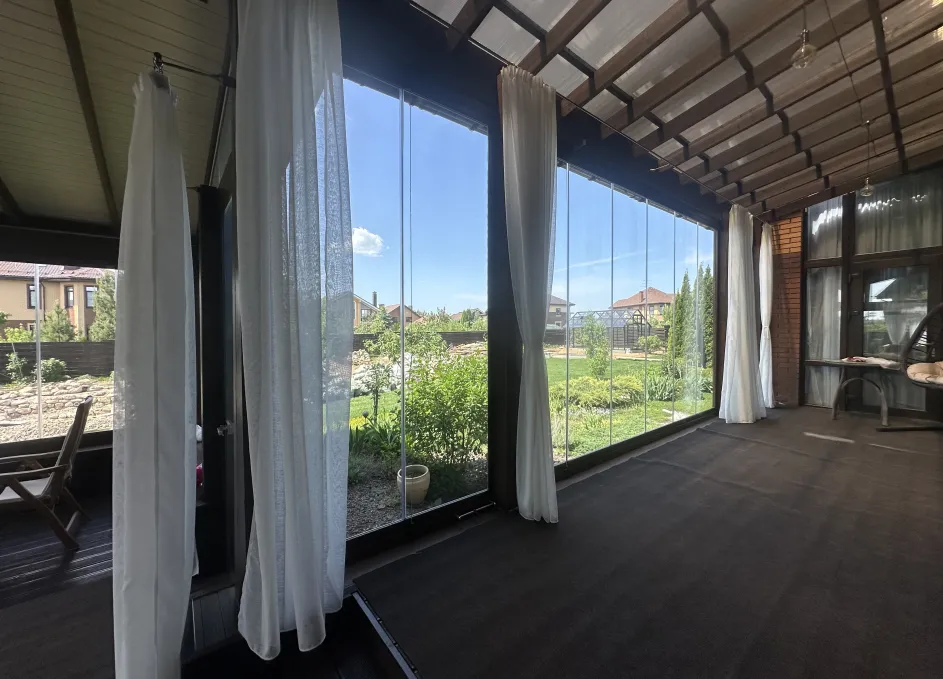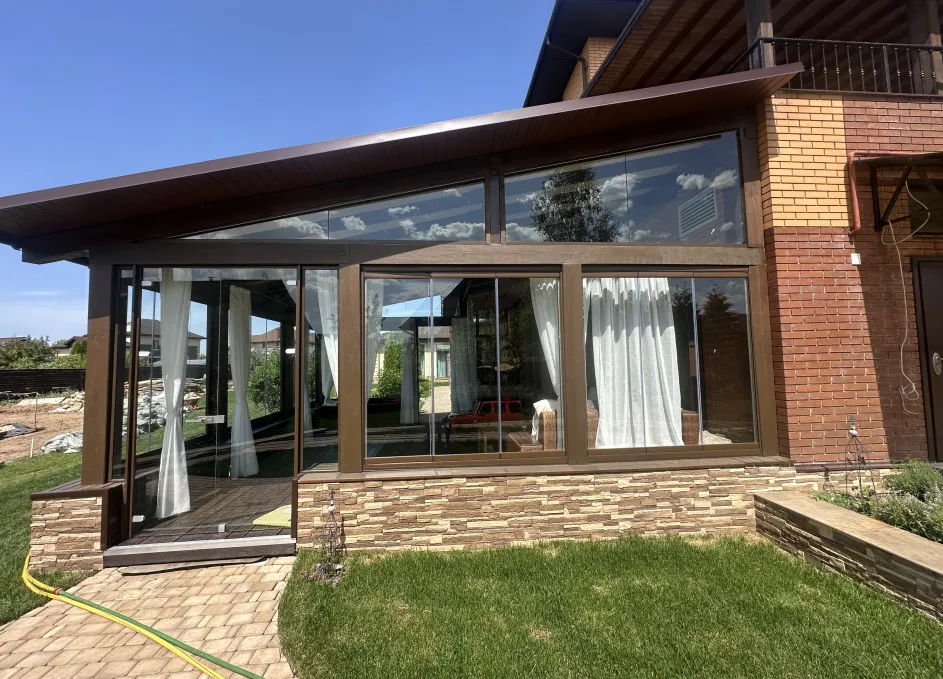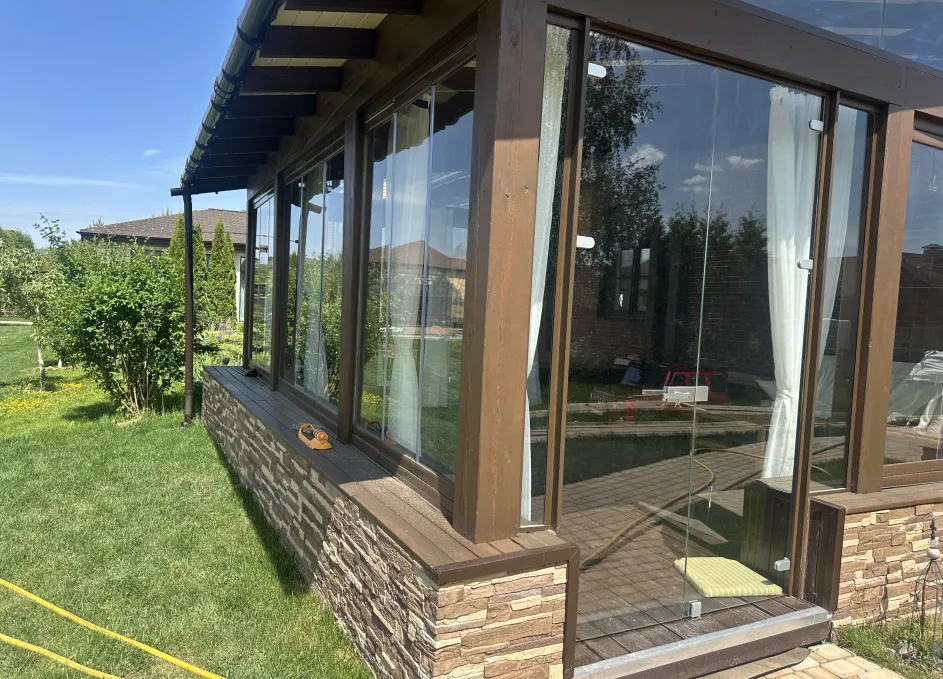 Панорамное рельсовое остекление веранды обеспечивает тихое скольжение створок по многотрековым направляющим и широкое раскрытие проёма.