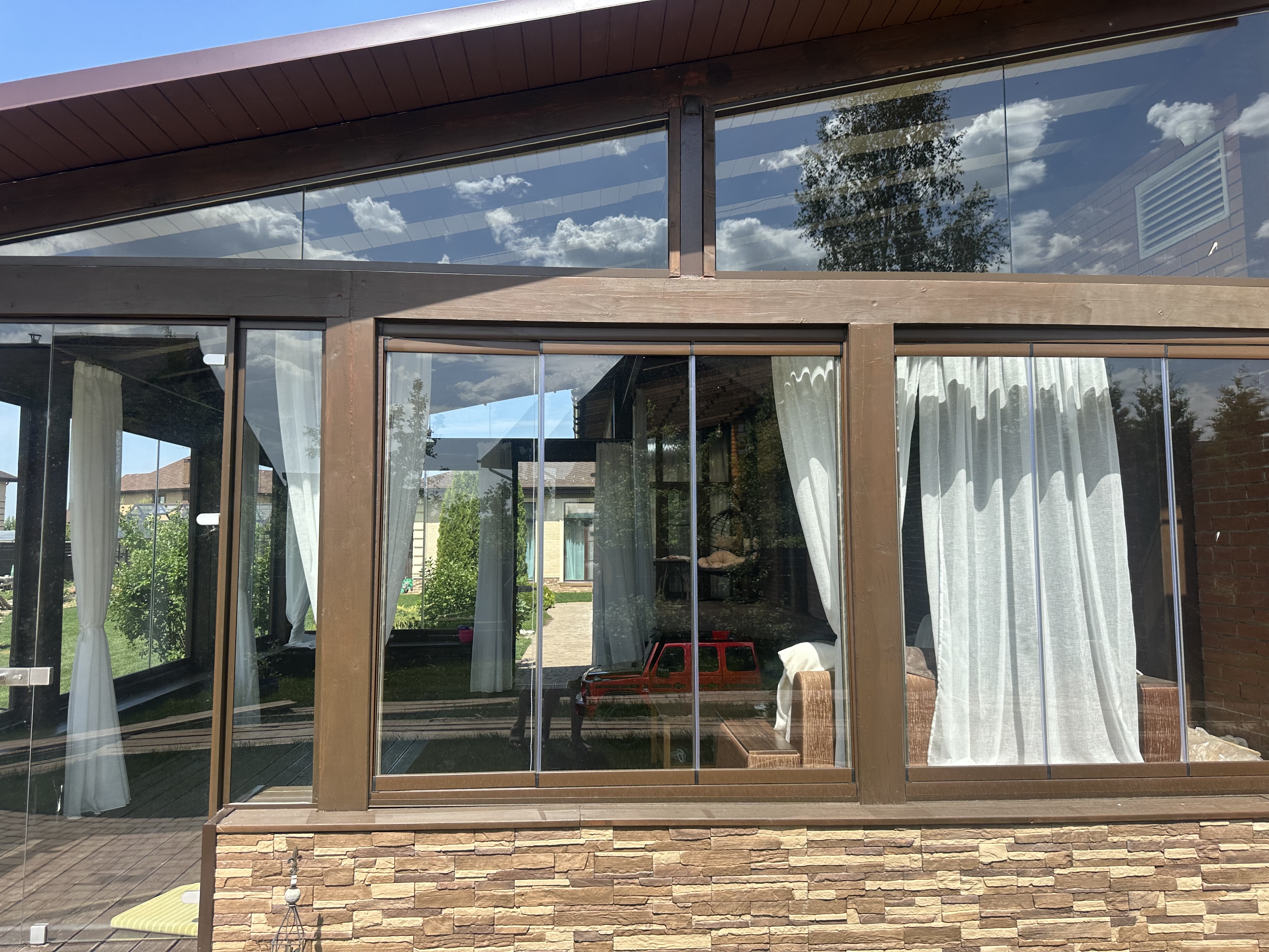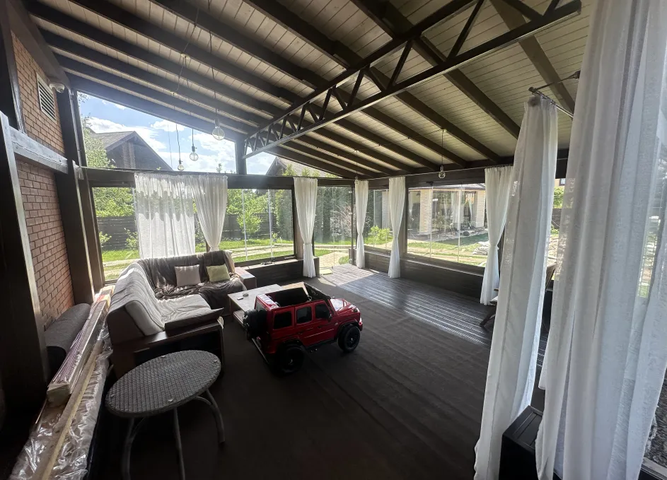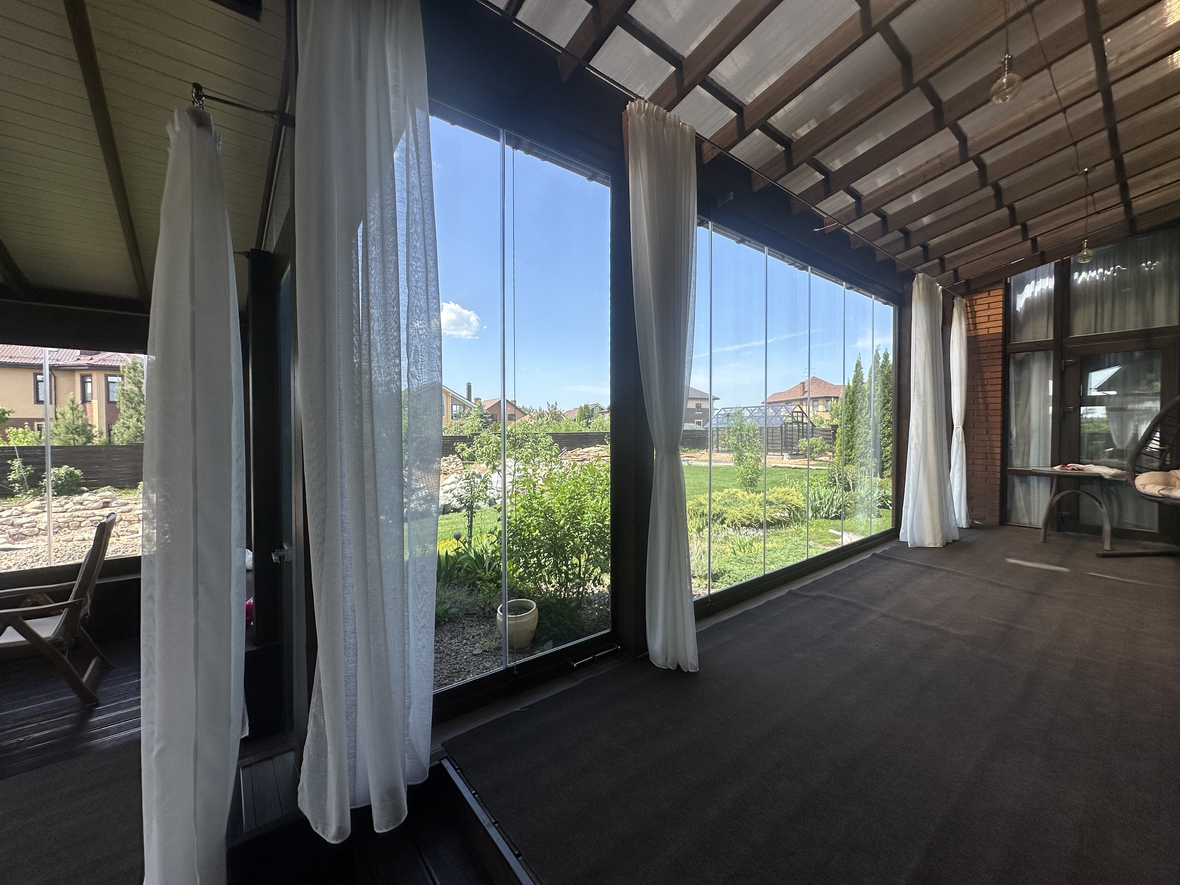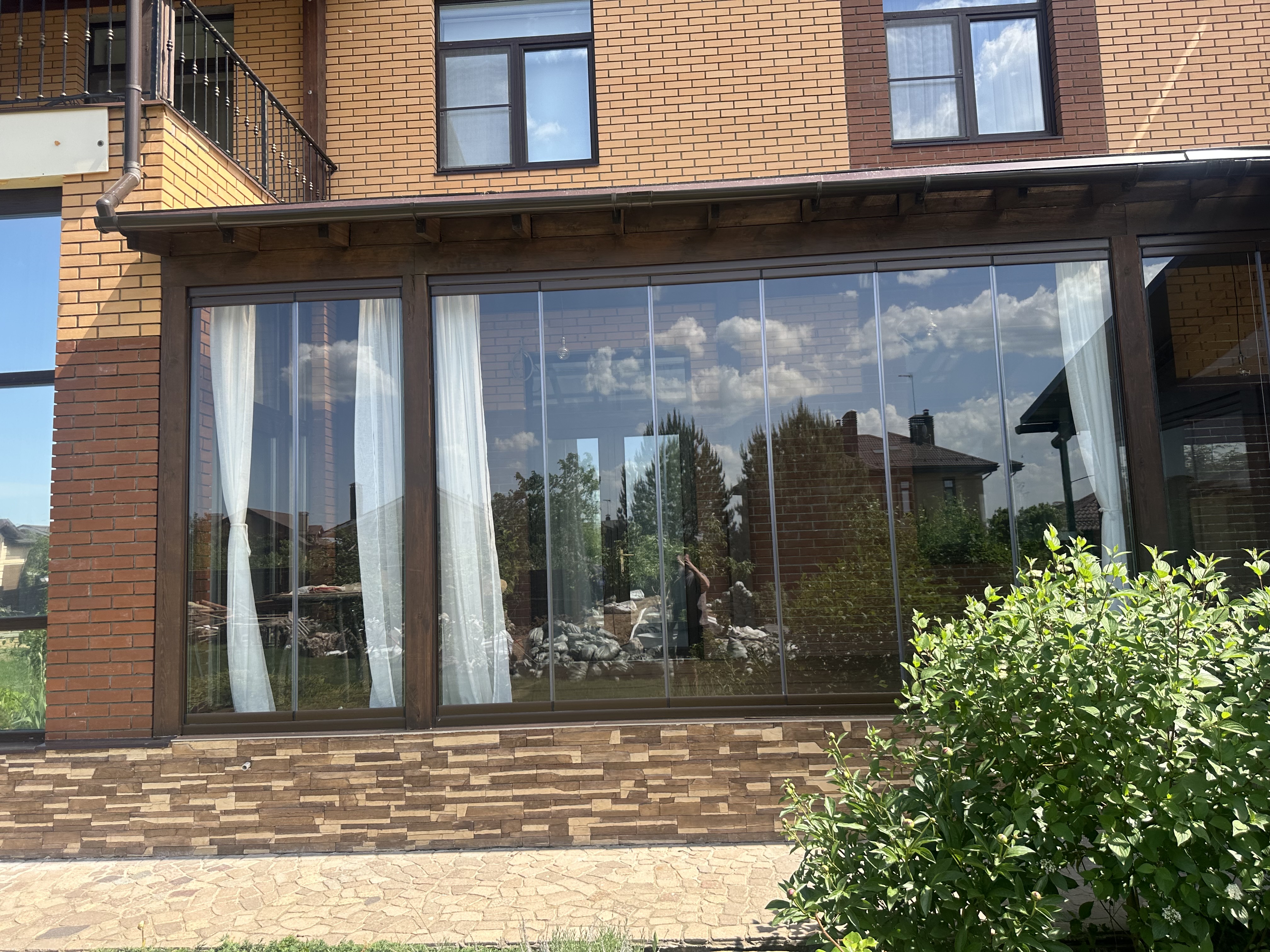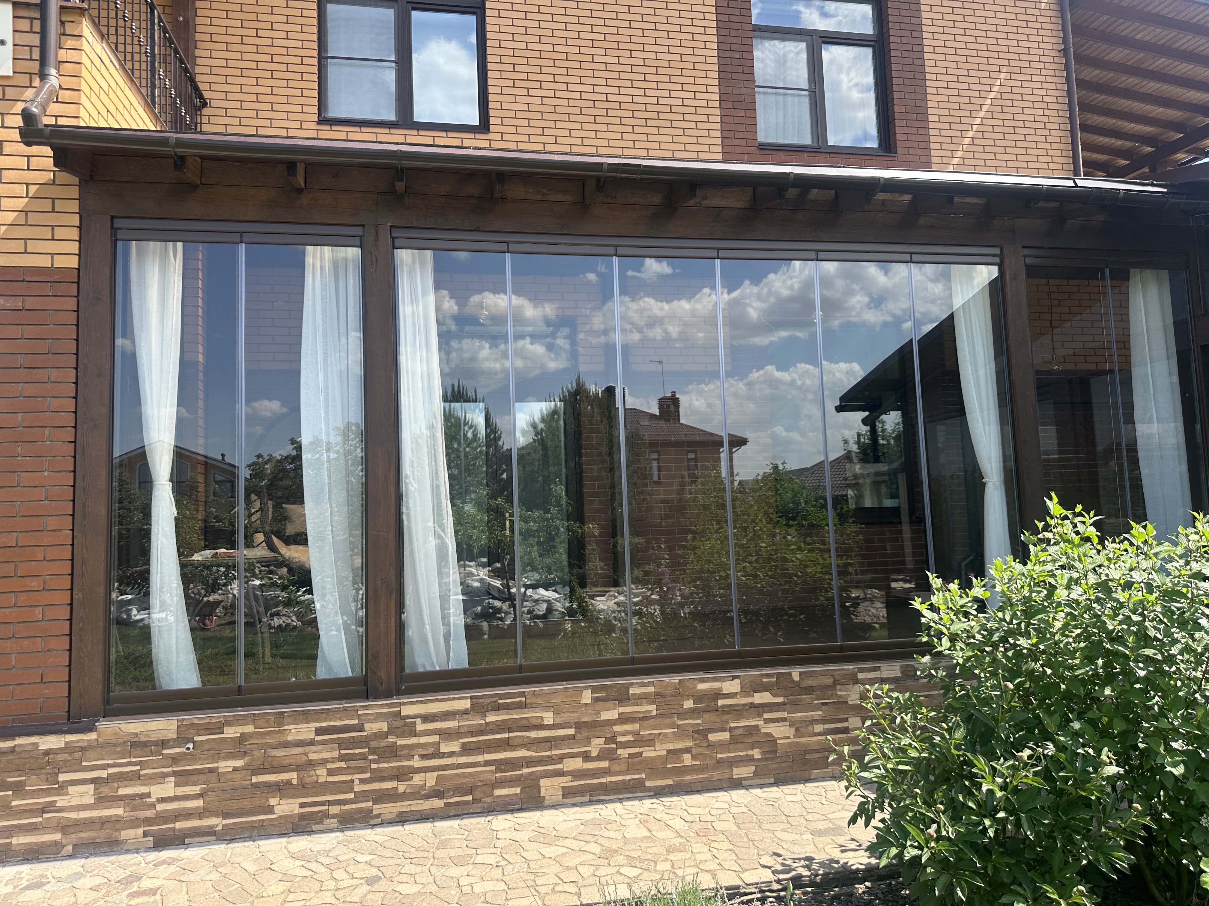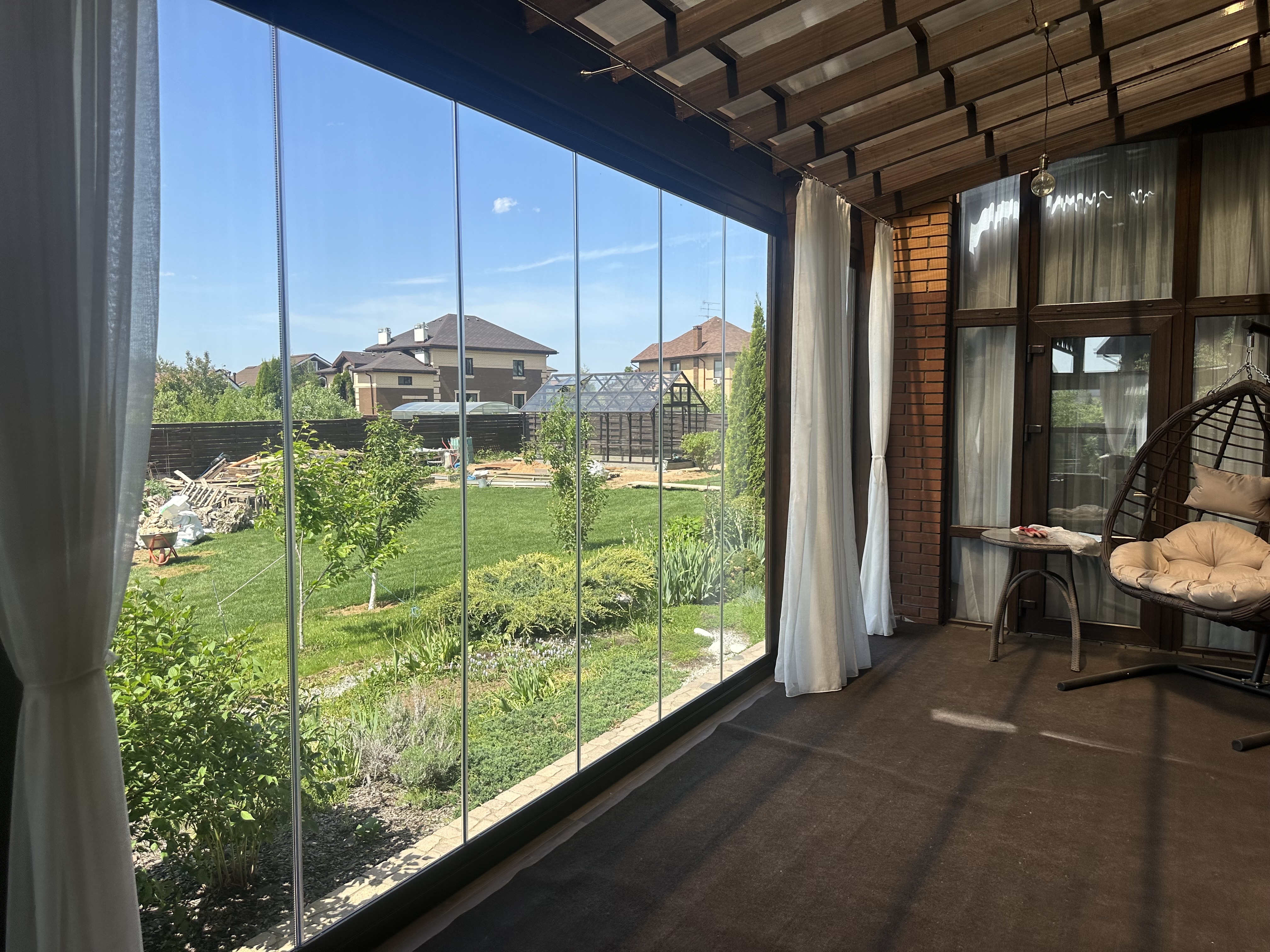 Панорамное рельсовое остекление веранды обеспечивает тихое скольжение створок по многотрековым направляющим и широкое раскрытие проёма.