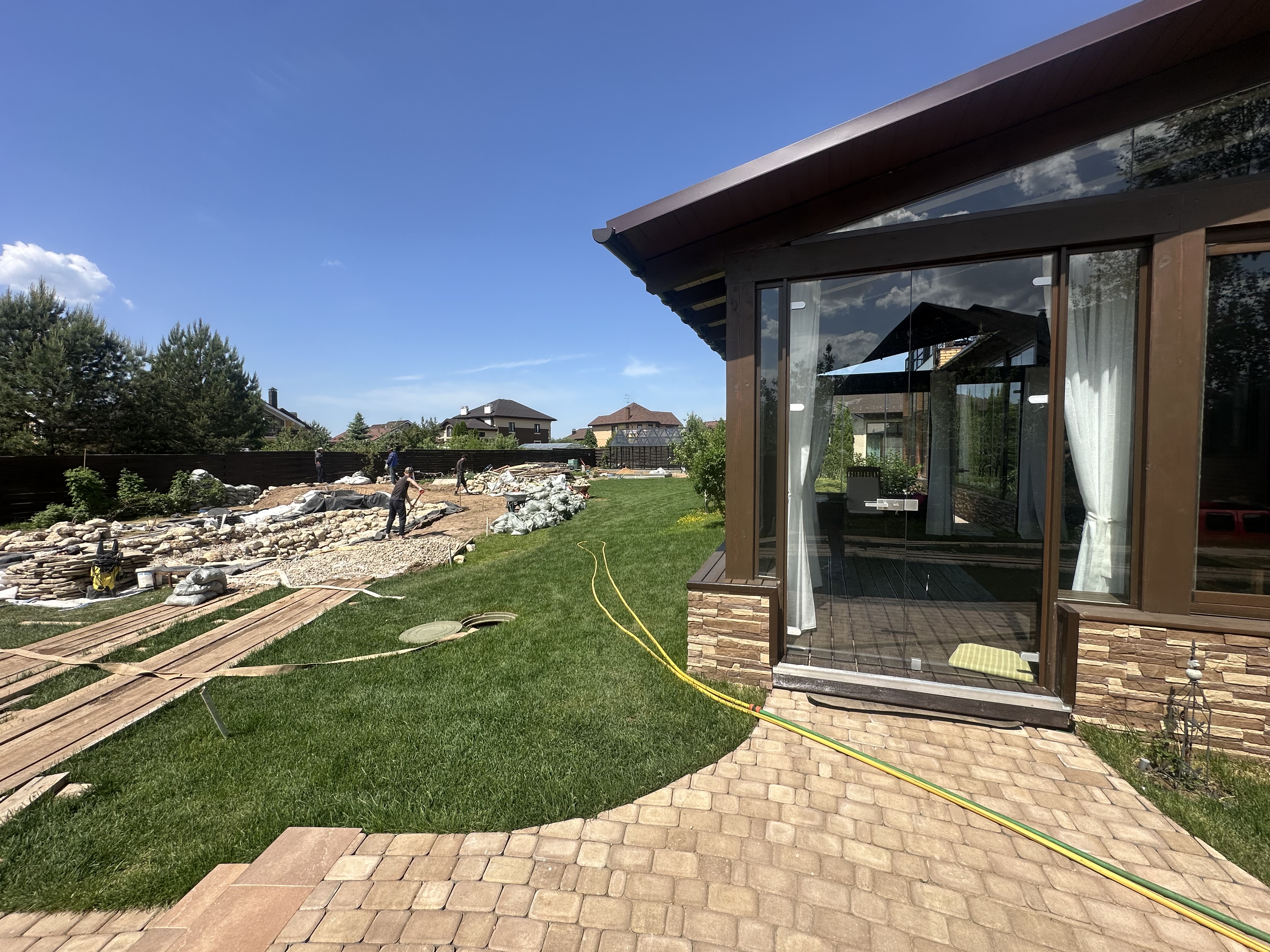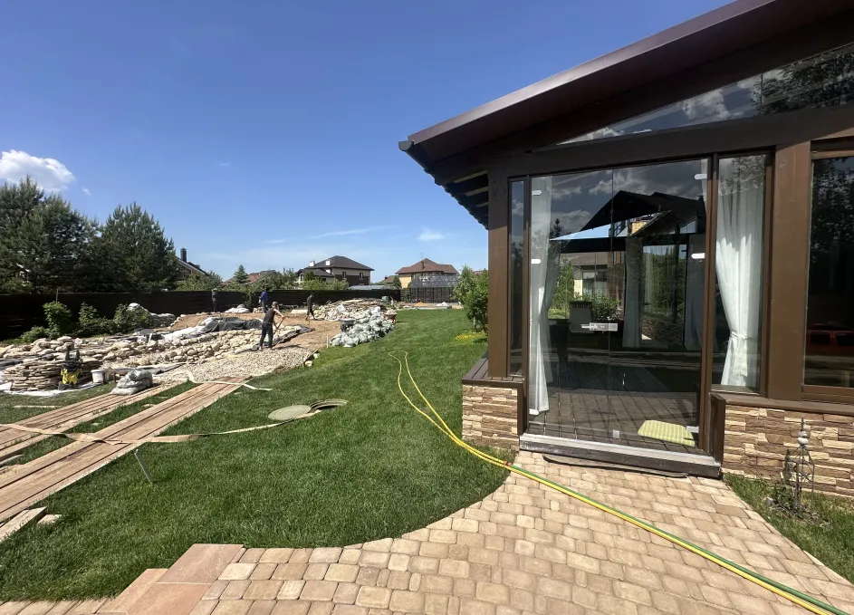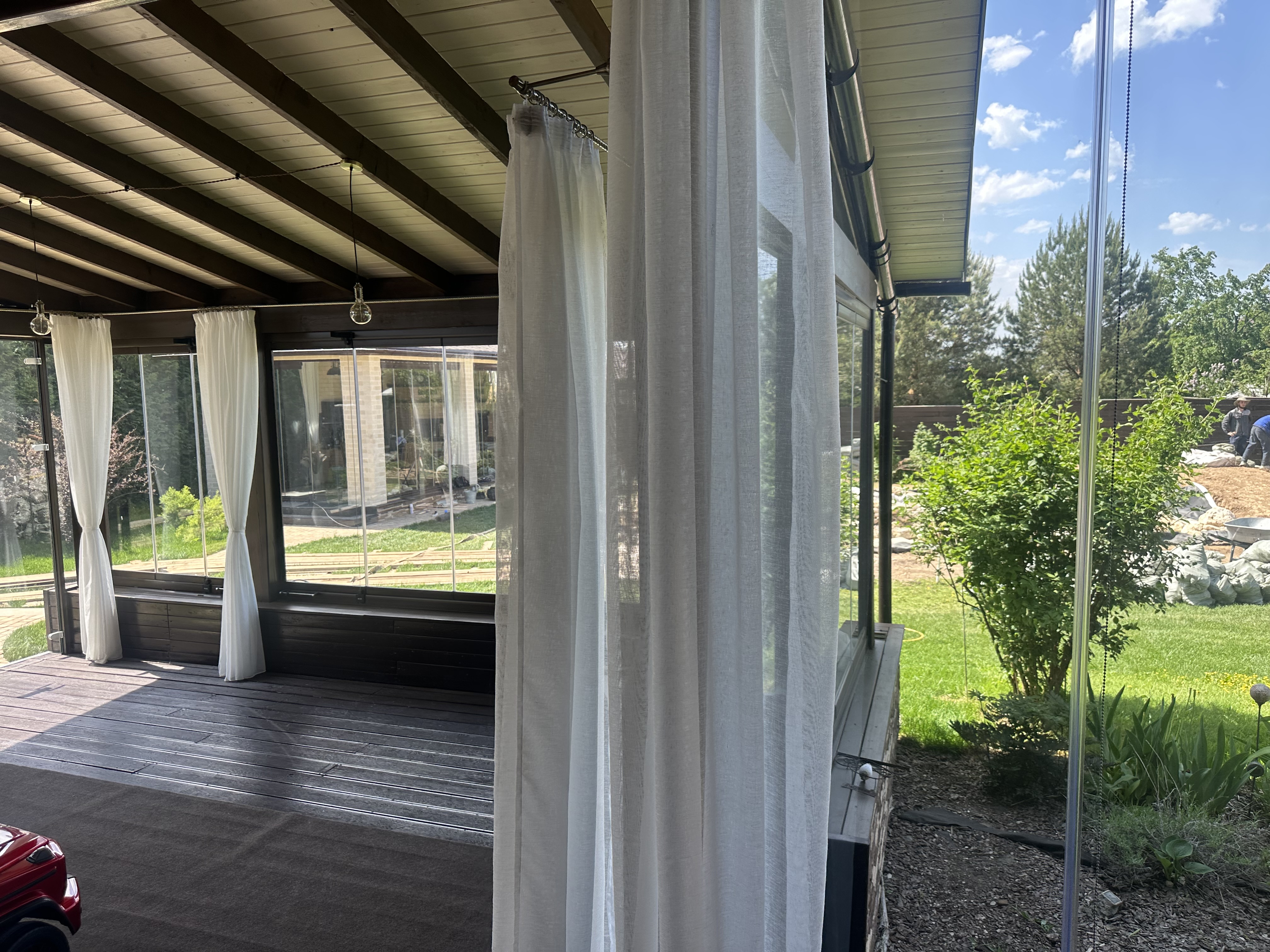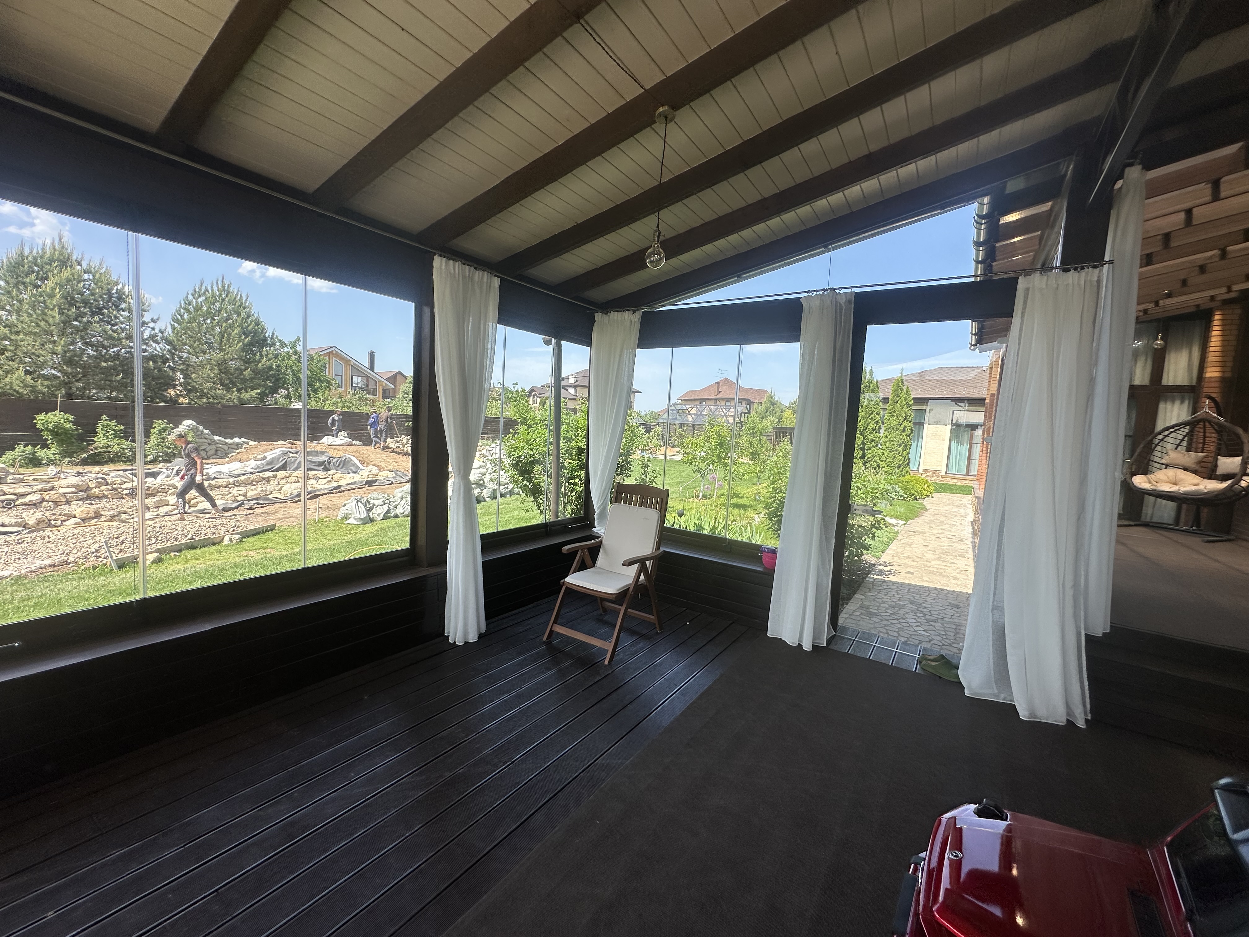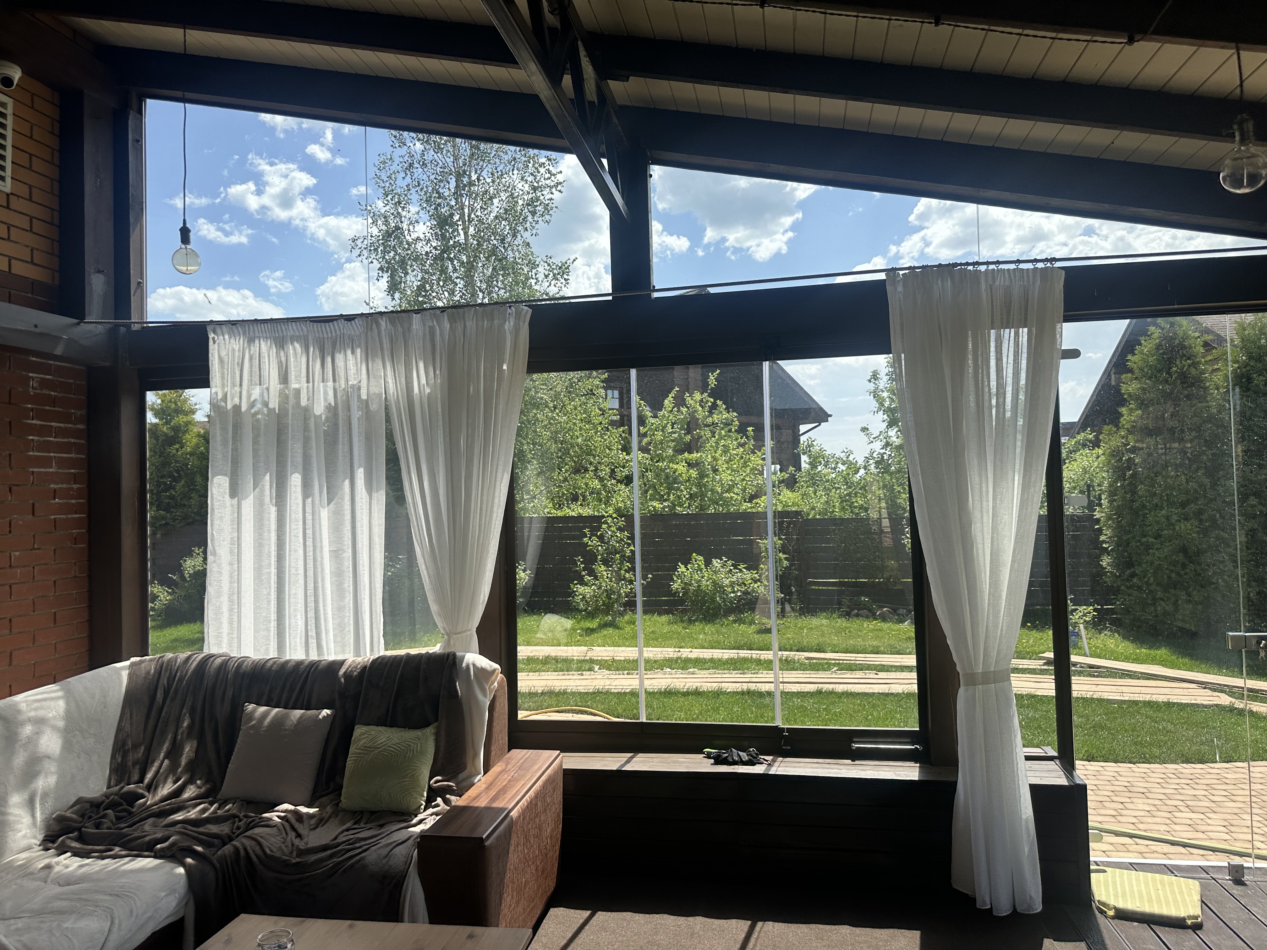 Панорамное рельсовое остекление веранды обеспечивает тихое скольжение створок по многотрековым направляющим и широкое раскрытие проёма.