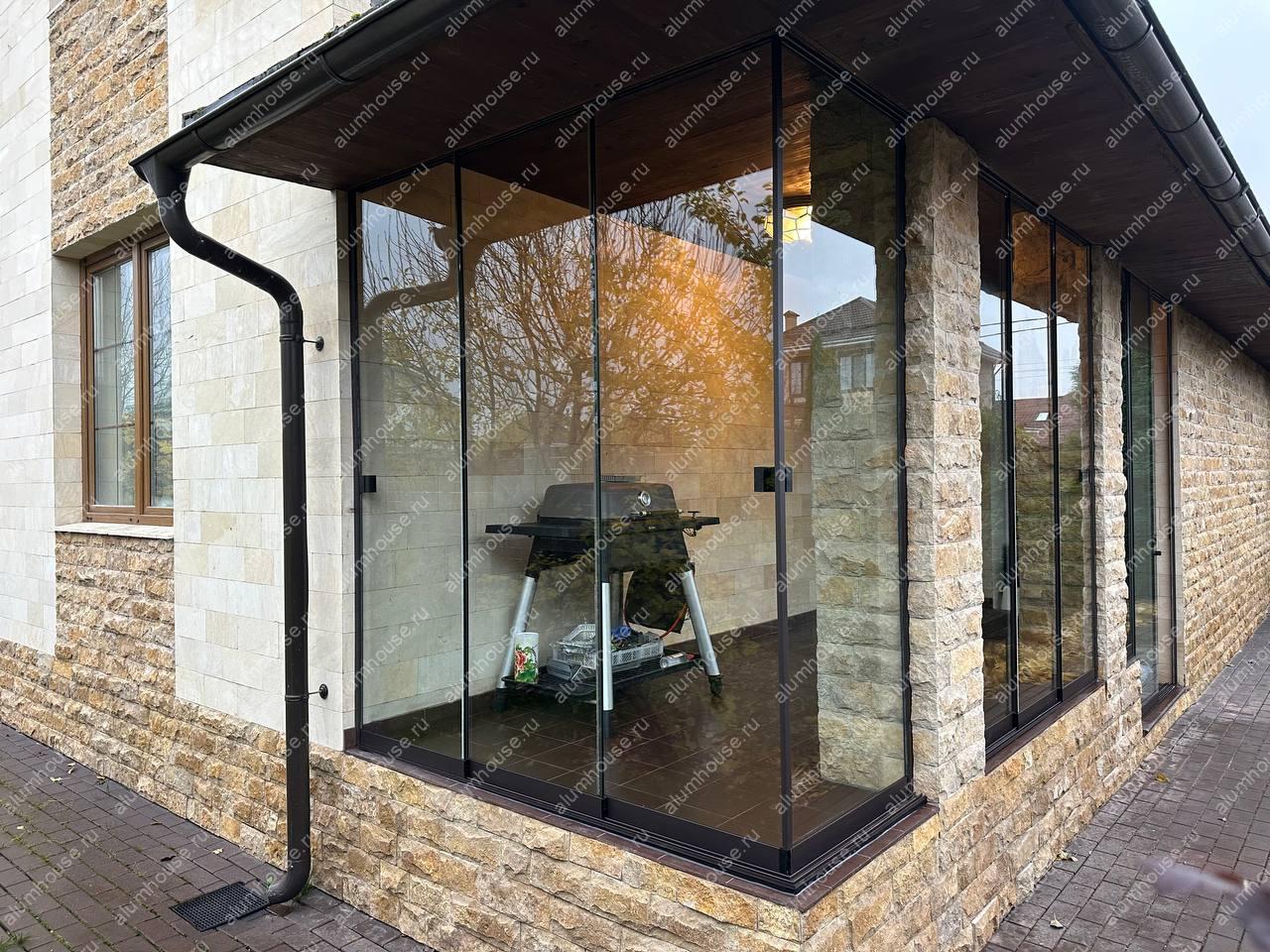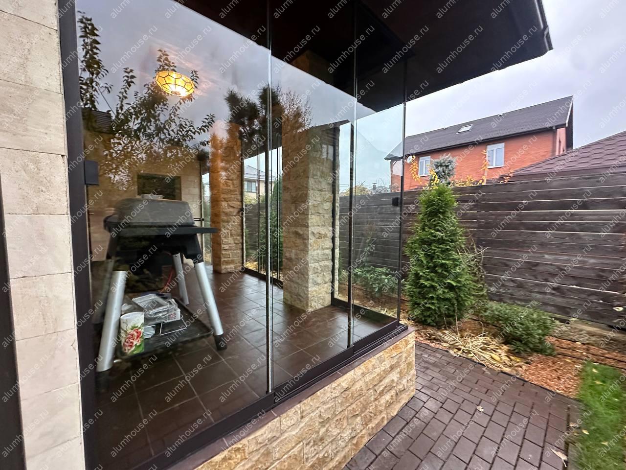 В данном проекте павильон выполнен из тёплого алюминиевого профиля и стеклопакетов, что обеспечивает отличную теплоизоляцию и возможность круглогодичного использования.