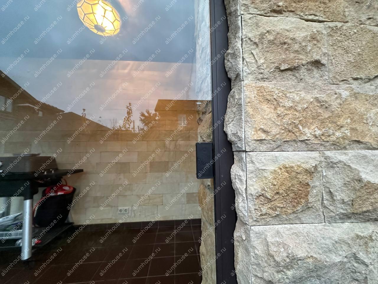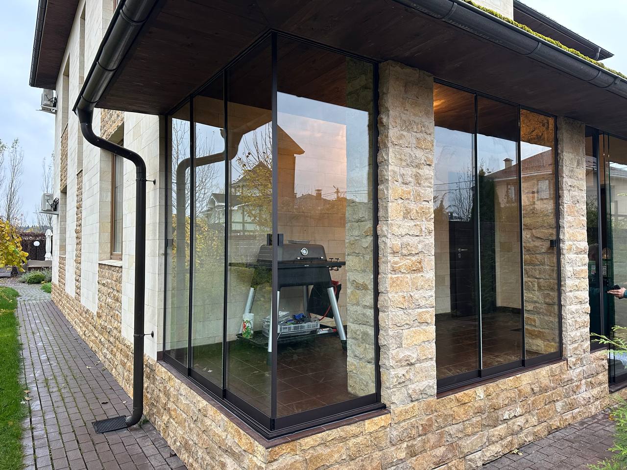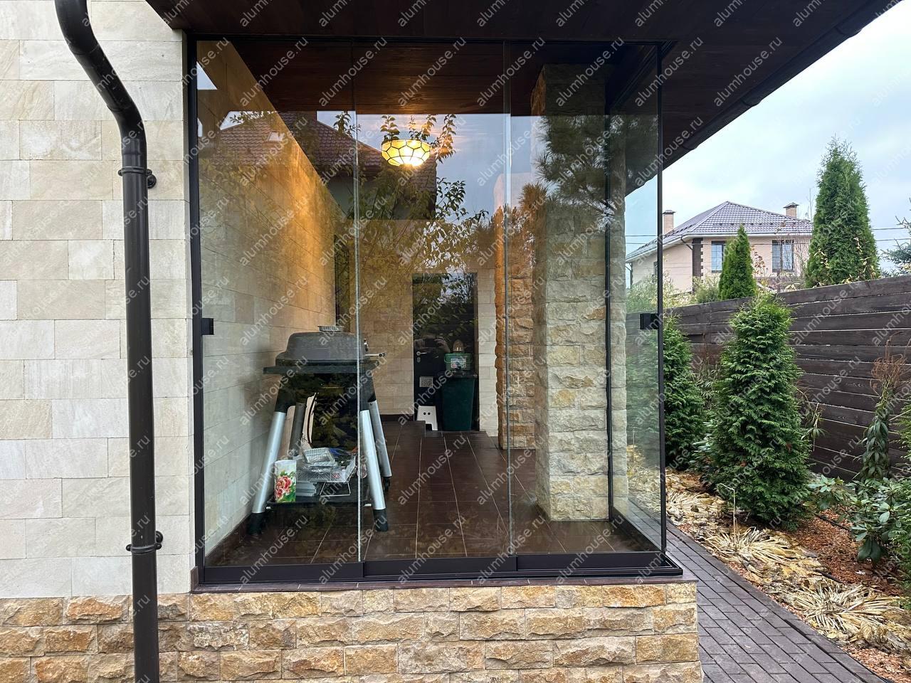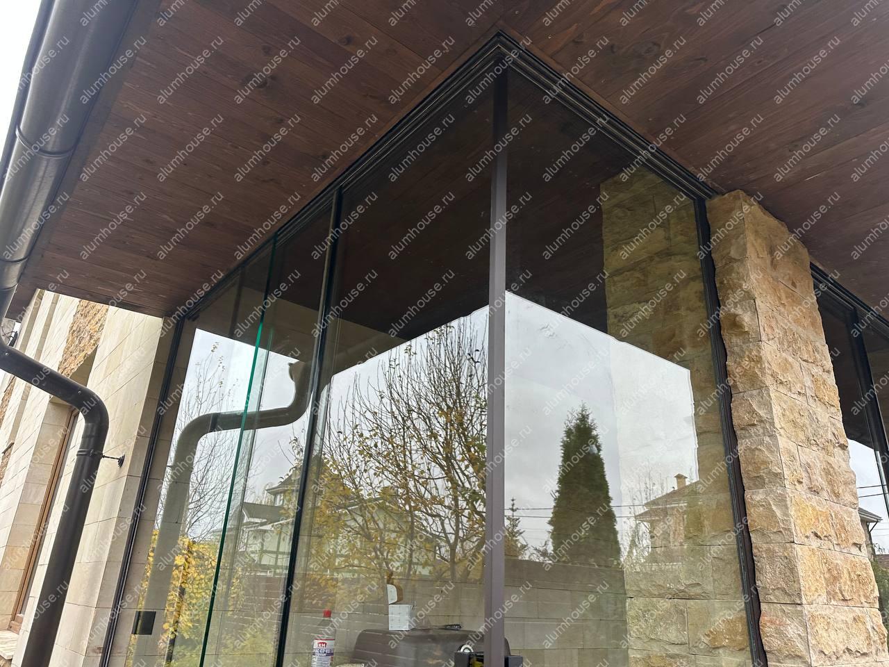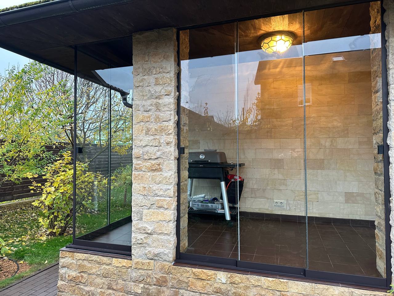 Безрамное раздвижное остекление веранды со стеклянным углом