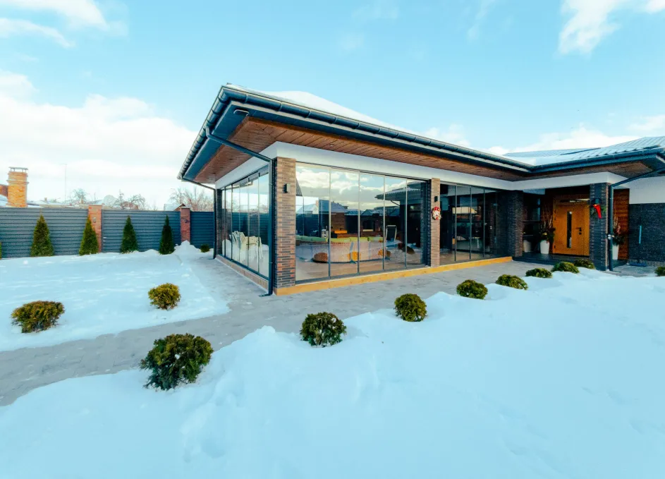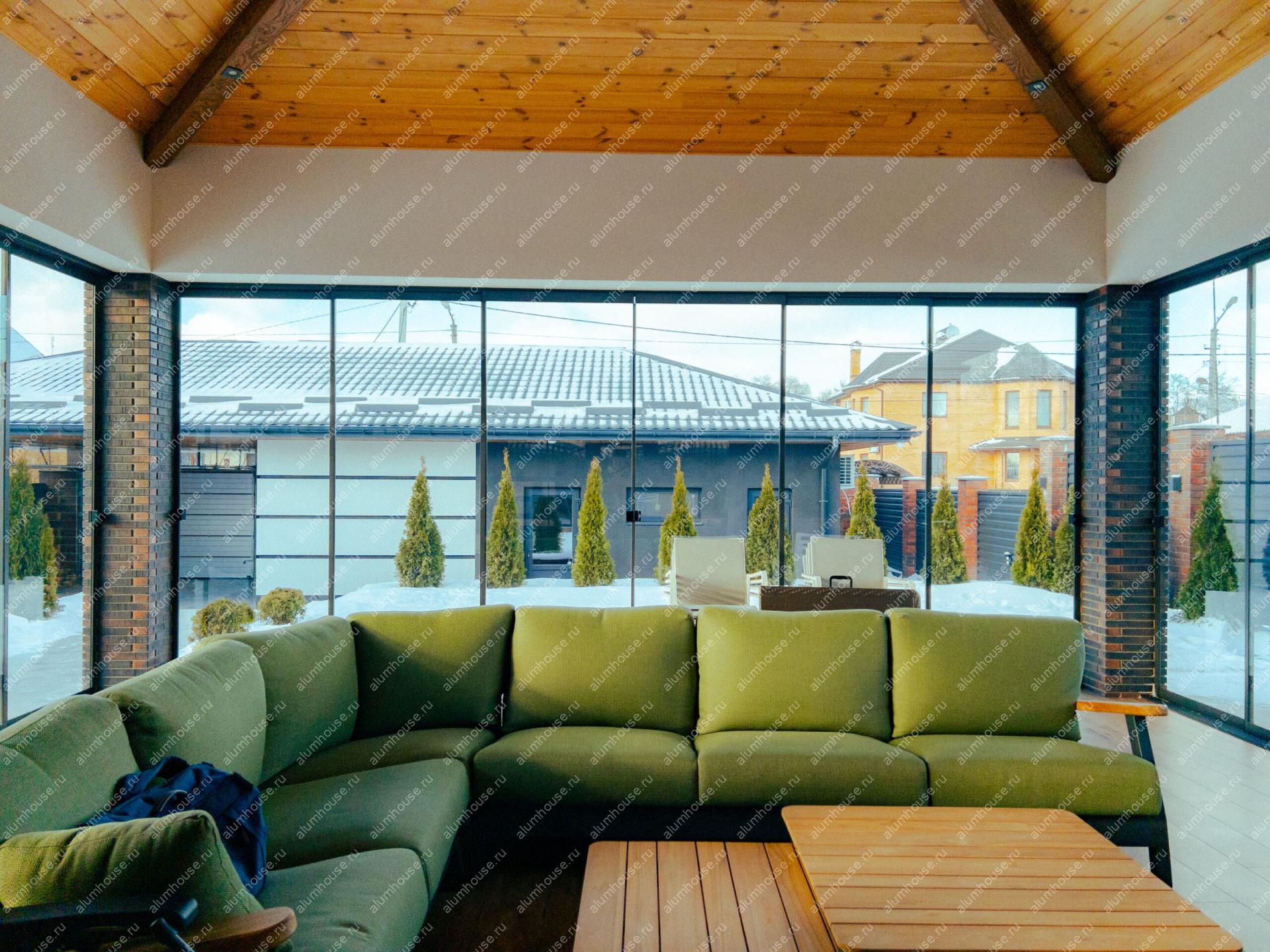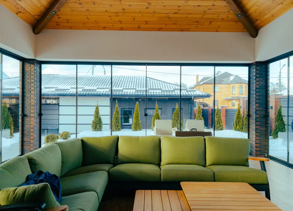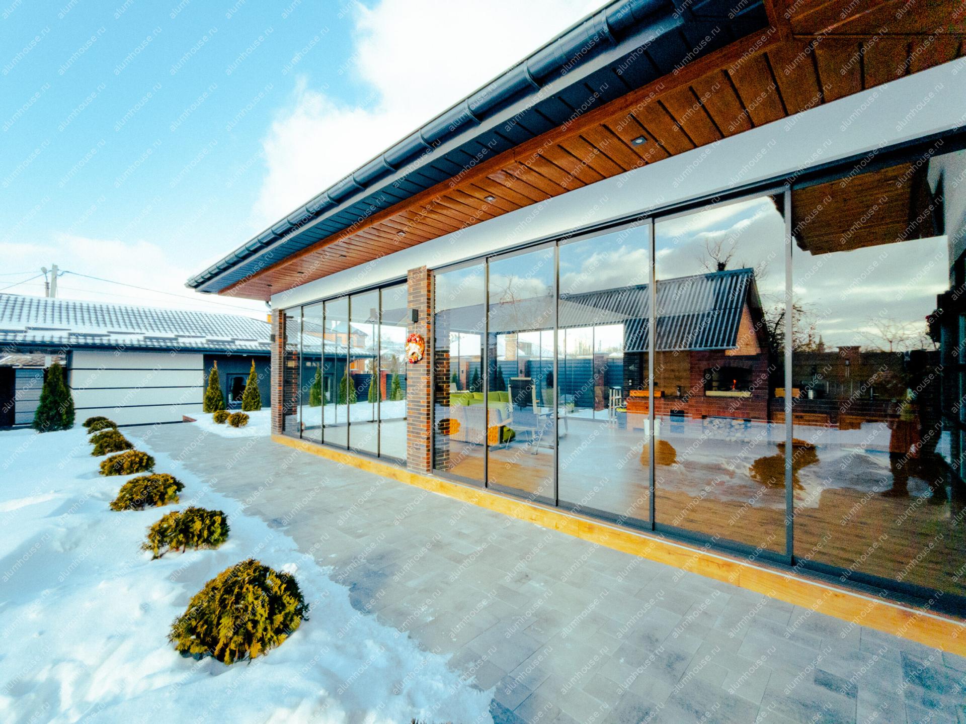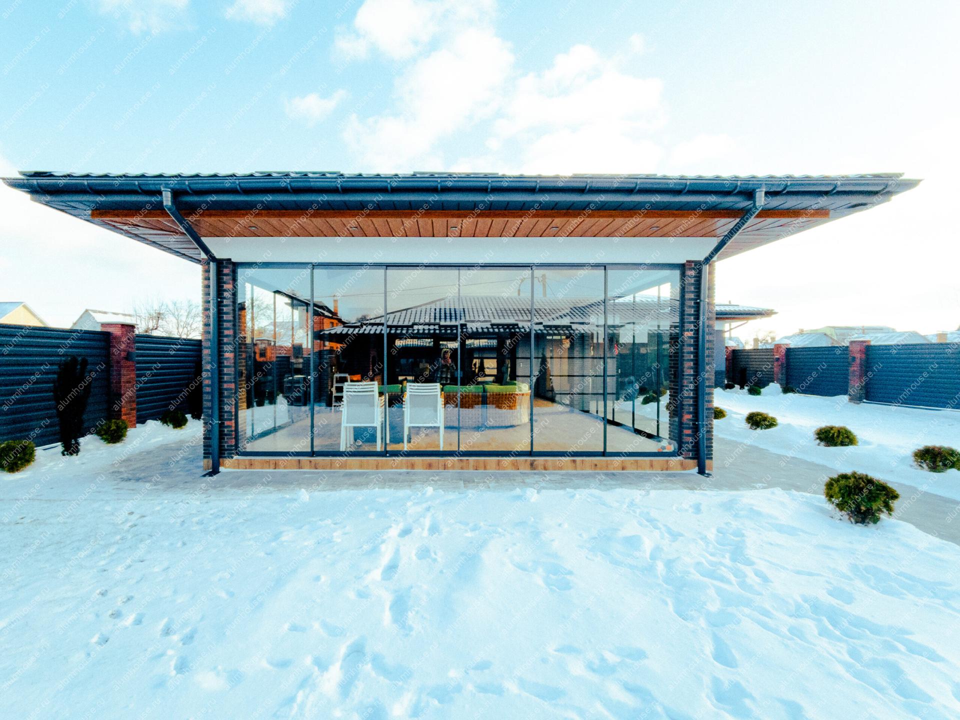 Безрамное остекление органично сочетается с древесиной и камнем, сохраняя лёгкость фасада и подчёркивая архитектуру беседки. Конструкция не «съедает» полезную площадь, свободно трансформируется под погоду и сценарии отдыха, что важно для сезонной эксплуатации. В результате получено практичное, долговечное и визуально лёгкое решение, которое расширяет сезон использования беседки и повышает комфорт повседневного отдыха