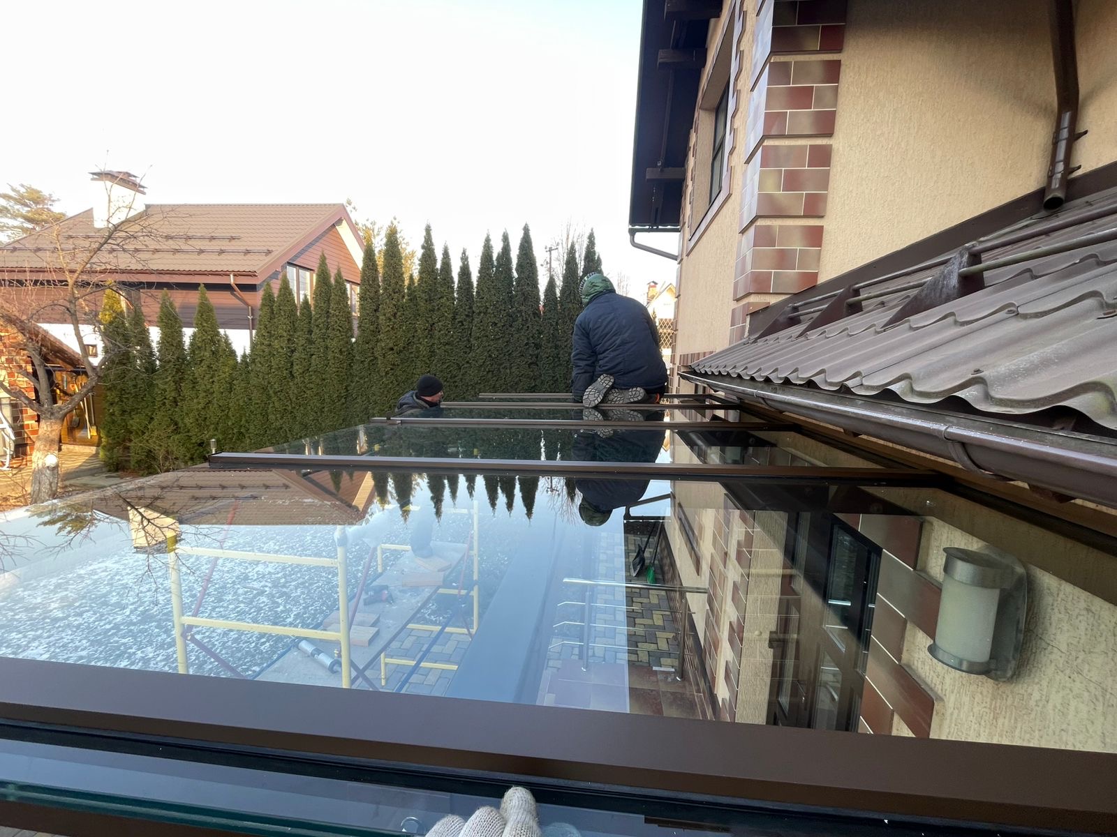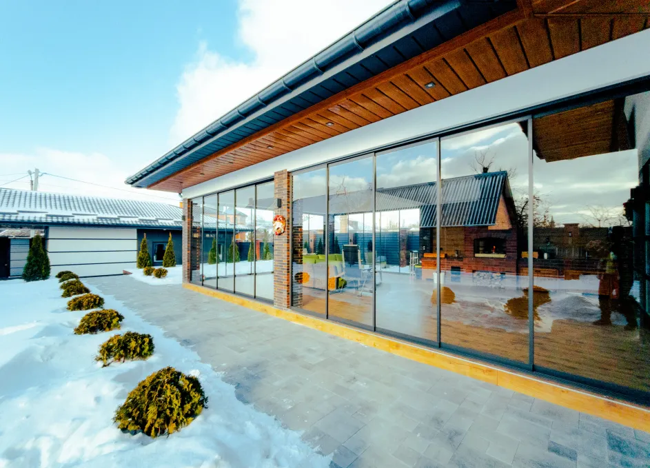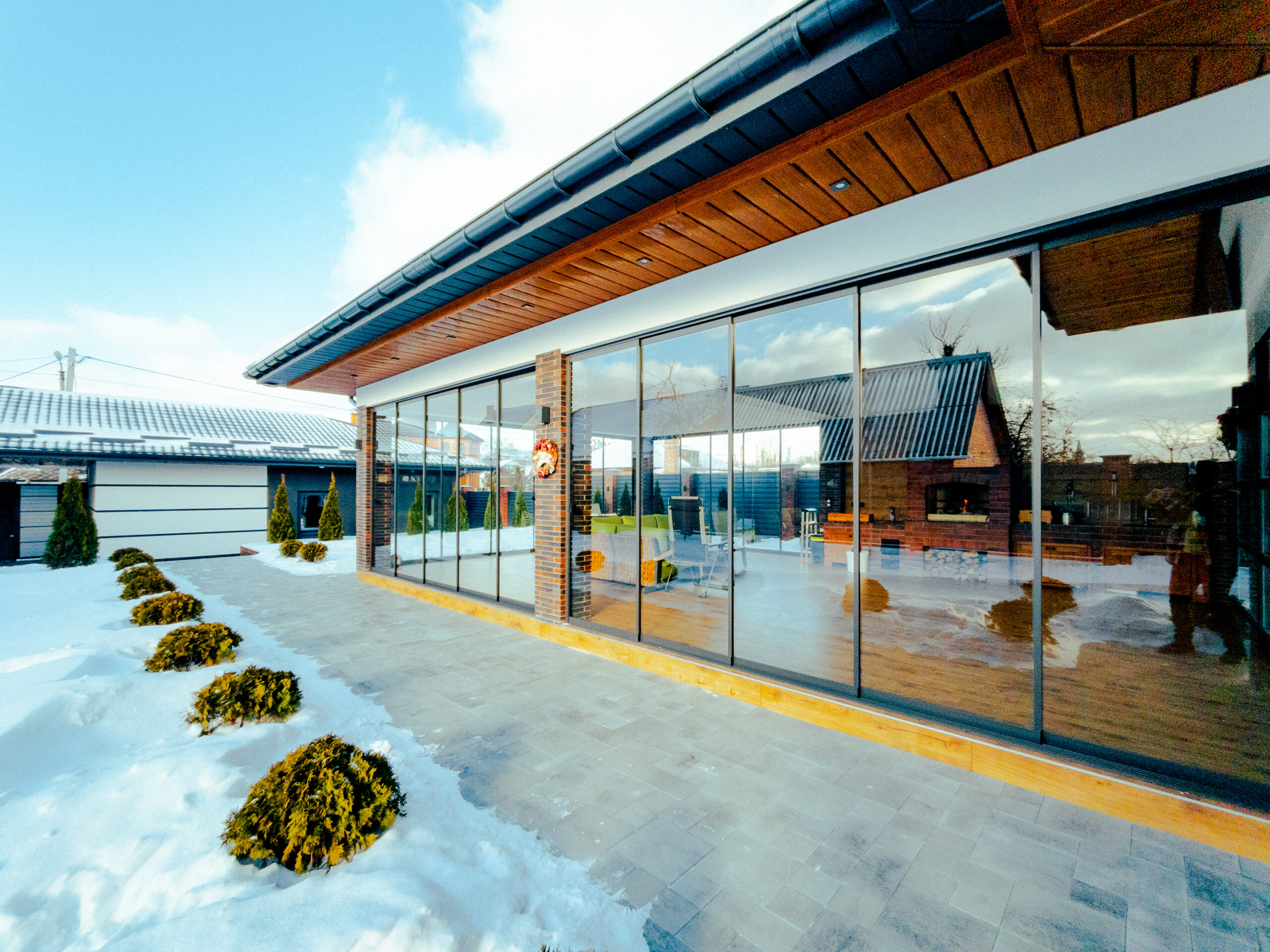Система смонтирована на нижнеопорных роликах с направляющими, а межстекольные щёточные и полимерные уплотнители снижают продувание и попадание влаги внутрь. В качестве заполнения применено закалённое стекло, доступное в прозрачном, тонированном или матовом исполнении для балансировки приватности и инсоляции. Узлы примыканий и дренаж организованы по периметру проёмов, что предотвращает затекания и продлевает ресурс фурнитуры.