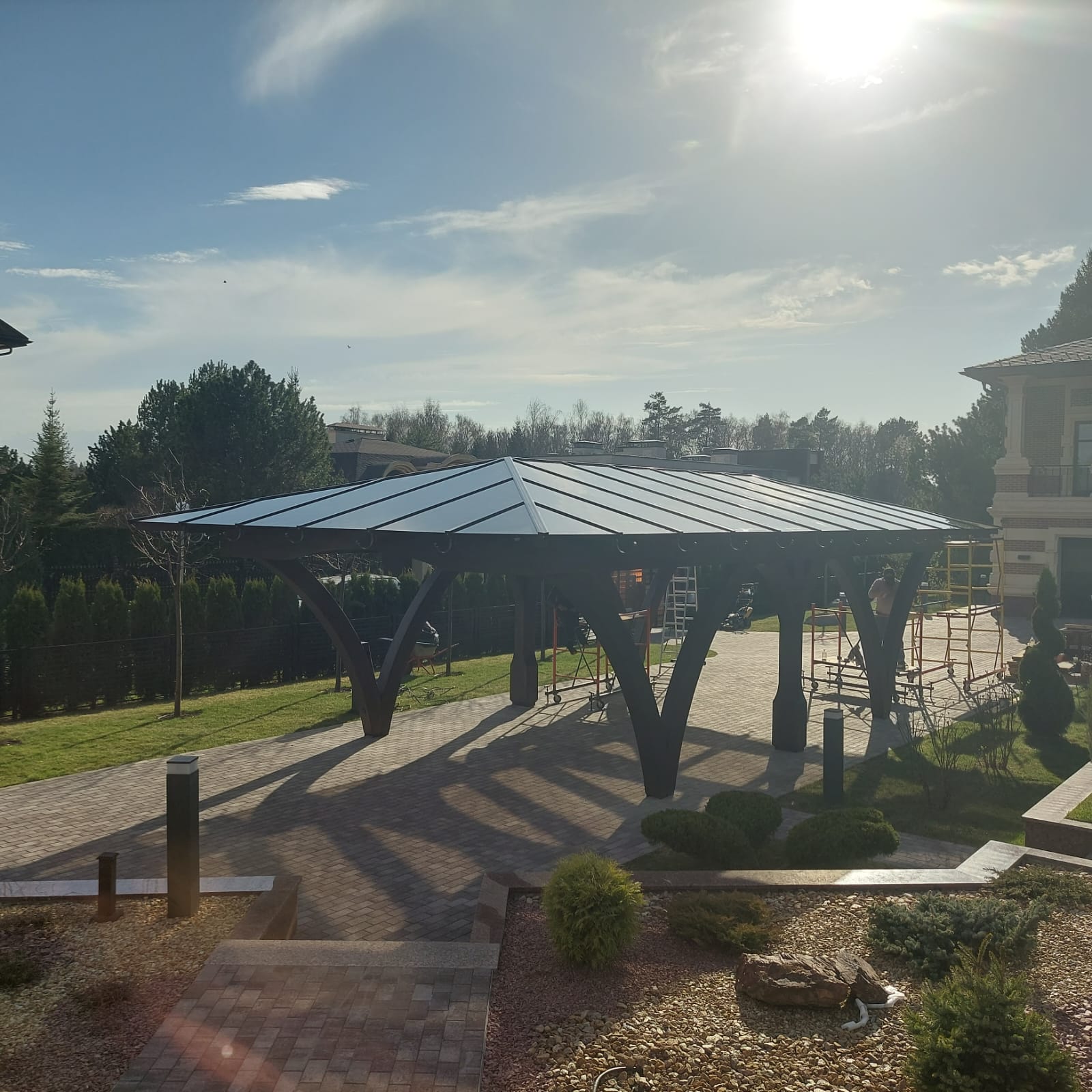 Выполнено строительство трёхскатного металлического навеса со стеклом в загородном доме.