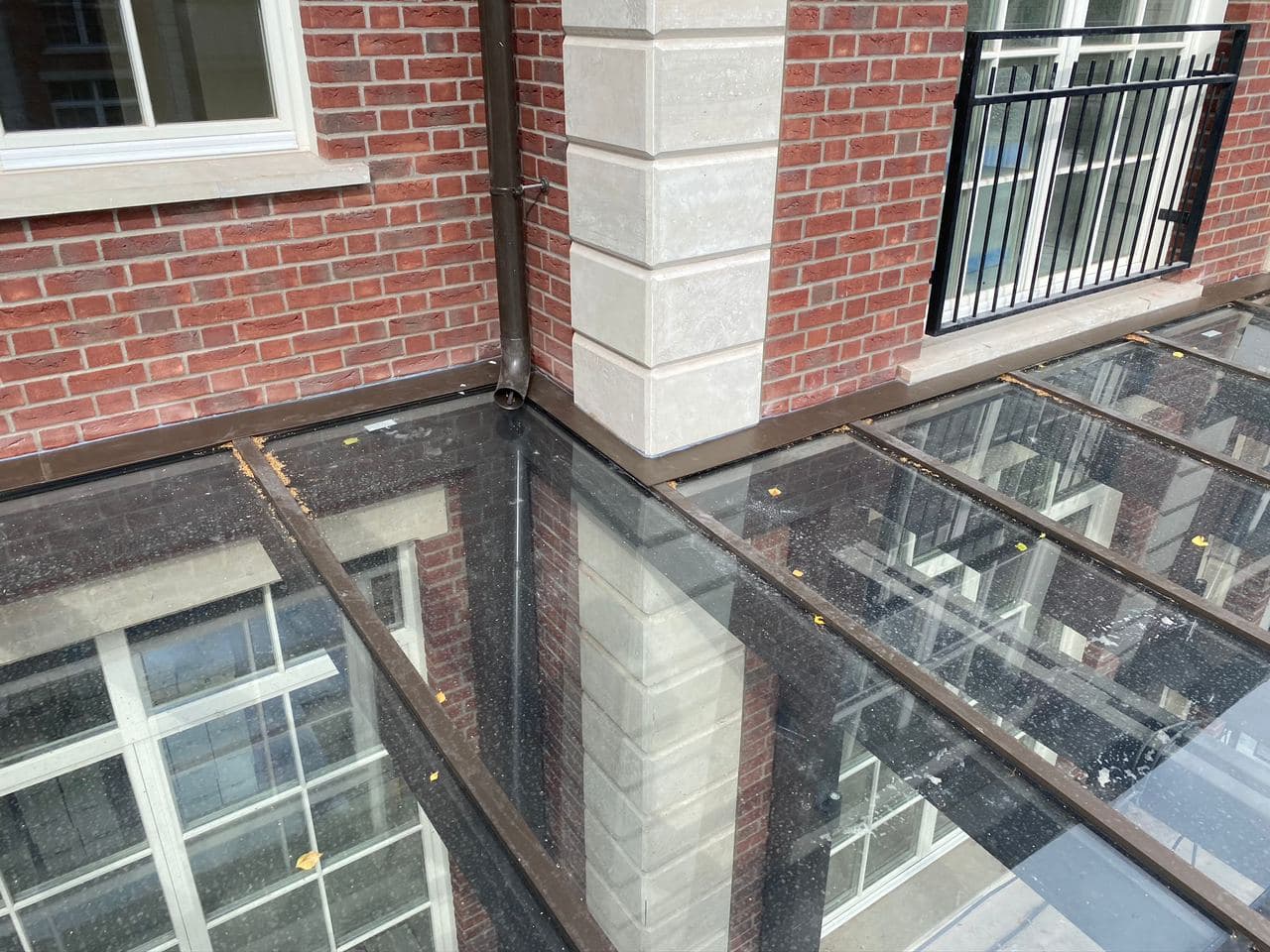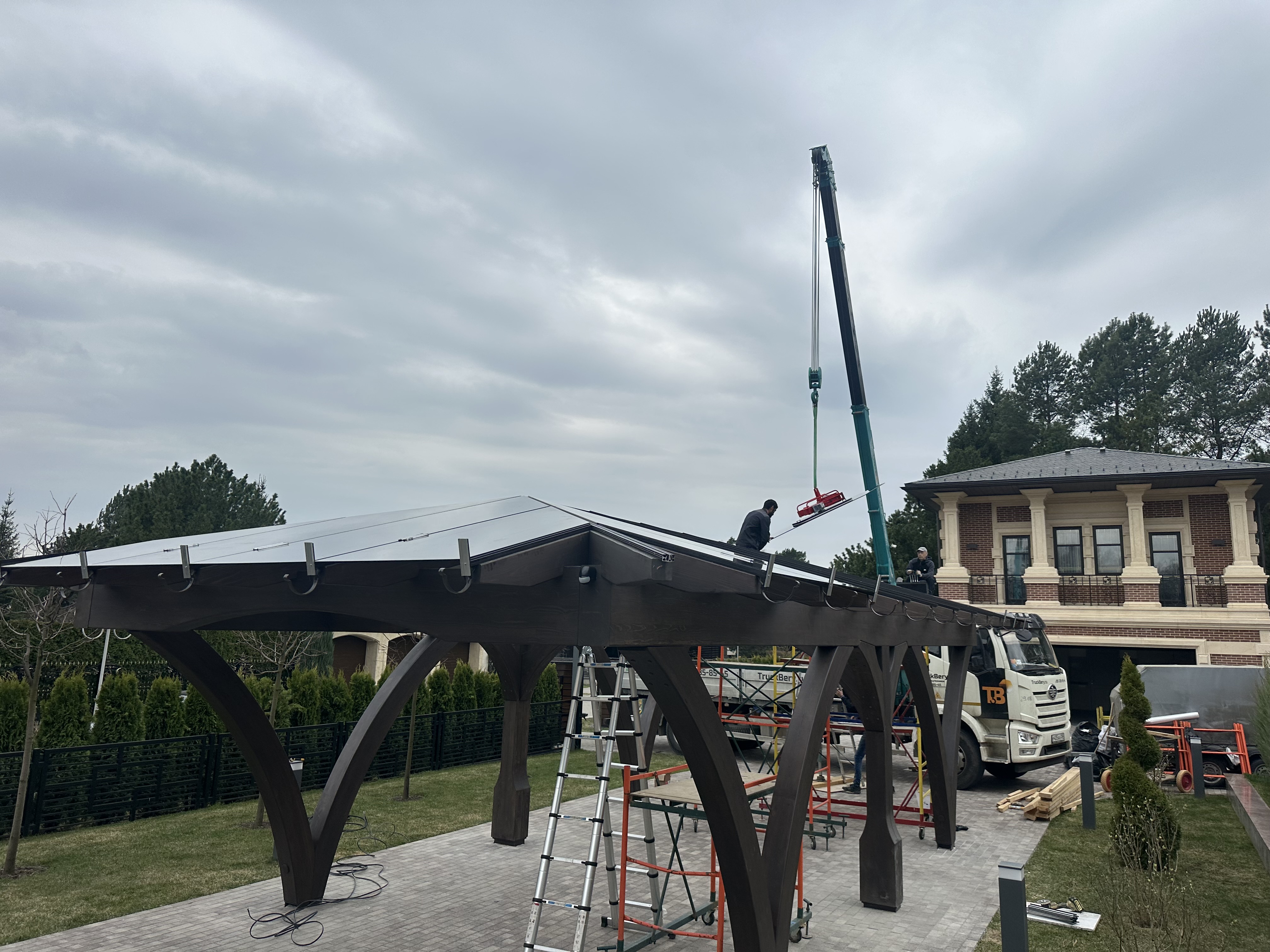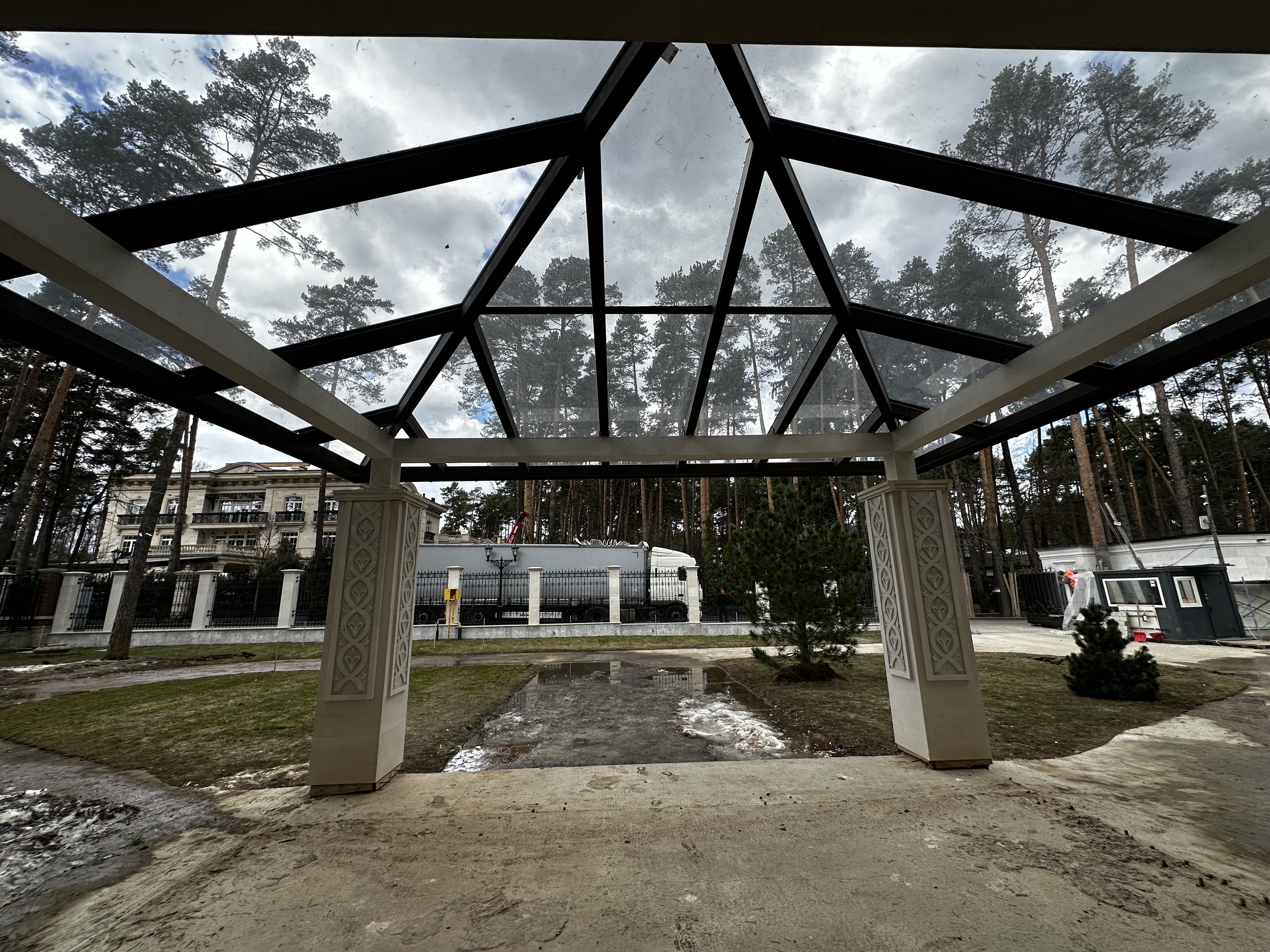 Остекление навеса по готовому каркасу выполнено закалённым триплексом с аккуратными прижимными профилями, обеспечивая лёгкий вид, защиту от непогоды и долговечность.