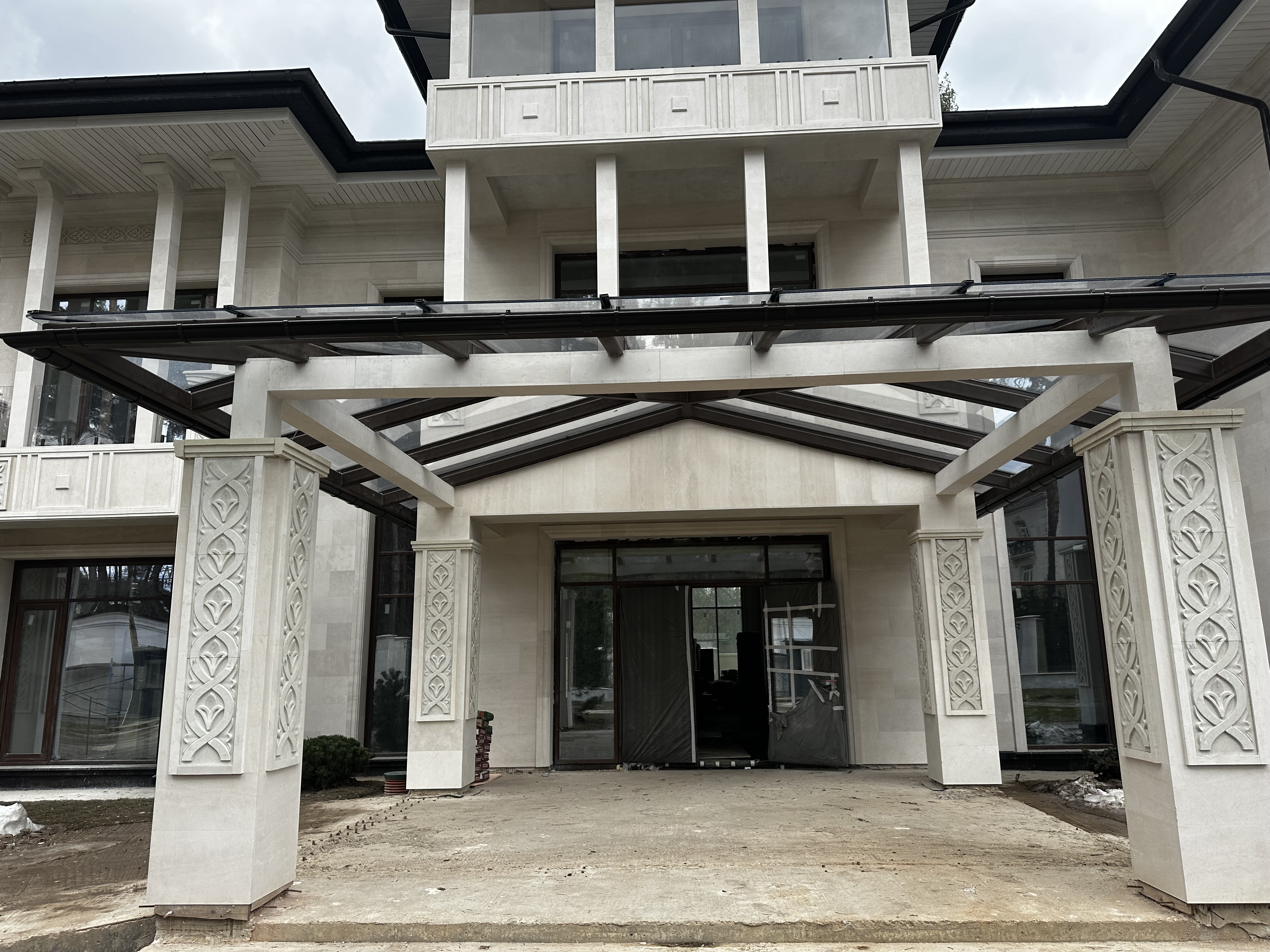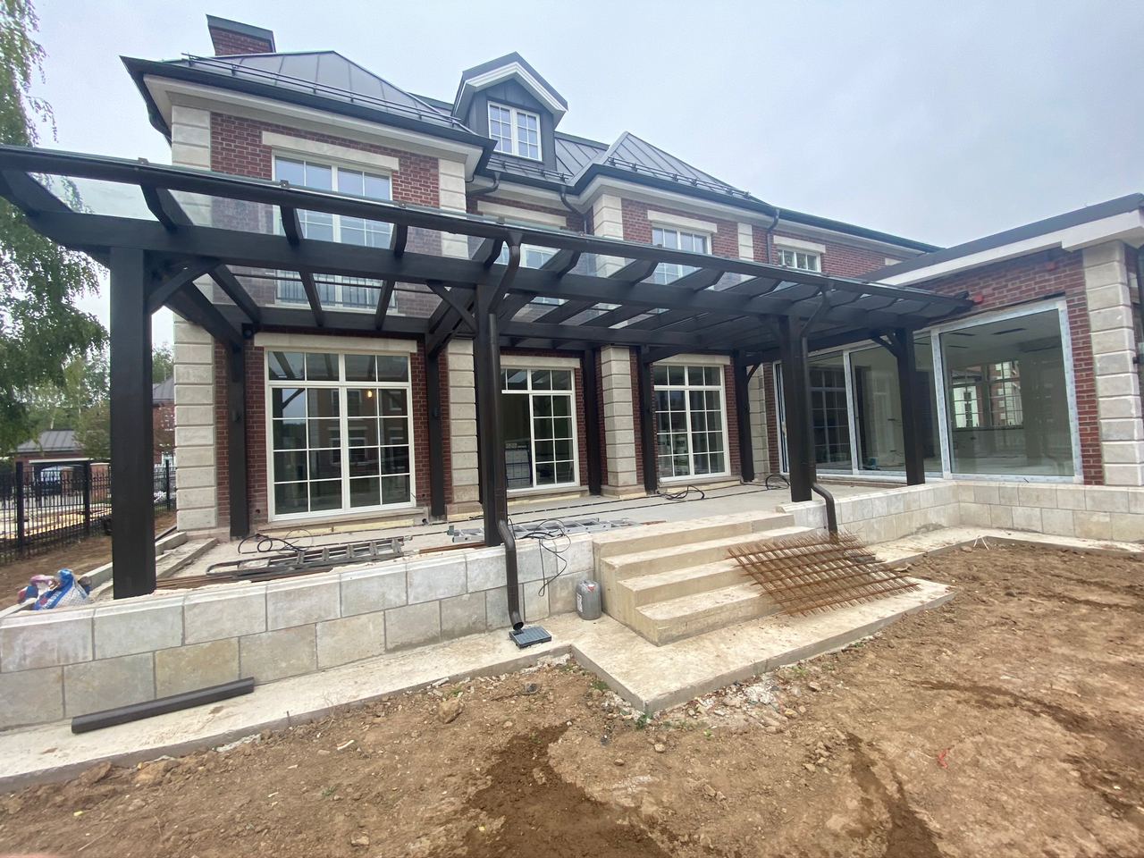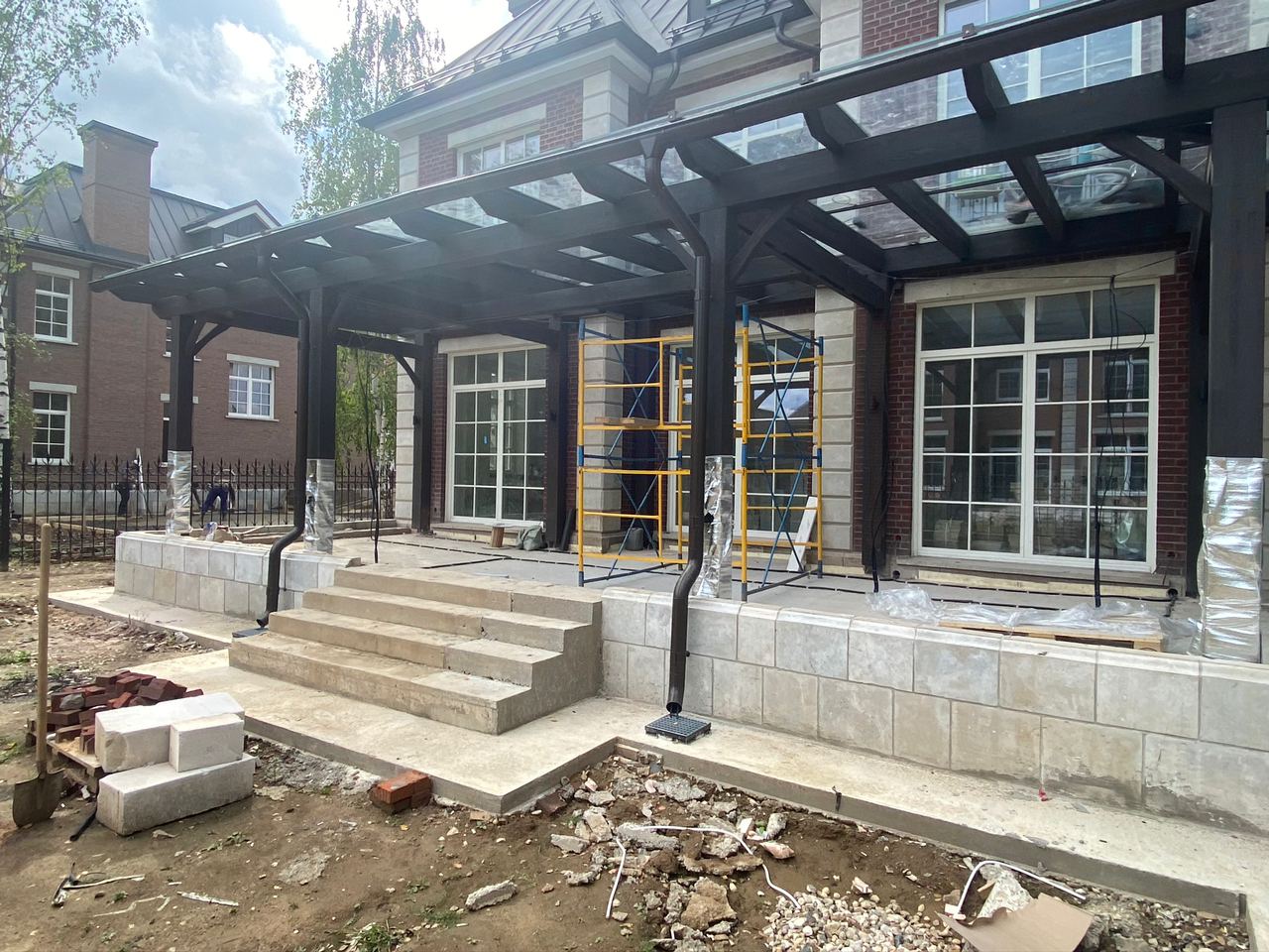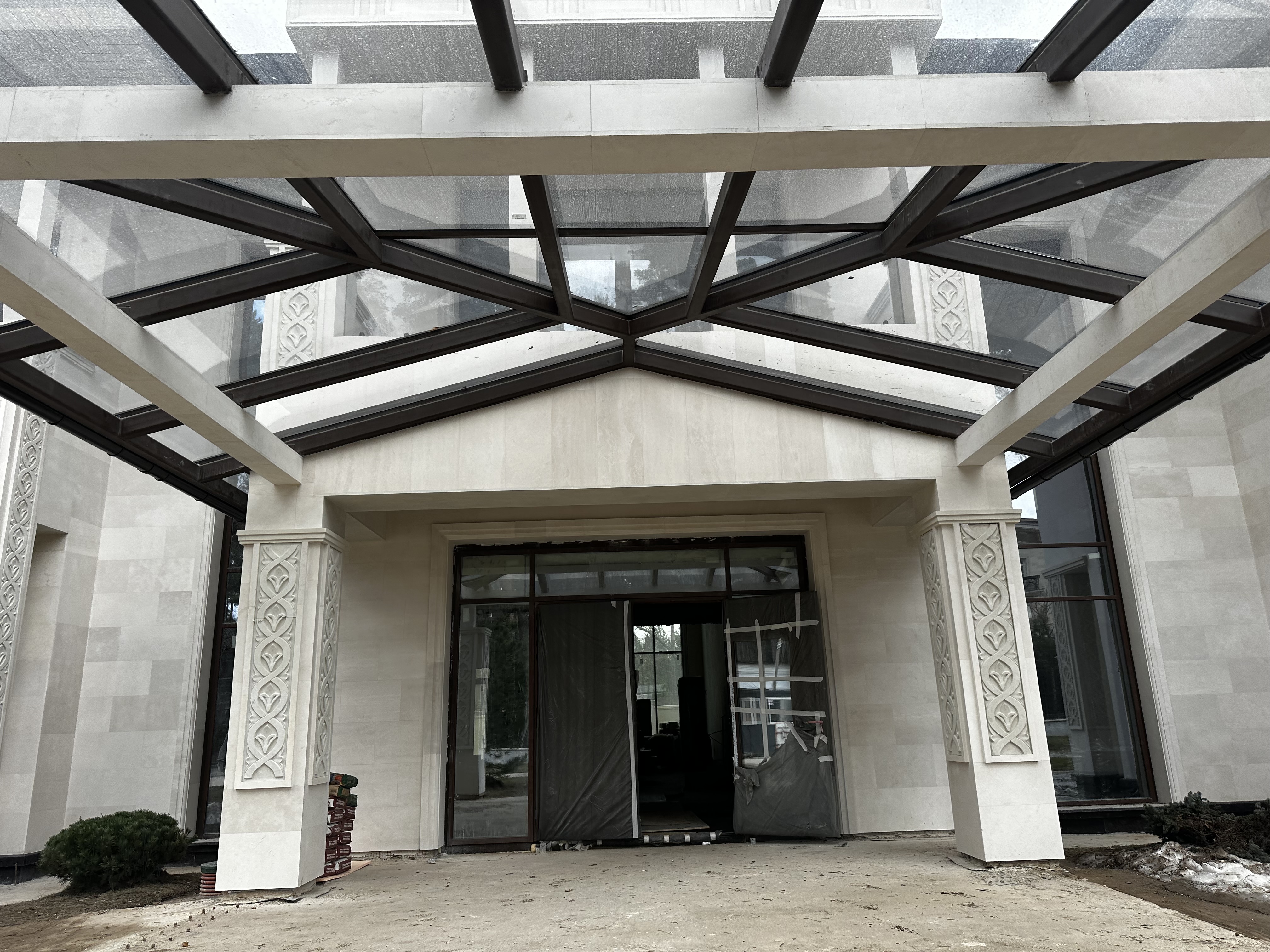 Остекление навеса по готовому каркасу выполнено закалённым триплексом с аккуратными прижимными профилями, обеспечивая лёгкий вид, защиту от непогоды и долговечность.