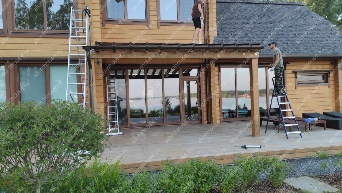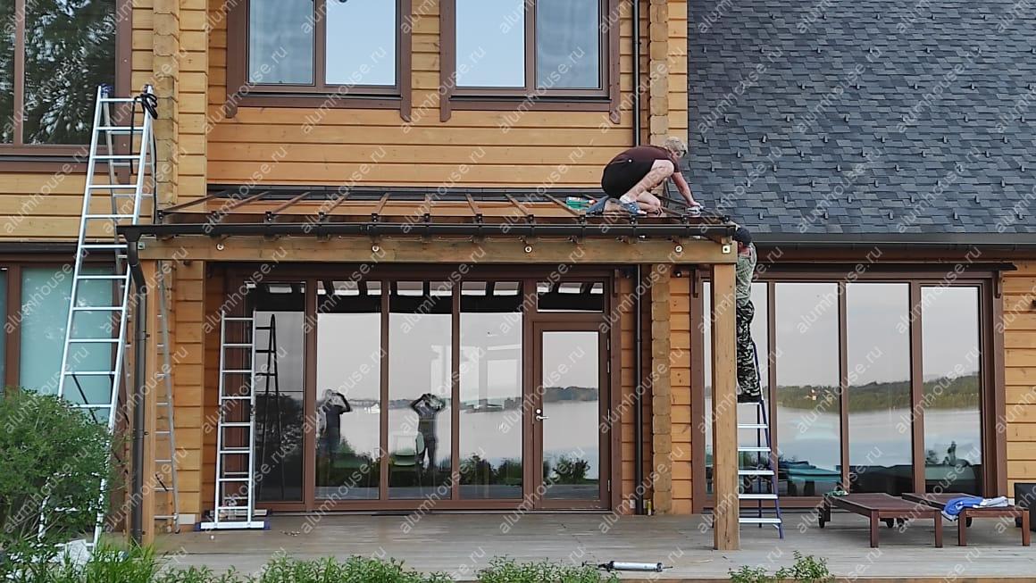 Остекление деревянной перголы выполнено по существующему каркасу с сохранением авторской геометрии и пропорций, что позволило ускорить монтаж и минимизировать вмешательство в конструкцию. Прозрачные панели сформировали защищённое пространство от ветра и осадков, не перекрывая свет и вид на участок. Аккуратные примыкания поддержали лёгкий силуэт и визуальную чистоту линий.