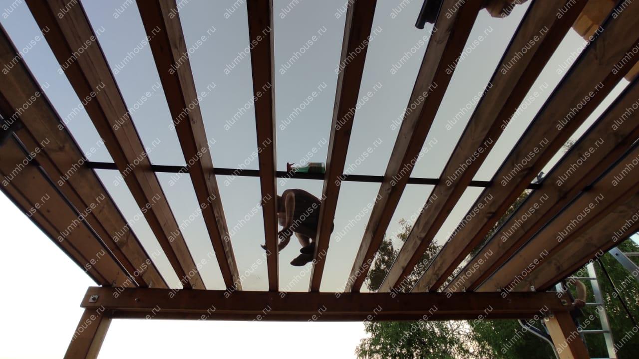 Крепёжные узлы и схема водоотвода увязаны с пролётами перголы, обеспечивая герметичность стыков и стабильный отвод влаги. Минималистичные стеклянные плоскости подчёркивают фактуру древесины и не утяжеляют архитектуру сада. Выбранная конфигурация секций сохраняет удобство прохода и позволяет гибко регулировать степень открытости.