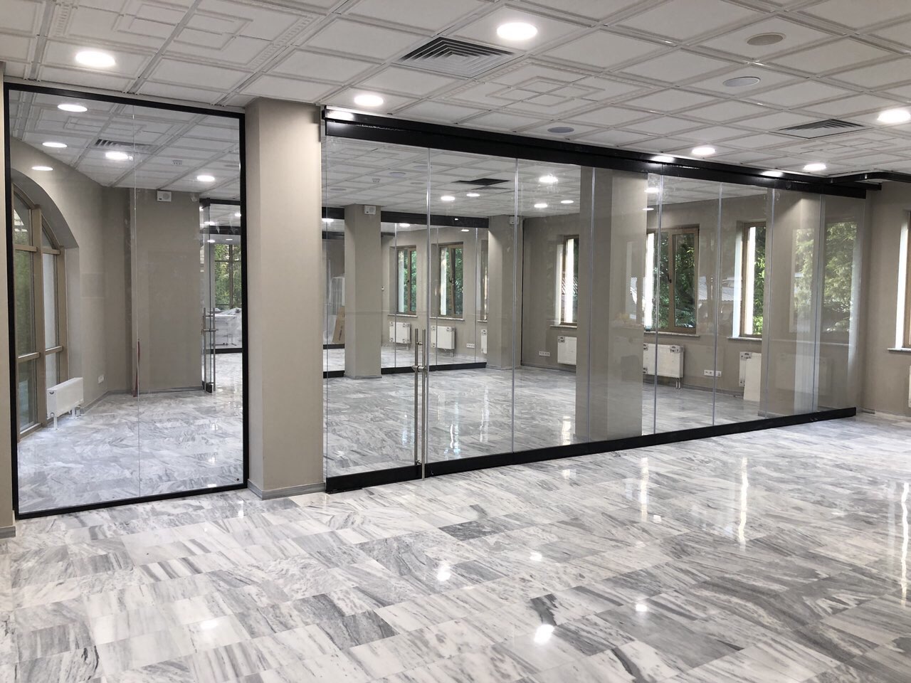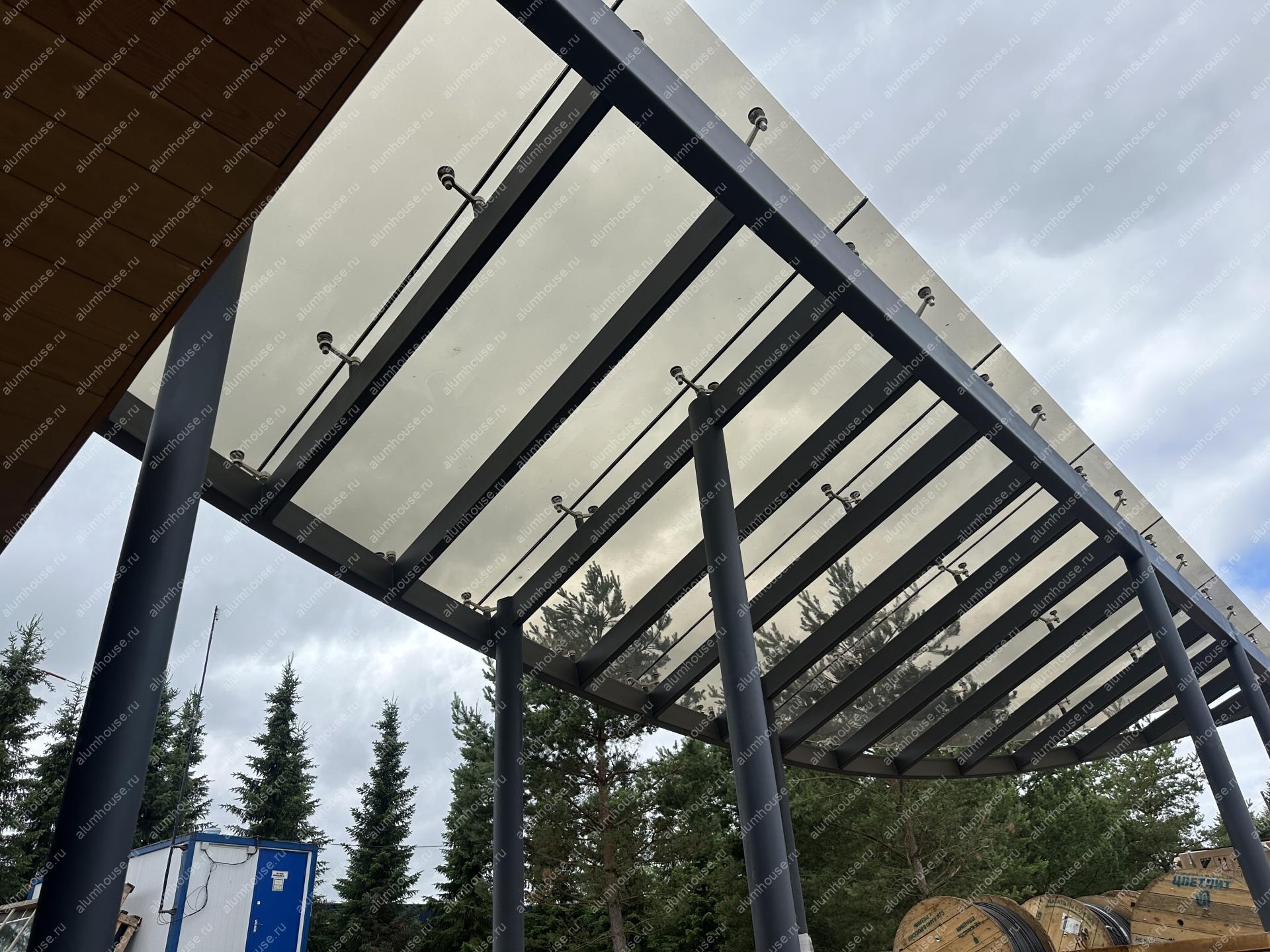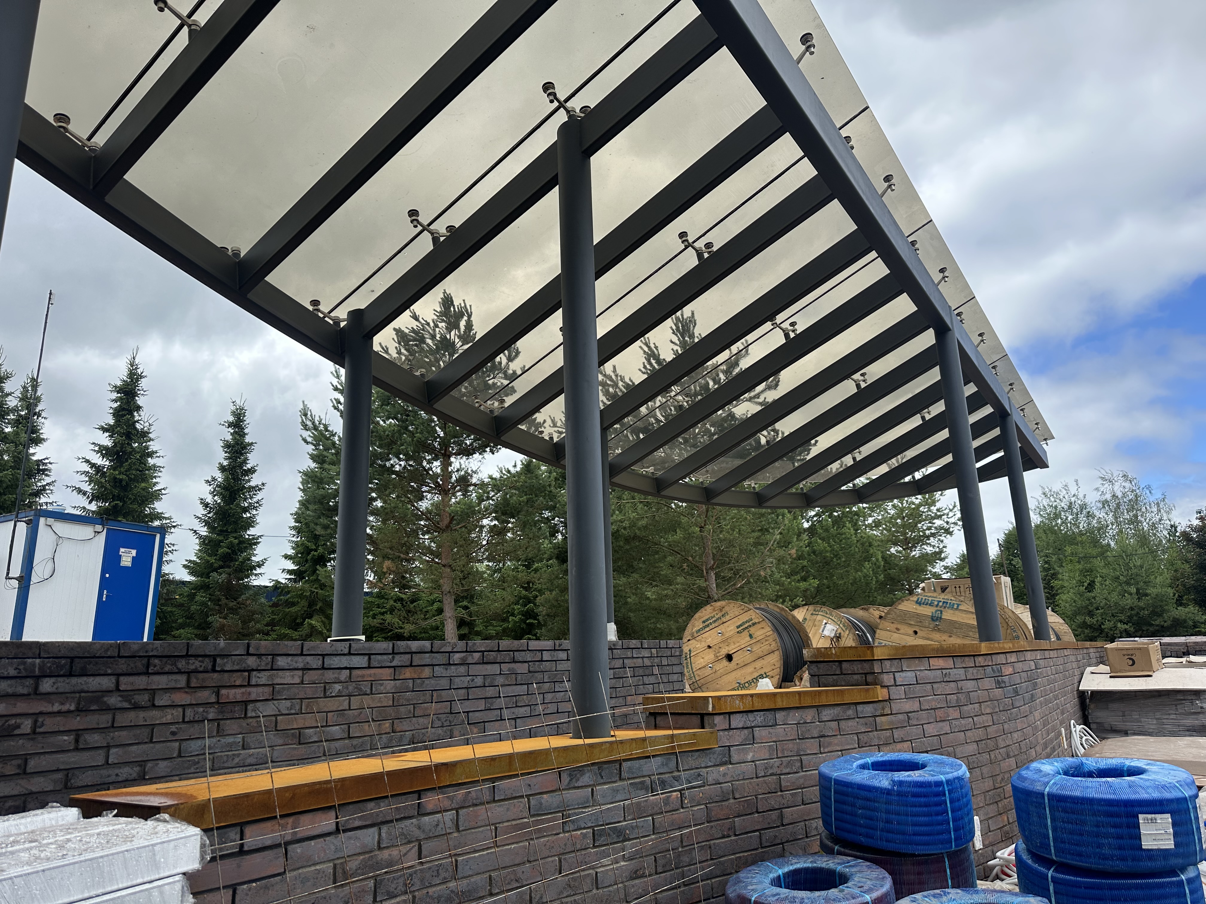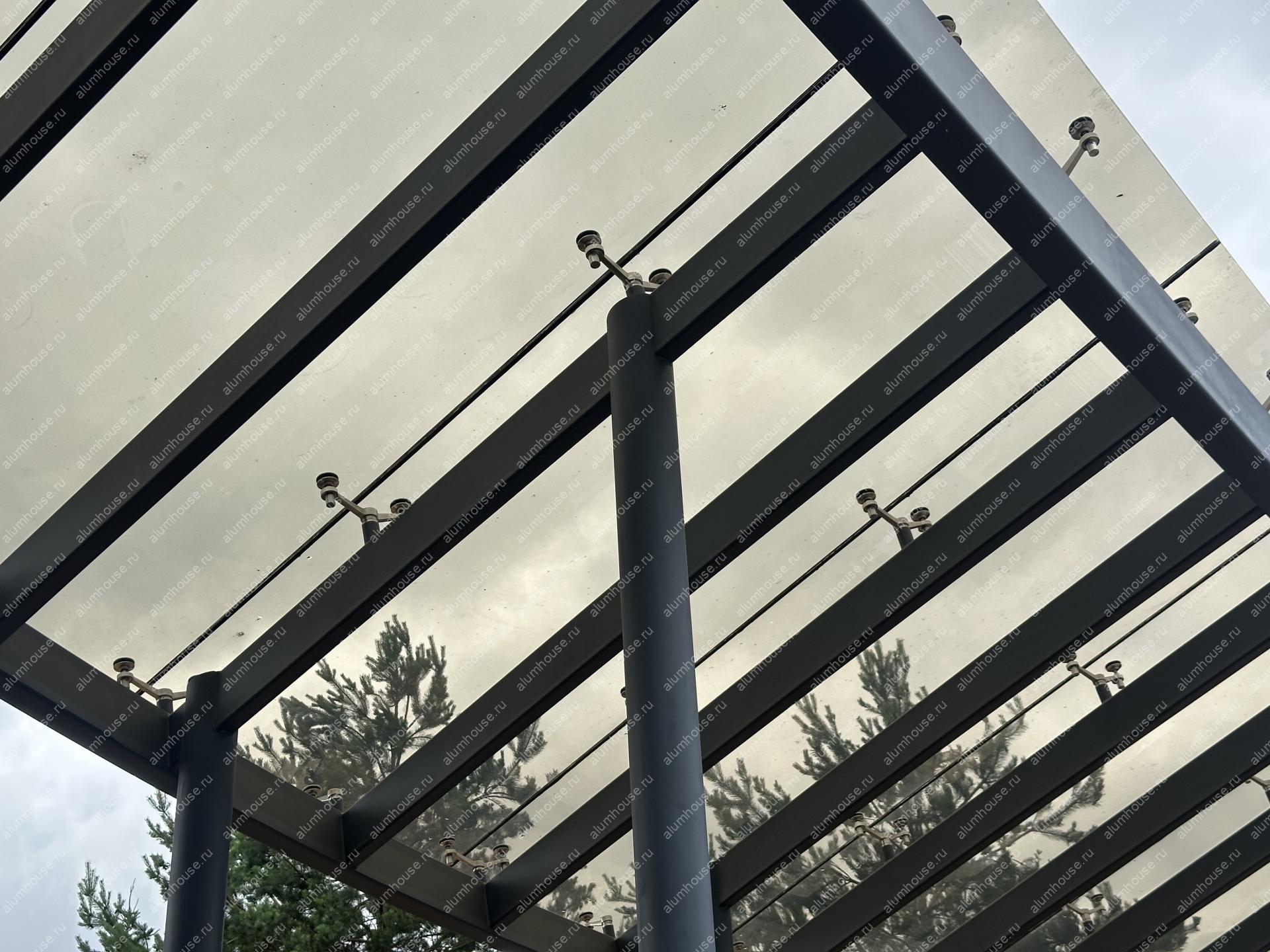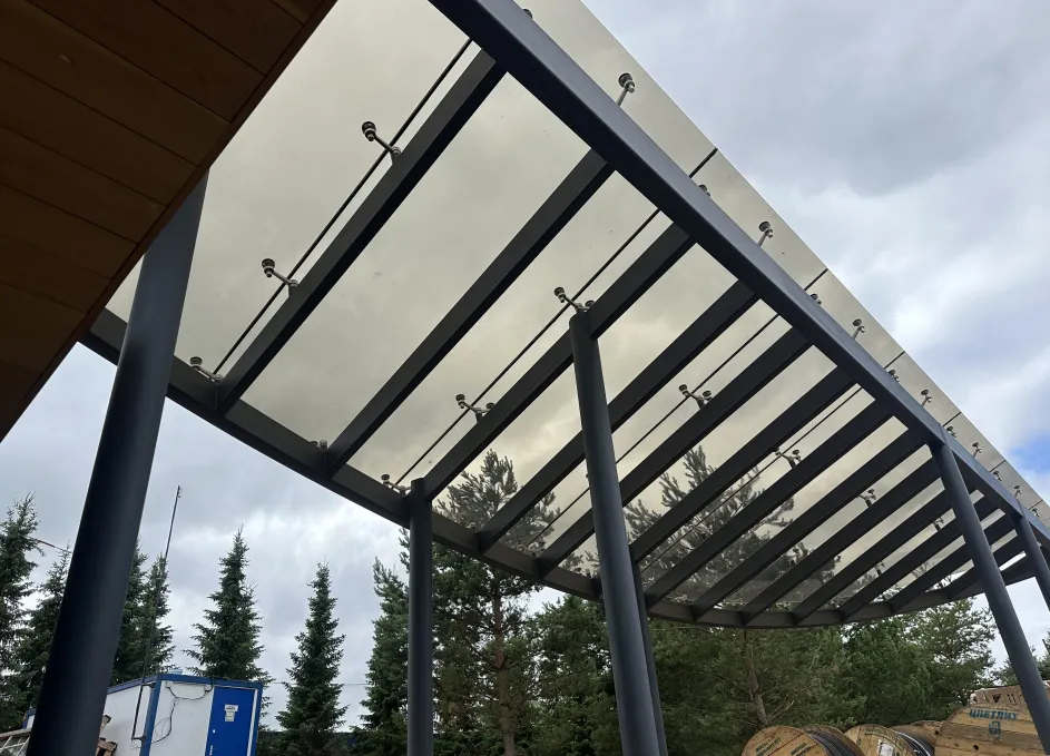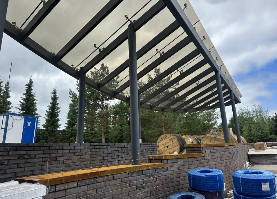 В проекте реализован отдельно стоящий стеклянный навес на спайдерном креплении из нержавеющей стали: панели закалённого триплекса закреплены точечными рутелями к спайдерам, установленным на самостоятельные опоры, что обеспечивает максимальную прозрачность и лёгкость образа со всех сторон. Несущая схема выполнена на стальных стойках/раме с вантами по необходимости, а шарнирные узлы компенсируют температурные деформации и позволяют точно выверить плоскость остекления.