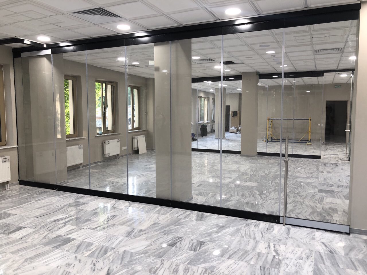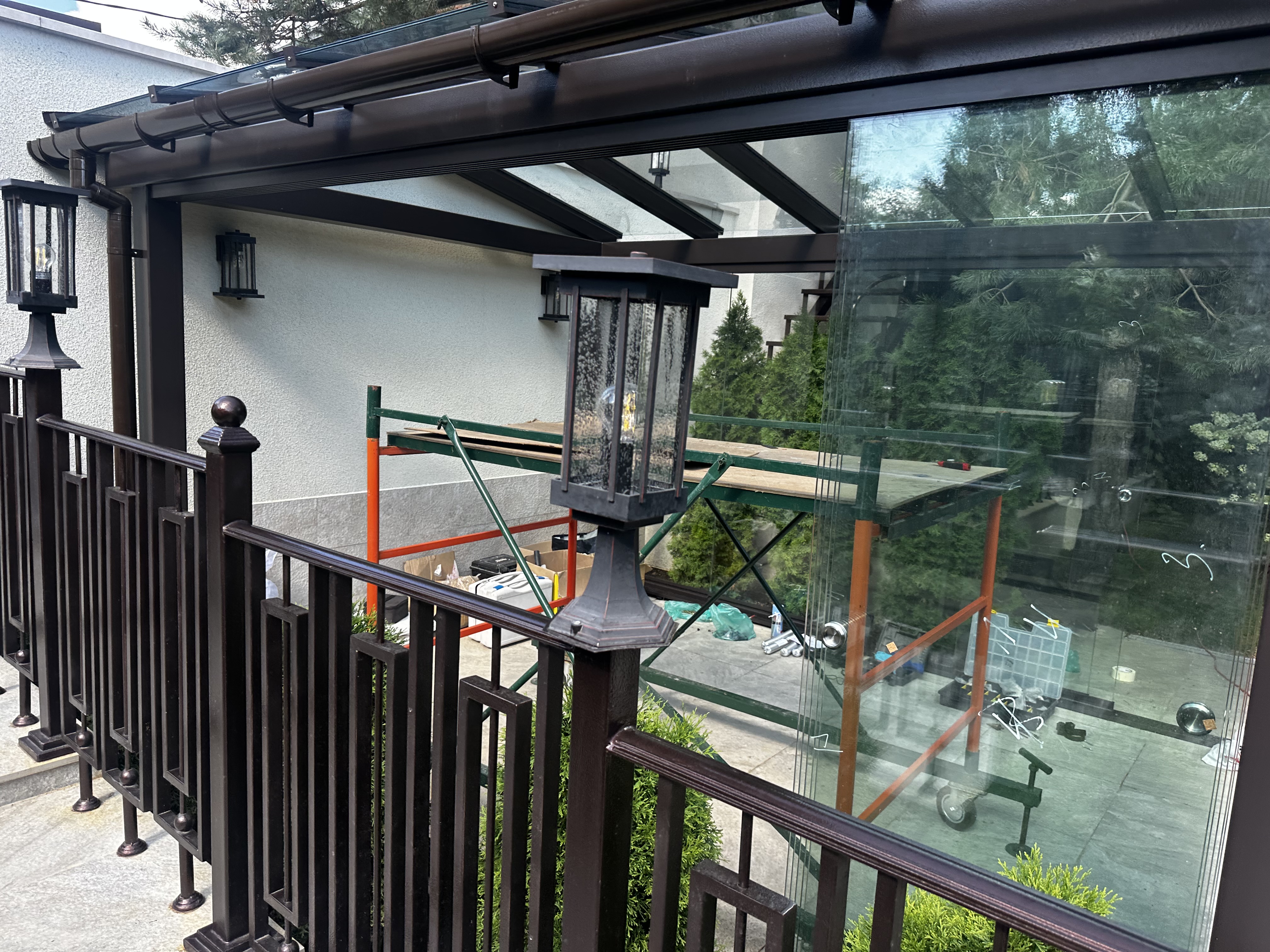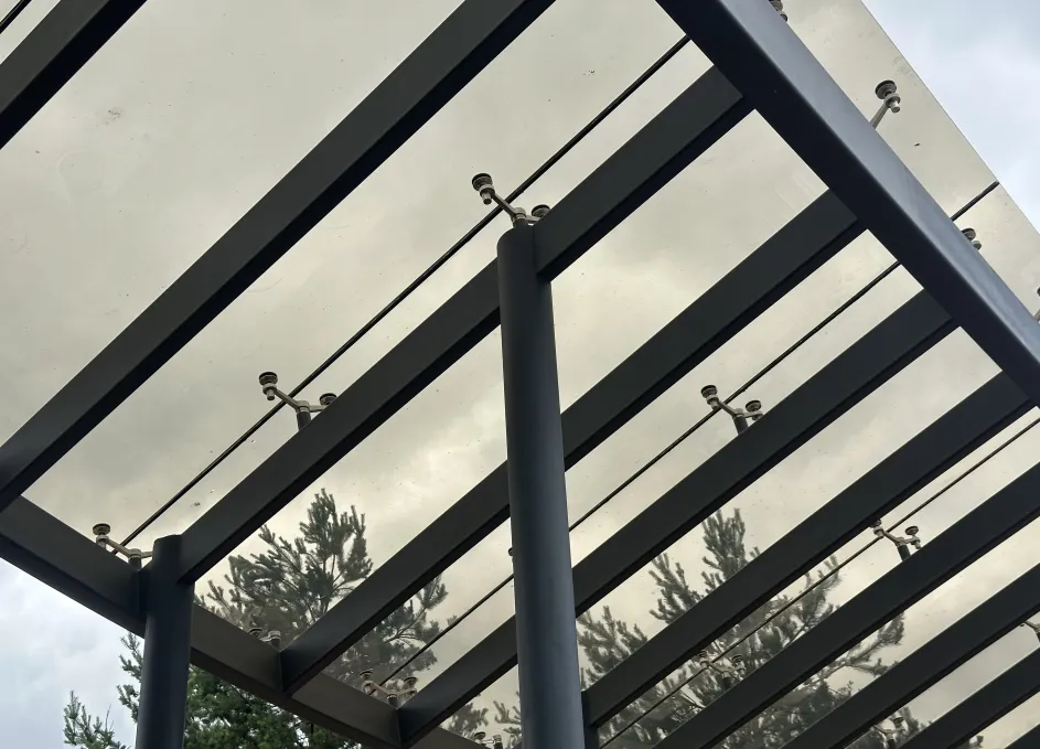Кровля спроектирована под местные ветровые и снеговые нагрузки, шаг точек крепления и толщины триплекса подобраны расчётно, чтобы исключить прогибы и вибрации. По нижней кромке организован скрытый водоотвод с направленным сливом, кромки защищены уплотнителями, а все элементы из нержавеющей стали имеют стойкую финишную обработку для эксплуатации на улице.