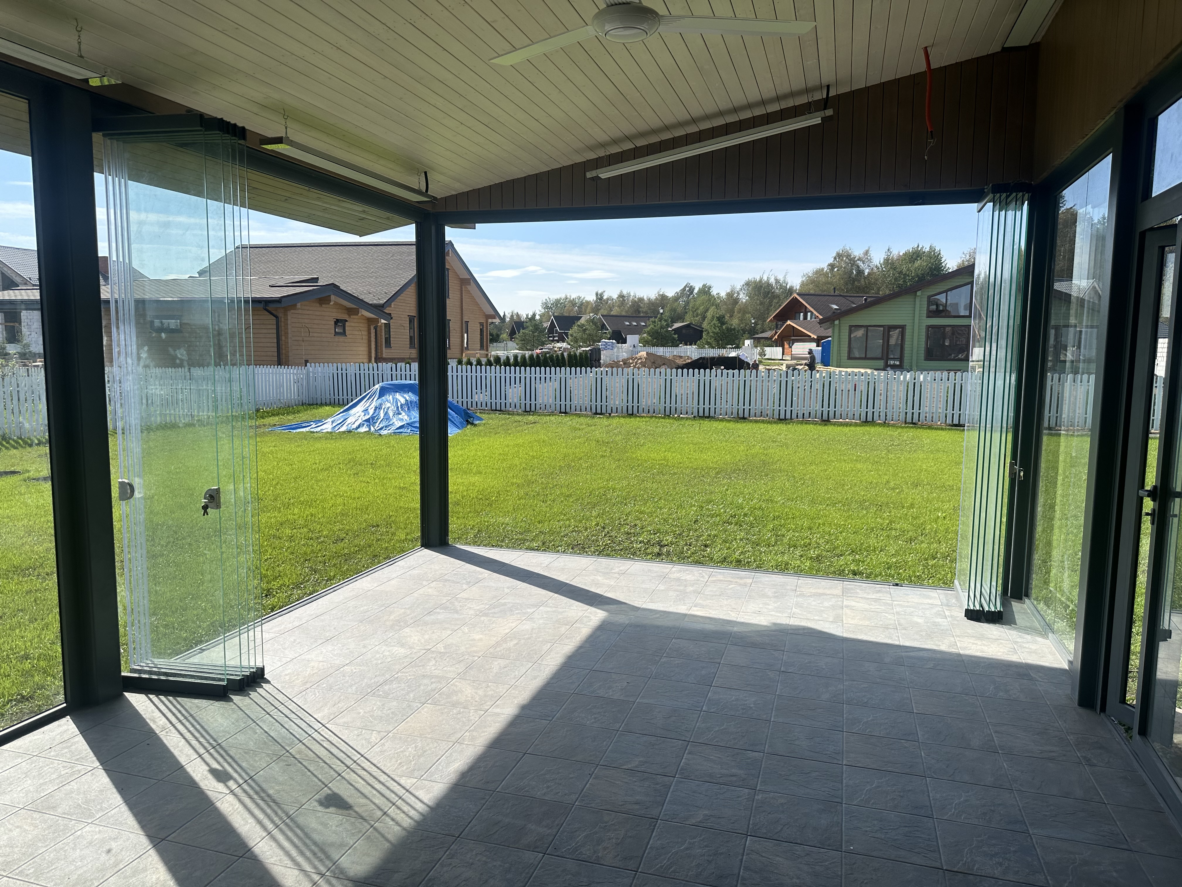 Поворотно‑складная безрамная система Albert Genau Tiara обеспечивает панорамный вид и полное раскрытие террасы за счёт компактного складывания «книжкой».