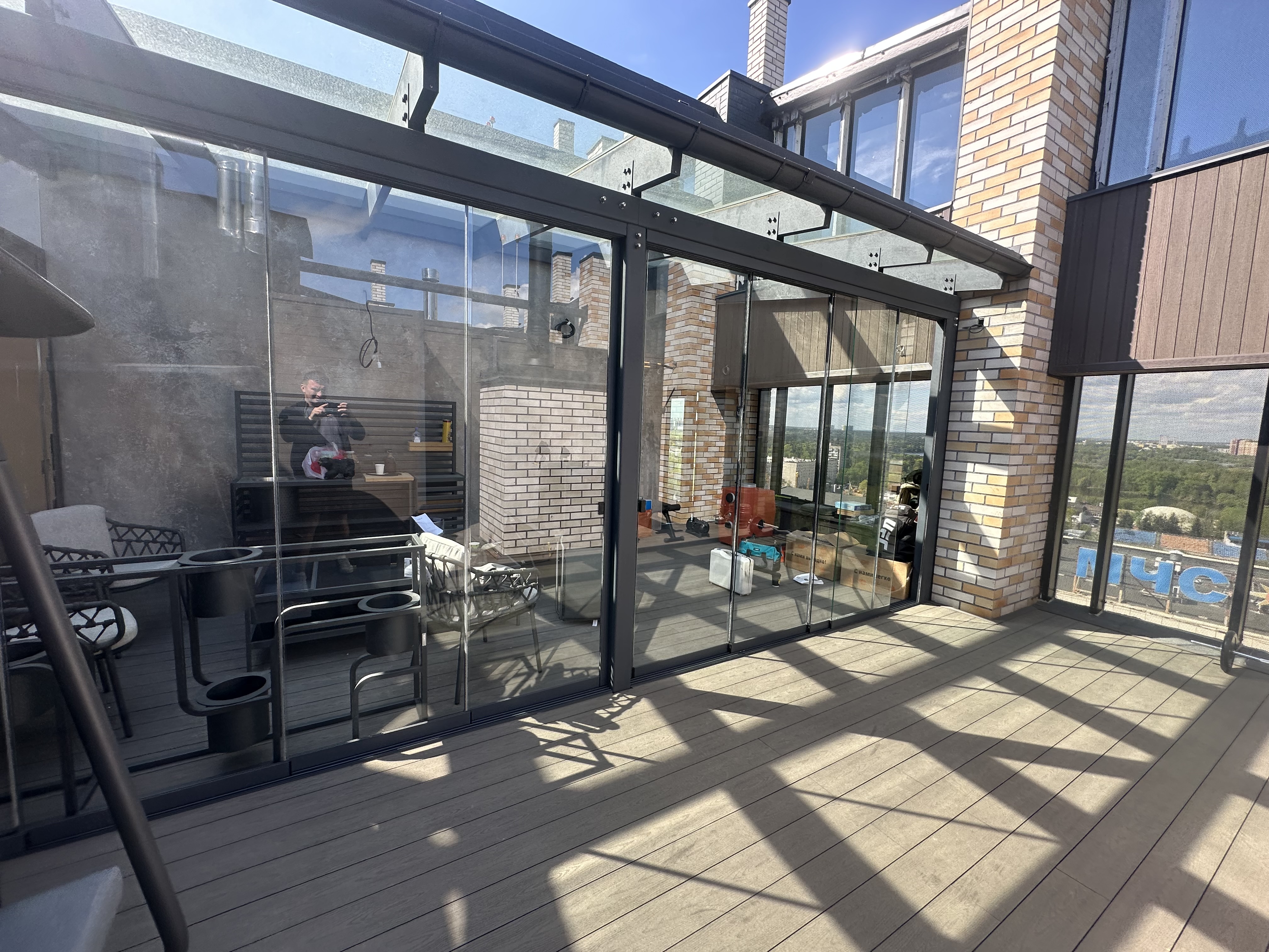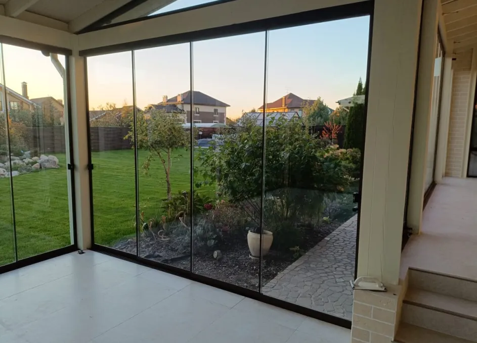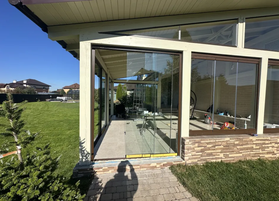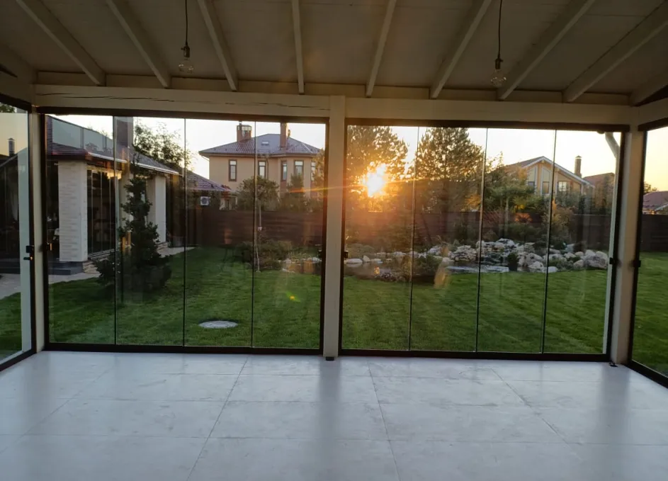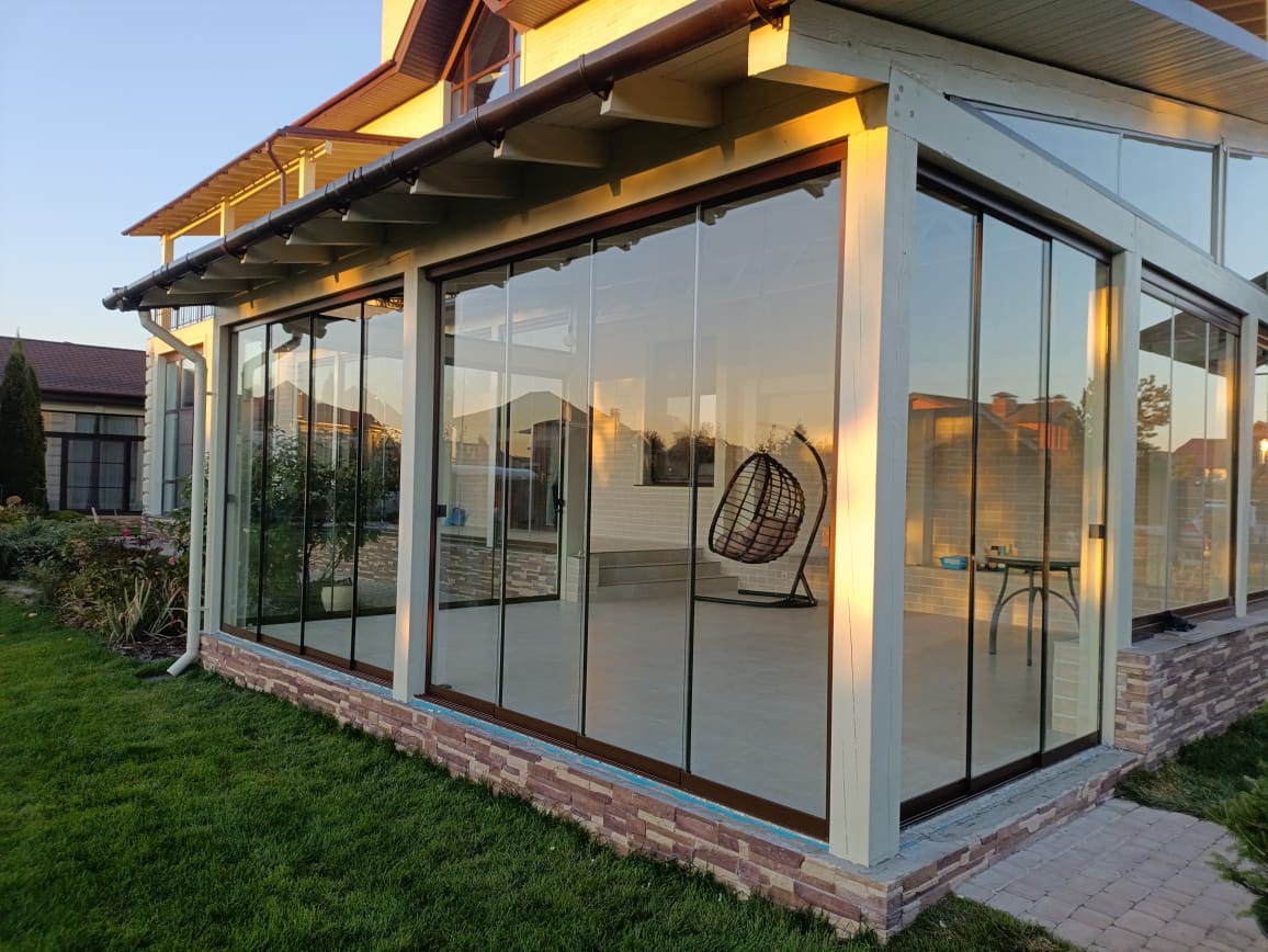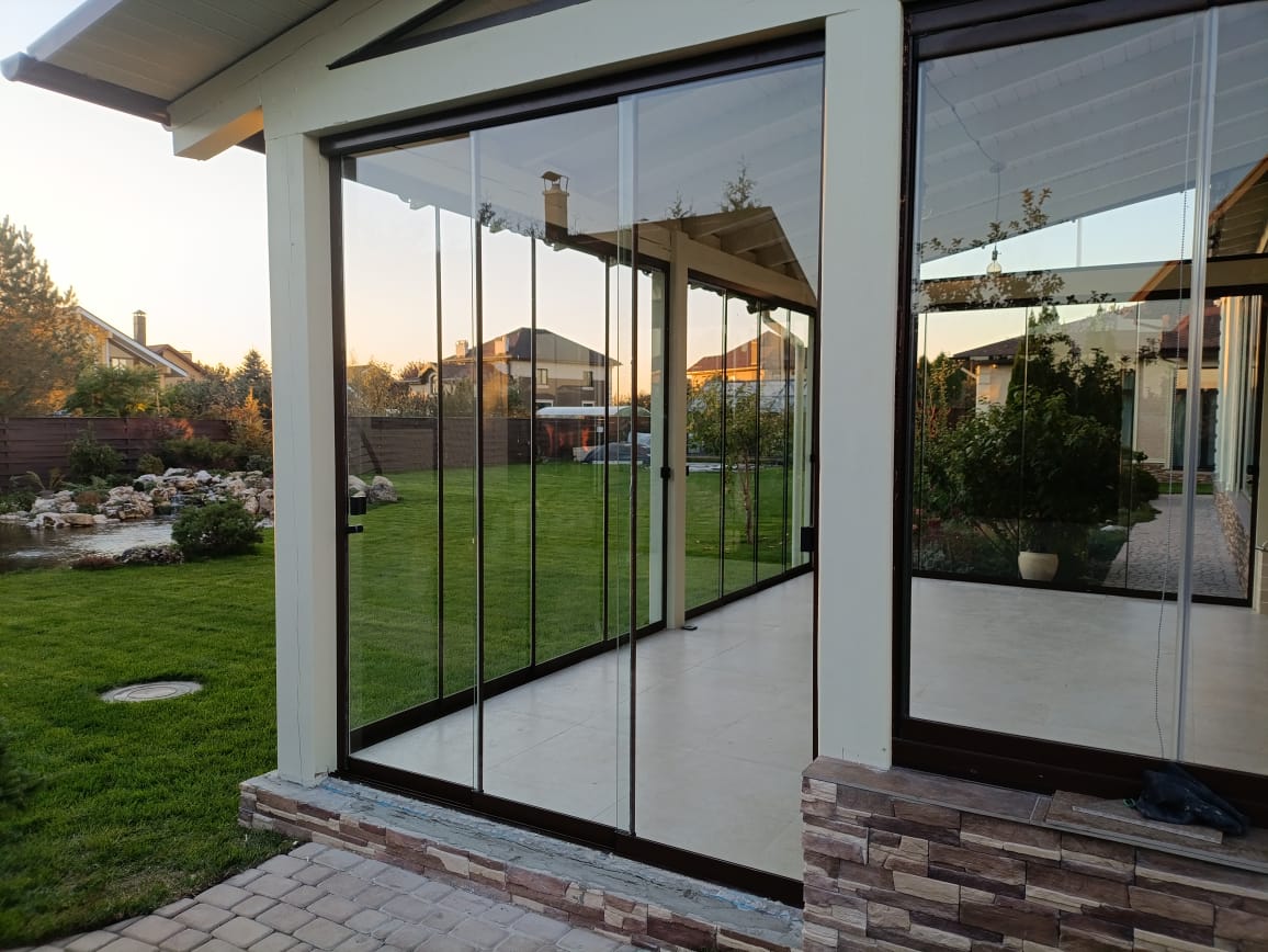 Остекление террасы от пола до потолка раздвижной слайд конструкцией