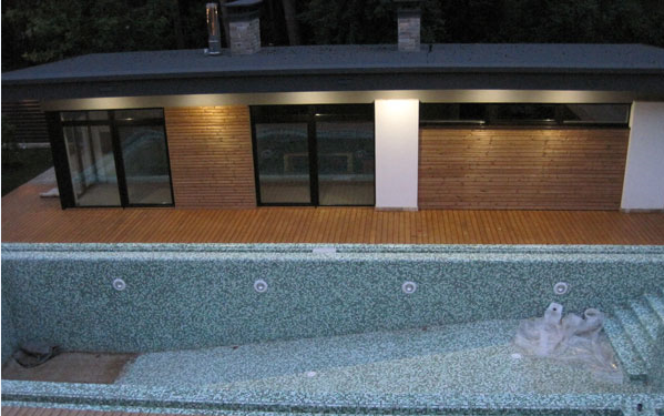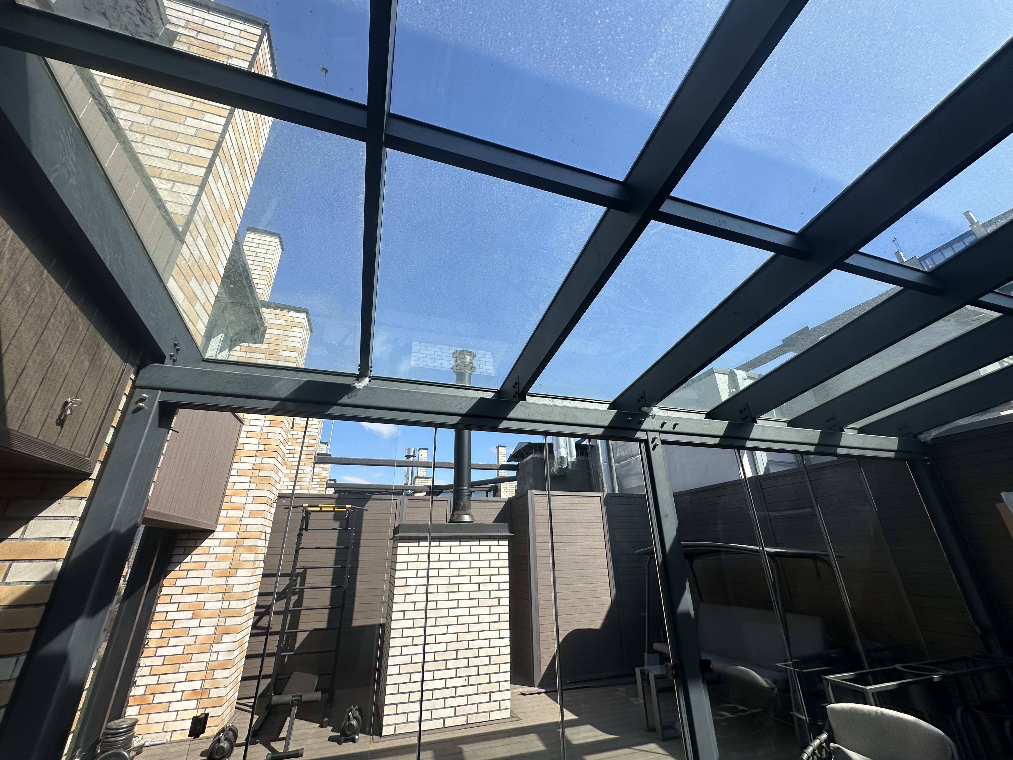 Выполнено строительство стеклянной террасы с применением системы безрамного остекления. Основа конструкции — прочный алюминиевый каркас с панорамными раздвижными створками из закалённого стекла.
