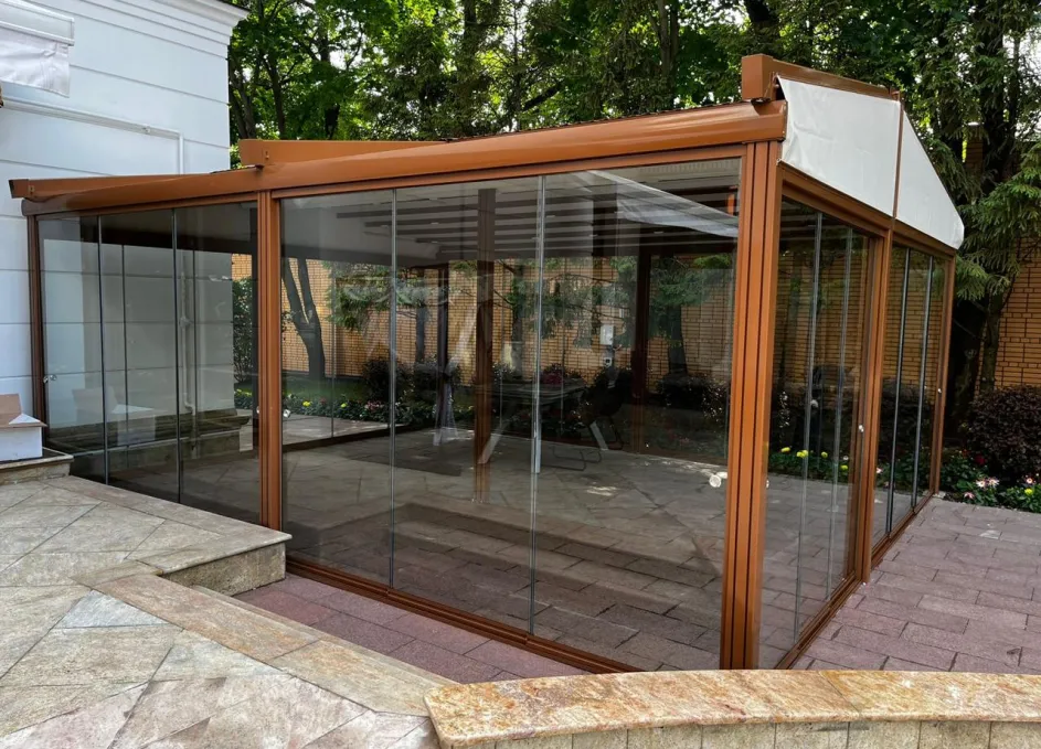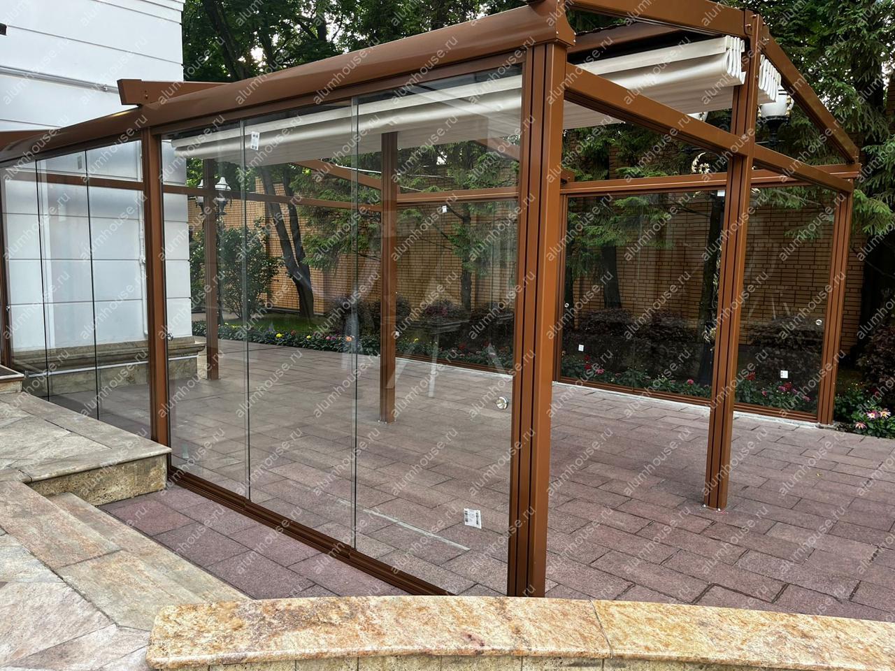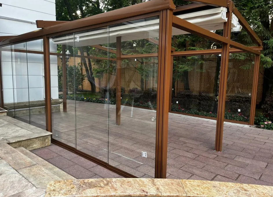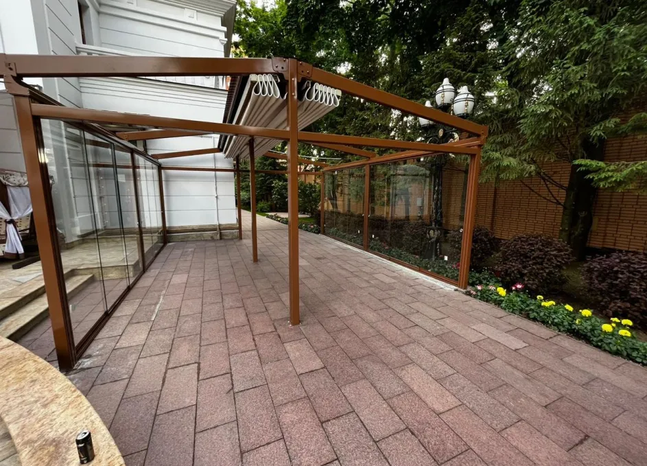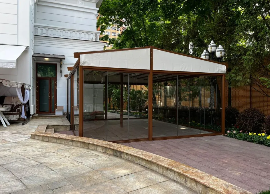- Проектирование. Разработан детальный индивидуальный проект с учётом особенностей эксплуатации и предпочтений заказчика, выбран тип и конфигурация системы остекления и тентовой перголы.