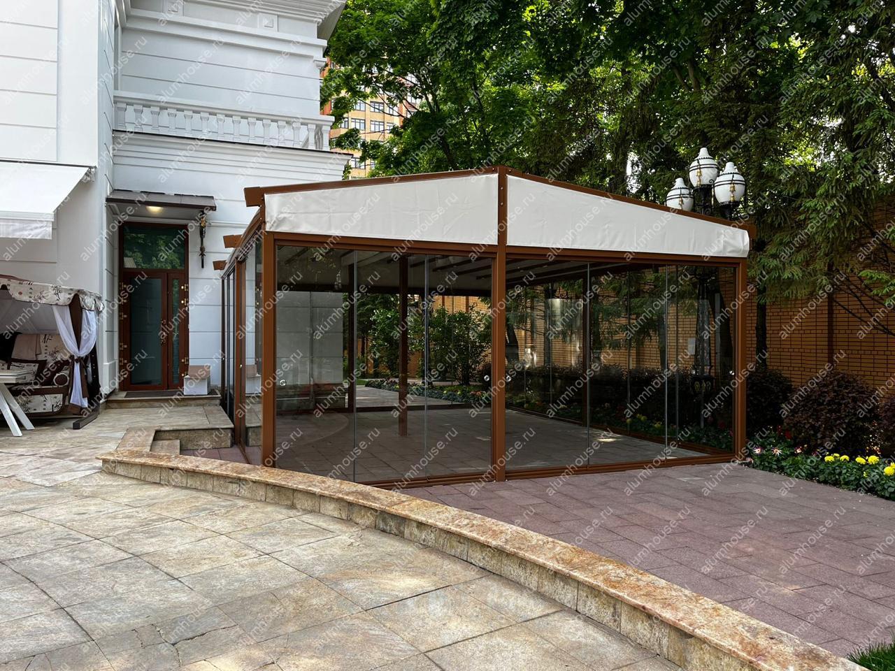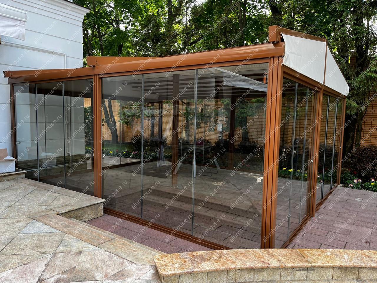 Выполнен комплекс работ по строительству отдельно стоящей тентовой перголы с безрамным остеклением площадью 43 м². В проекте использовались современные решения: отдельно стоящая алюминиевая пергола с тентом Everest Duo от производителя Markiza и система безрамного остекления "Слайдер" Joy Vision.