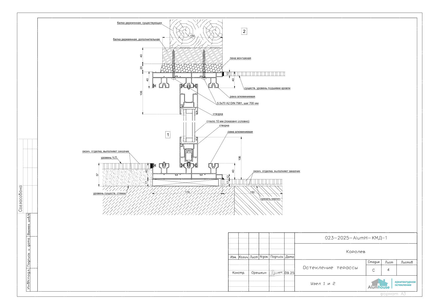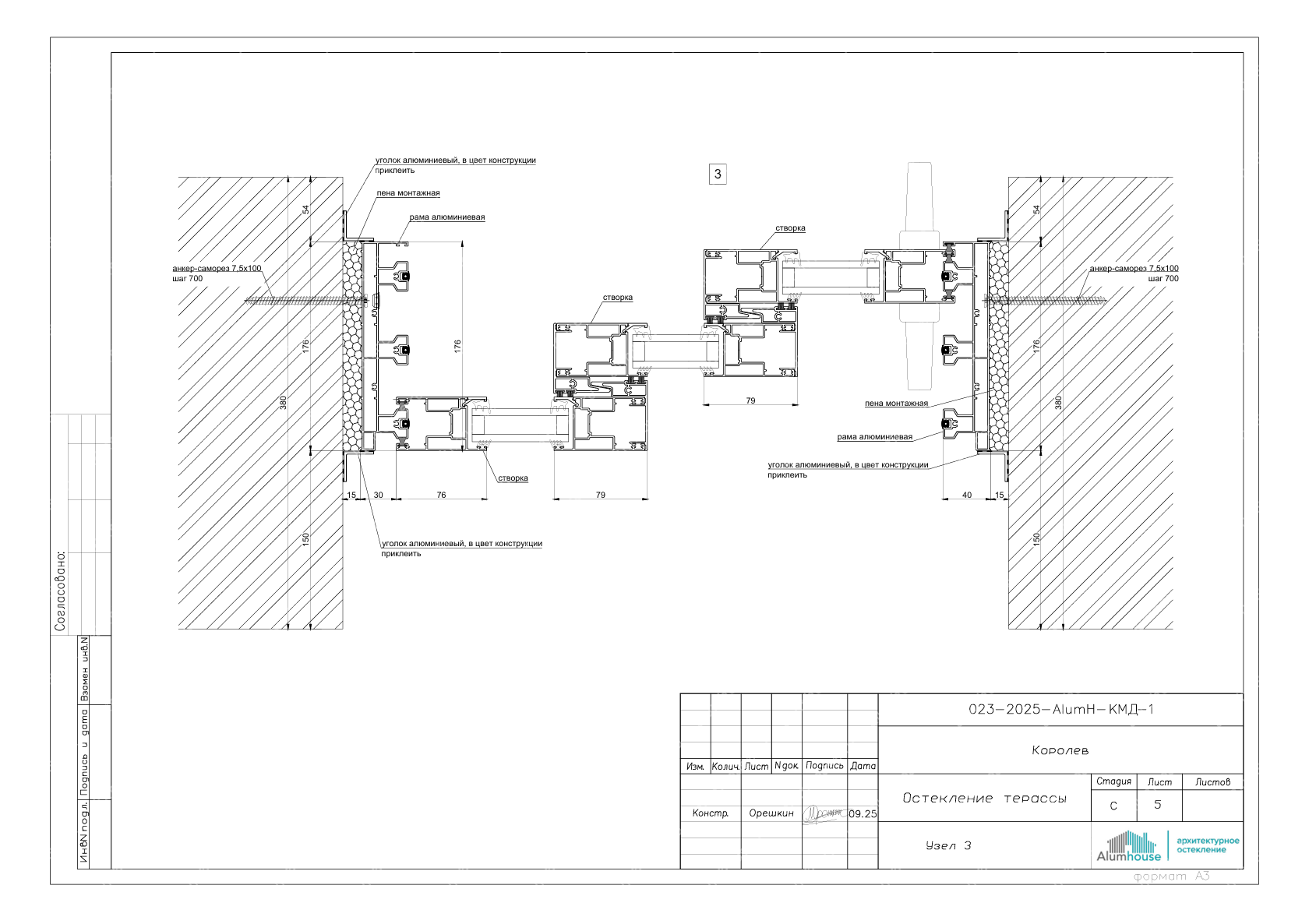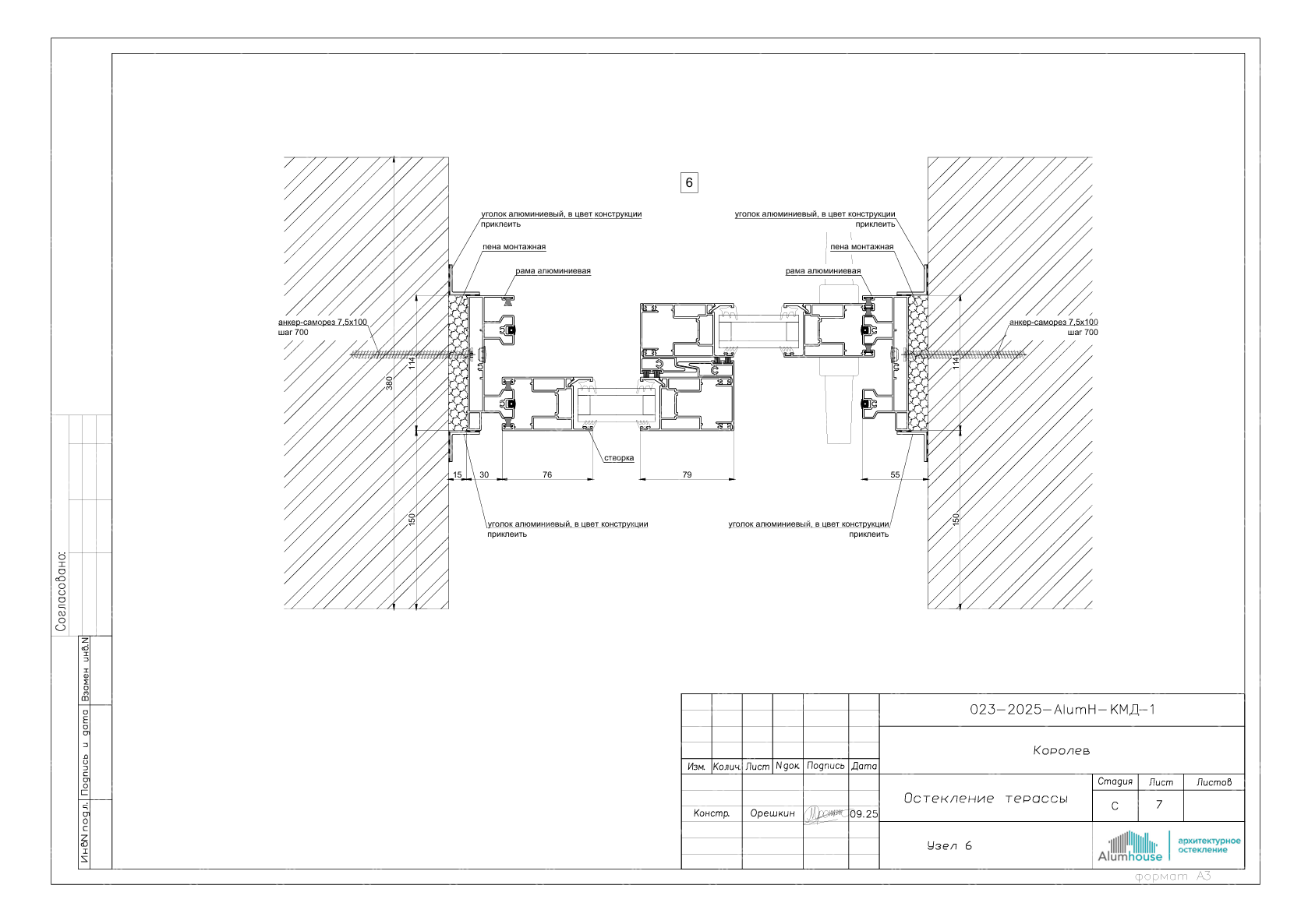На чертежах предоставлены узлы примыканий к полу с низким порогом, к стенам и перекрытиям, а также решения центрального стыка с “узким” импостом. Приведены разрезы по направляющим и створкам с указанием толщин стеклопакетов, глубин рам и типов уплотнений, включая щеточные и EPDM‑контур. Включены карты раскроя, схемы крепления, таблицы дренажных отверстий и рекомендации по компенсационным зазорам и герметизации.