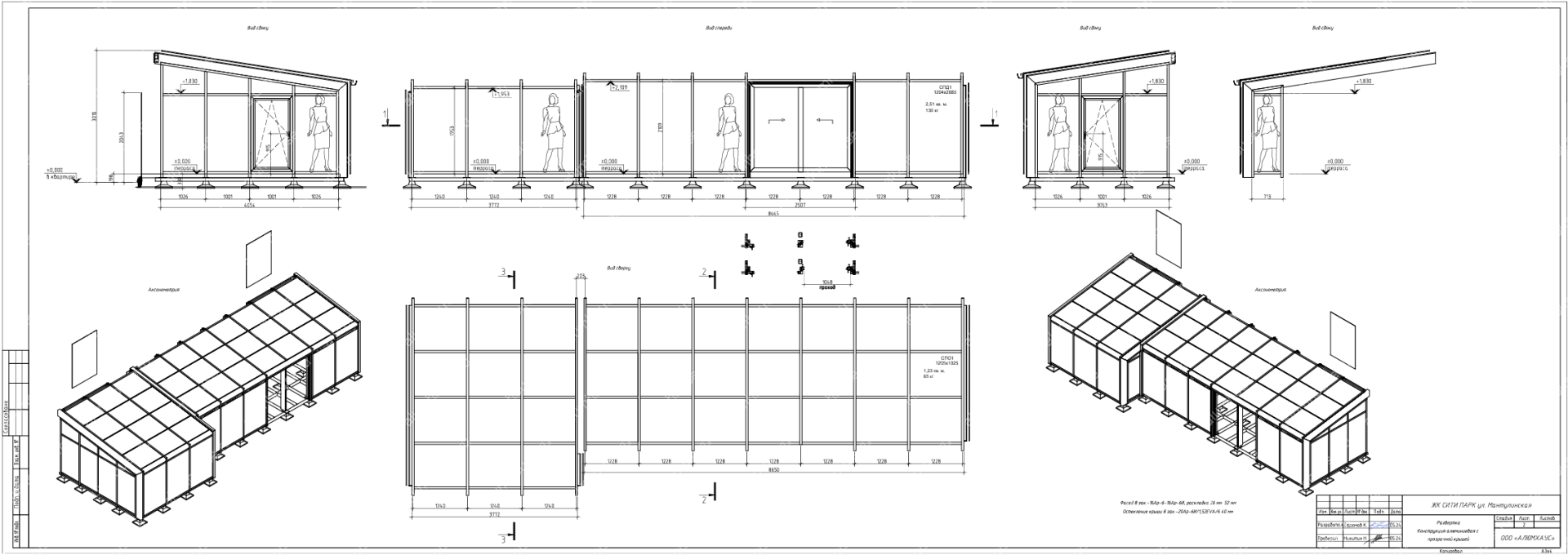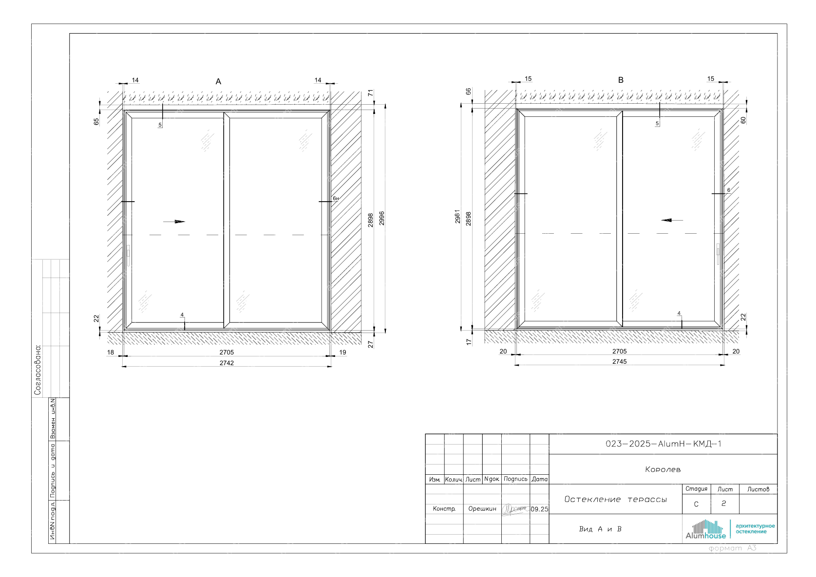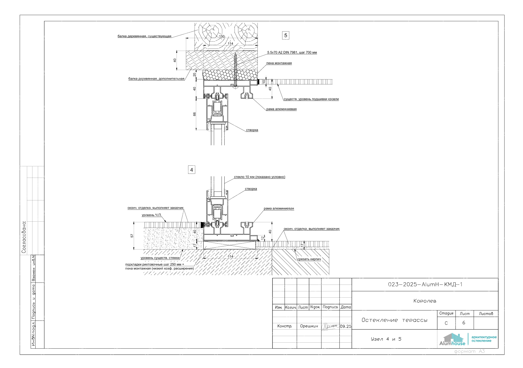 На чертежах предоставлены узлы примыканий к полу с низким порогом, к стенам и перекрытиям, а также решения центрального стыка с “узким” импостом. Приведены разрезы по направляющим и створкам с указанием толщин стеклопакетов, глубин рам и типов уплотнений, включая щеточные и EPDM‑контур. Включены карты раскроя, схемы крепления, таблицы дренажных отверстий и рекомендации по компенсационным зазорам и герметизации.