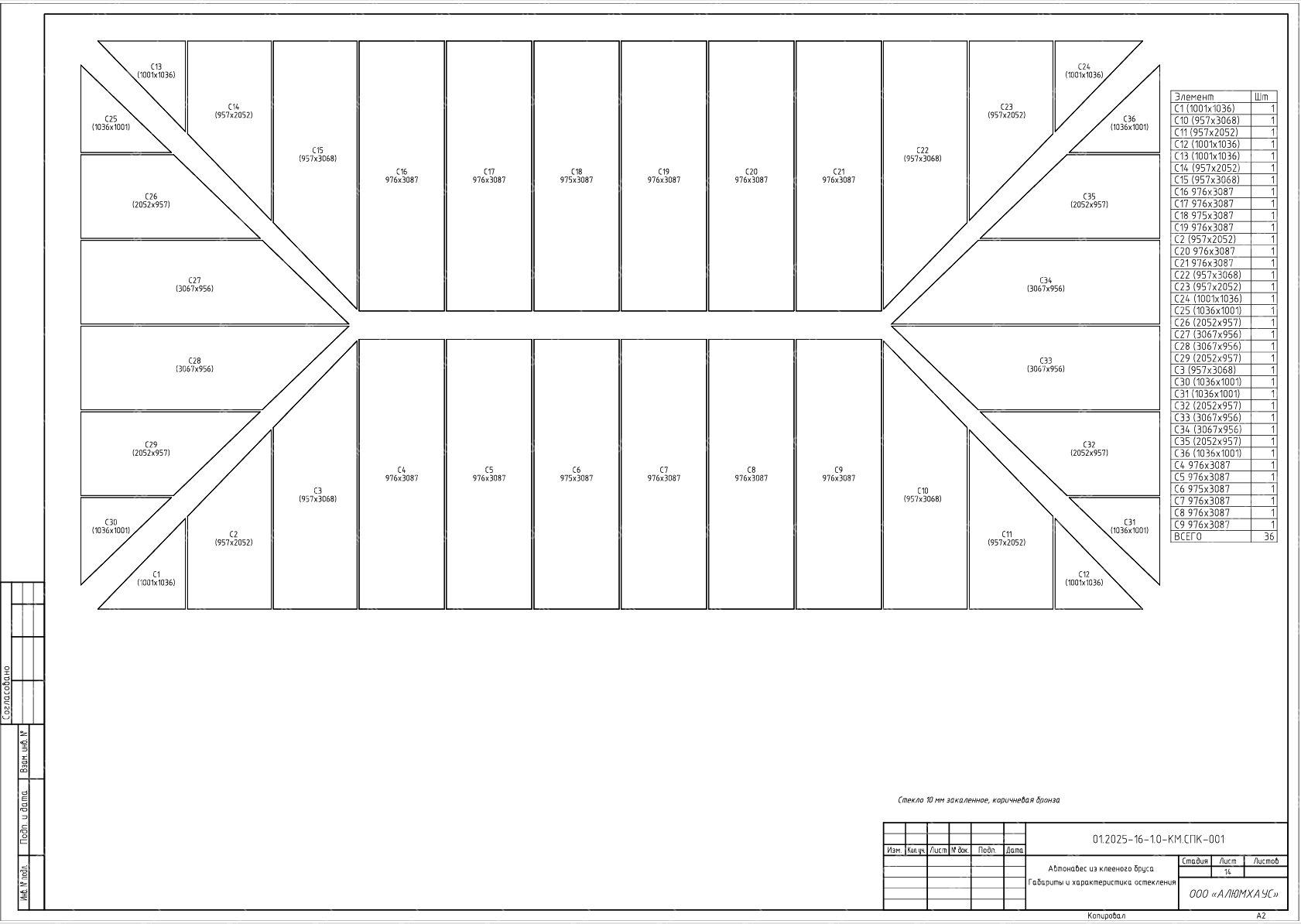 На чертежах представлены план кровли с нумерацией карт остекления, развертки по осям и спецификация стекла с указанием формата, толщины и типа обработки. Детально проработаны узлы примыканий к деревянным рёбрам, решения конька и карнизной линии, а также схемы водоотвода и контуры герметизации швов. Даны разрезы по опорным и промежуточным точкам крепления, включая допуски, шаблоны раскроя и требования к сверлению/анкеровке, исключающие ослабление древесины.