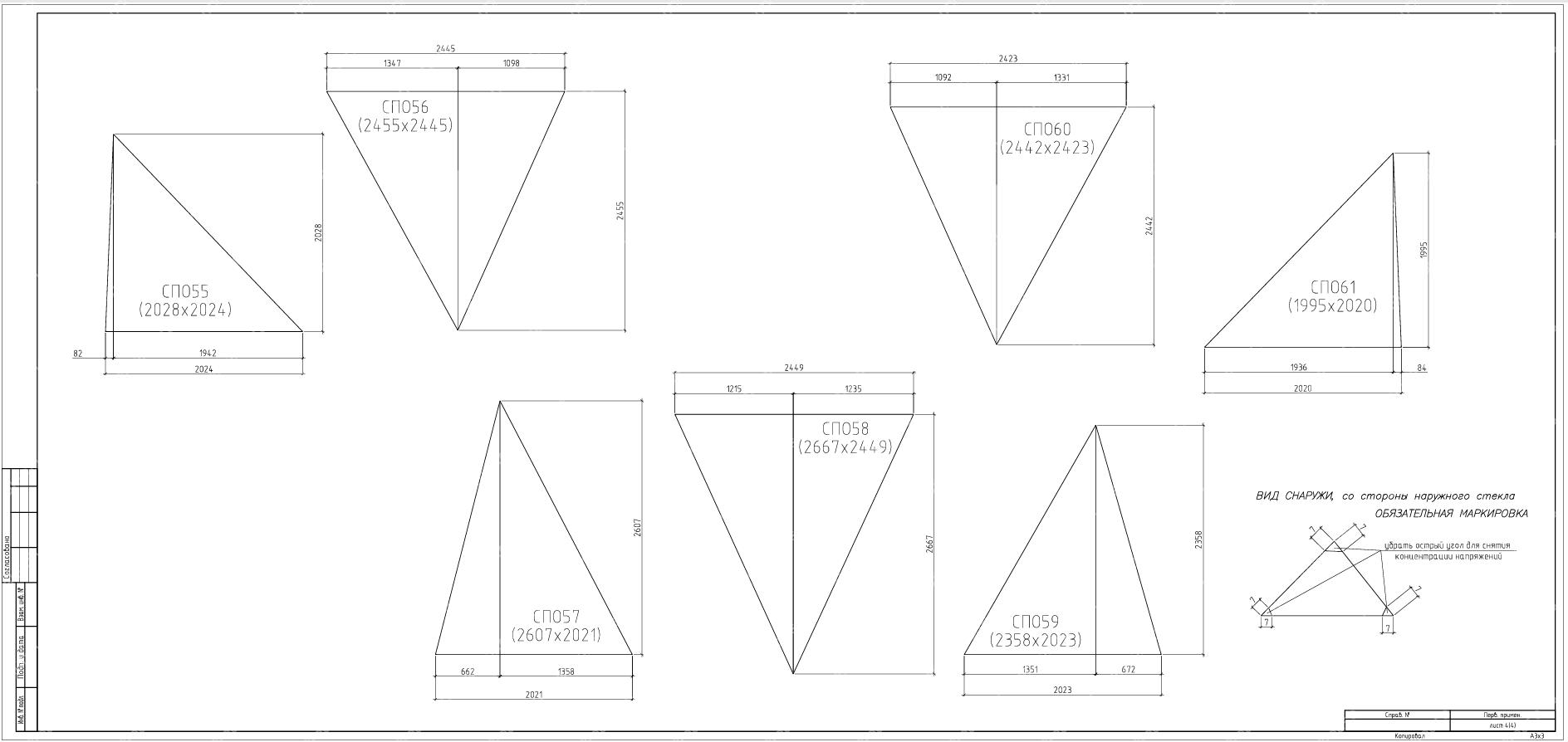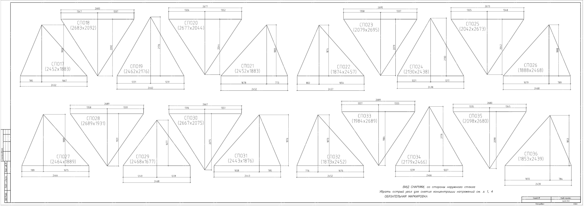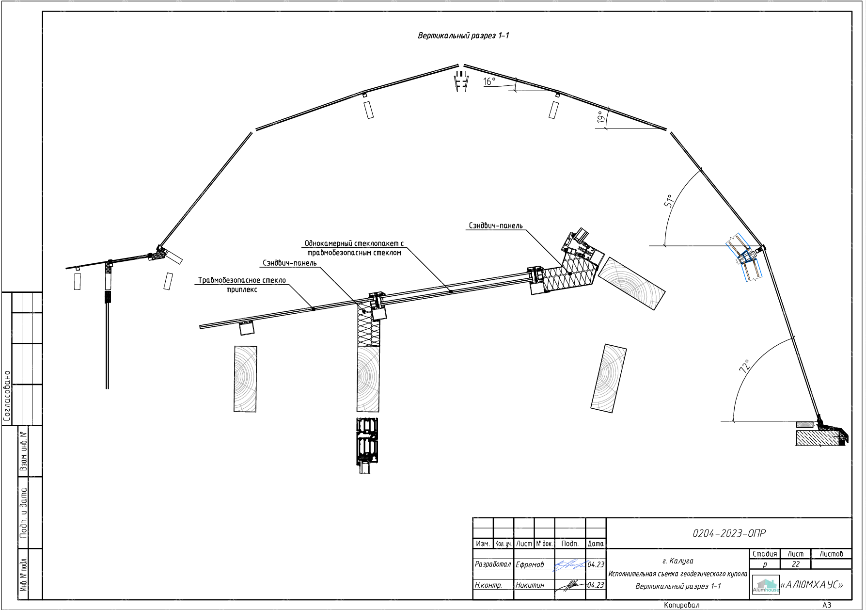 На данных чертежах показано остекления геодезического купола по готовому каркасу из клееного бруса и описывается инженерная проработка панелей остекления для триангулярной оболочки купола, уже смонтированной из клееного бруса. В составе проекта предусмотрены схемы раскроя стеклопакетов/триплекса по треугольным и многоугольным ячейкам, спецификация крепёжных узлов и требования к примыканиям к деревянным ребрам. Документация учитывает особенности геодезического купола как распорной системы и задаёт допуски, шаг герметизации и ветро‑снеговые нагрузки для безопасной эксплуатации.